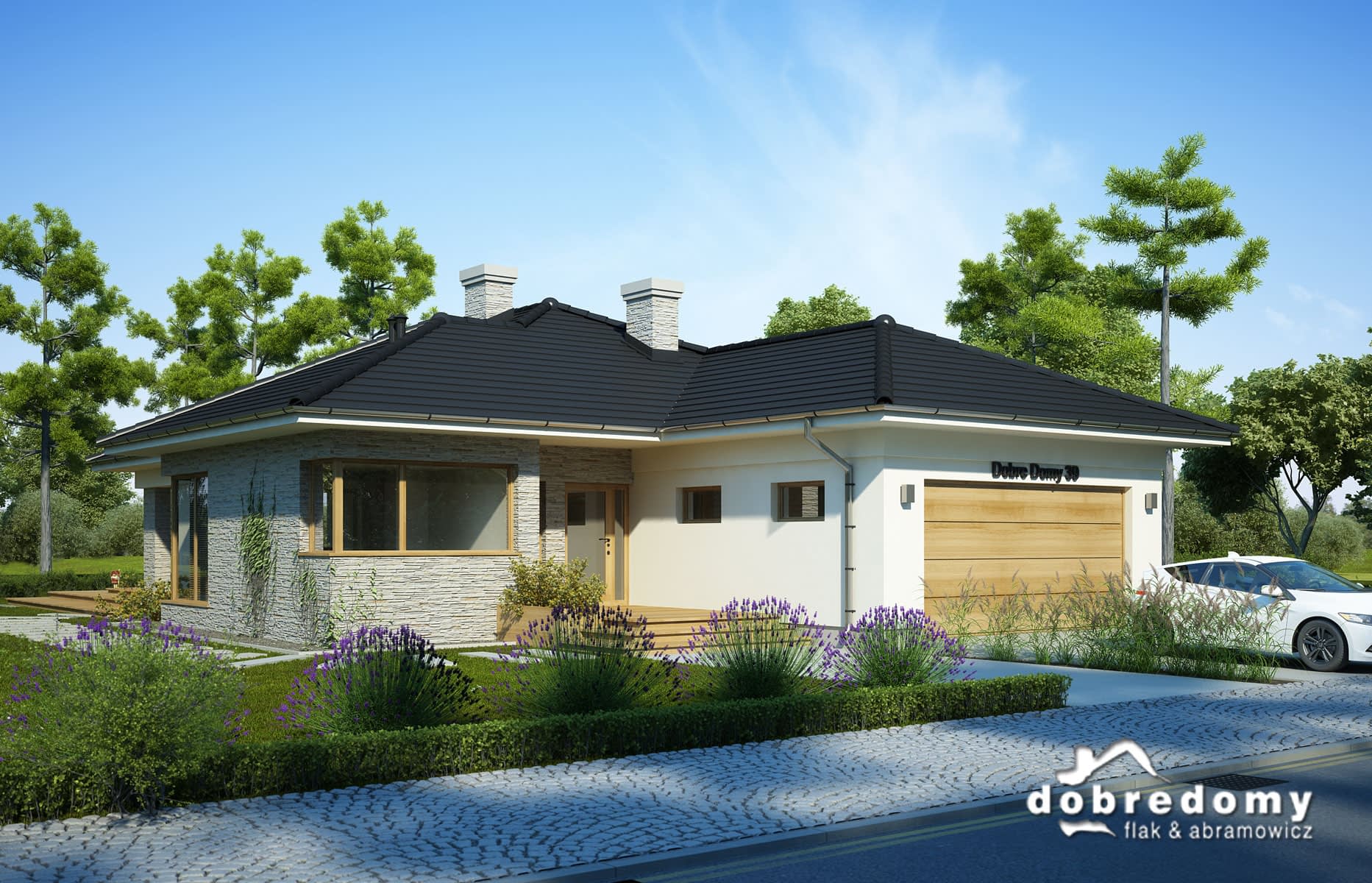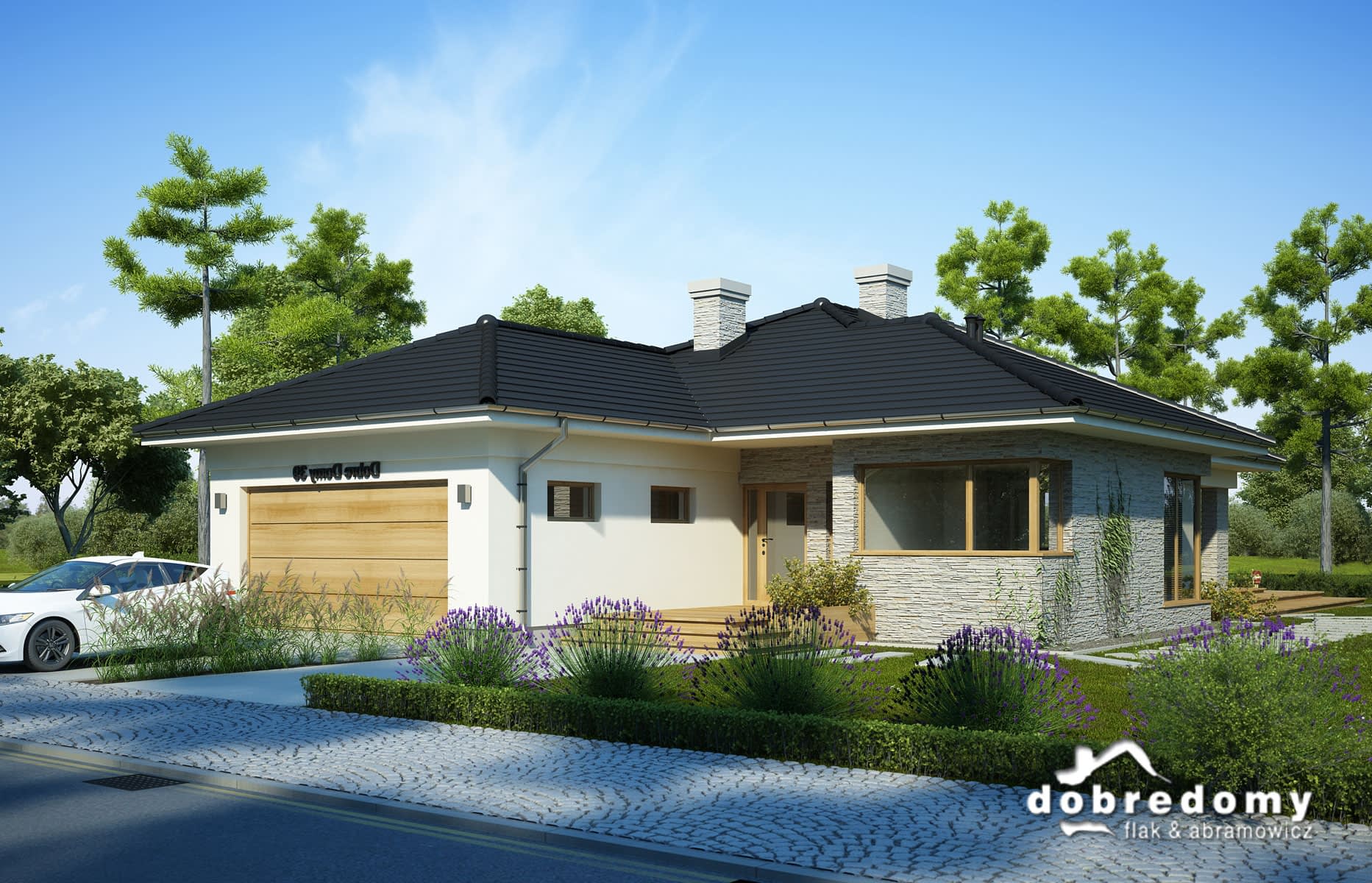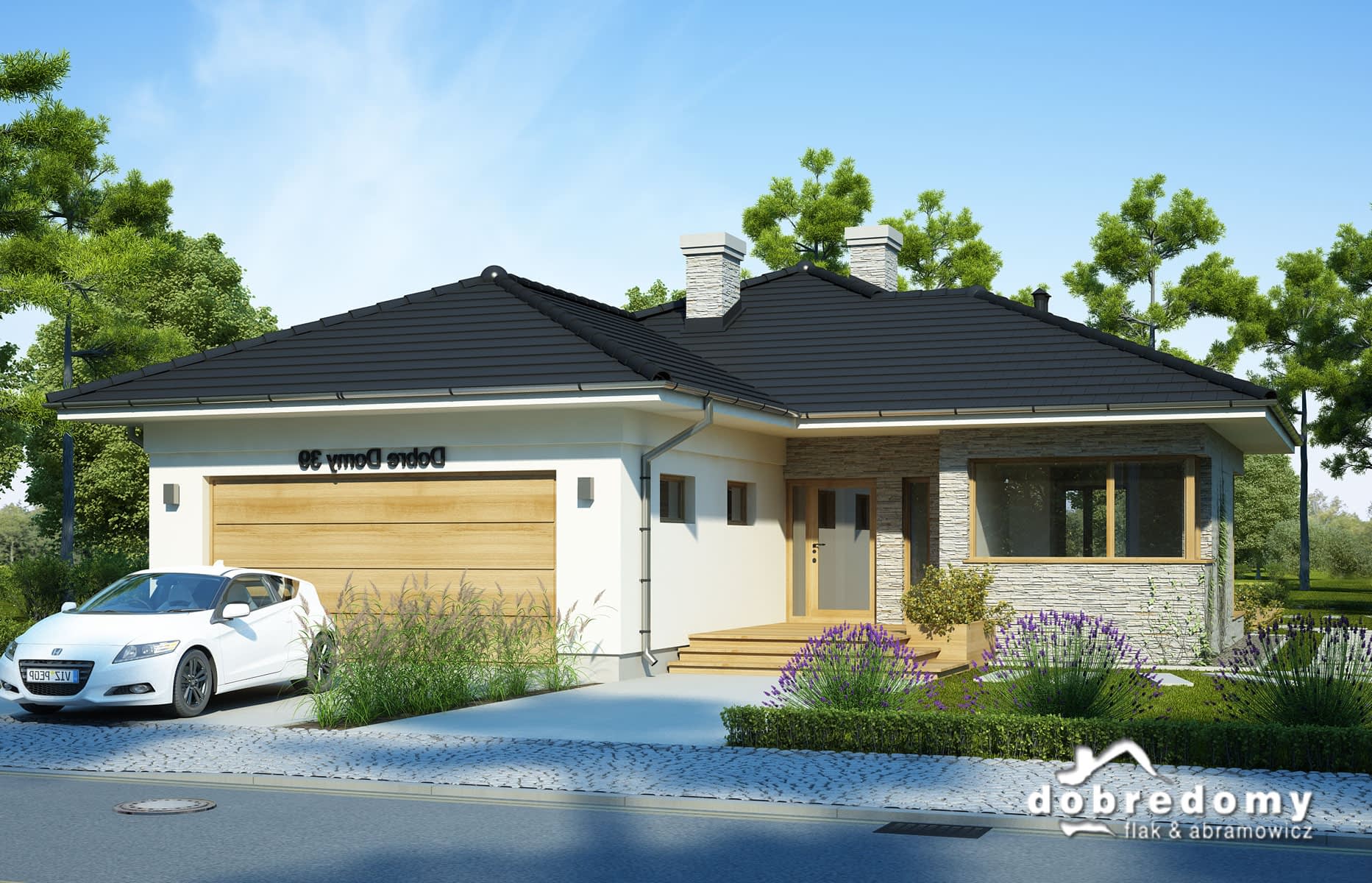Elewacje pokryte tynkiem strukturalnym w systemie ociepleń Termo Organika oraz okładziną kamienną. Pokrycie dachu - dachówka ceramiczna lub cementowa CREATON.