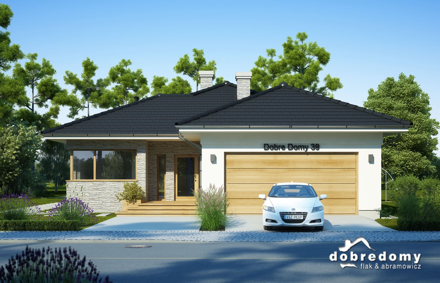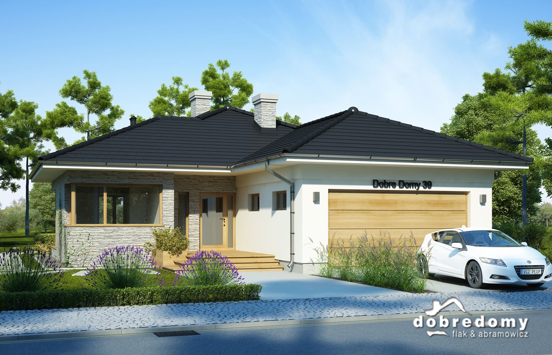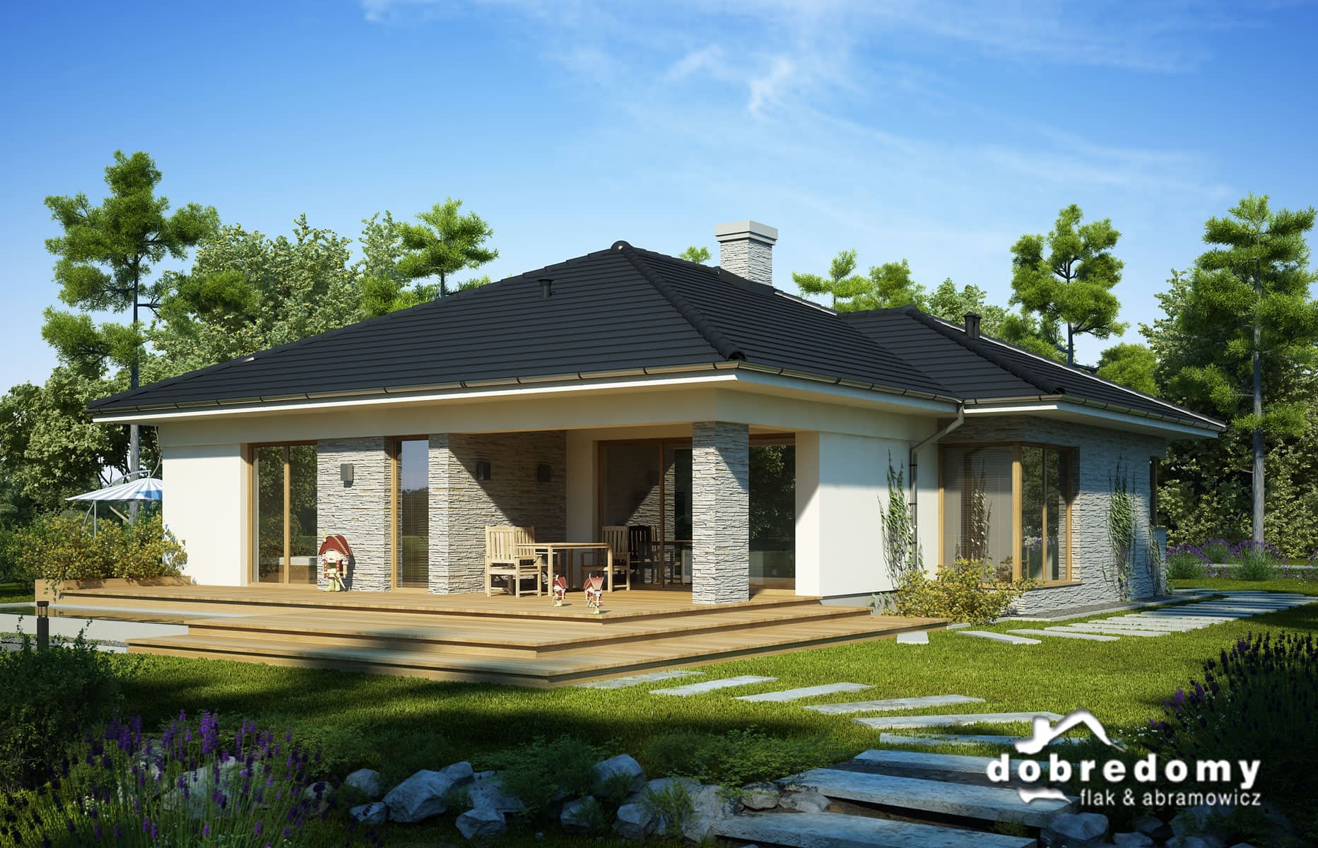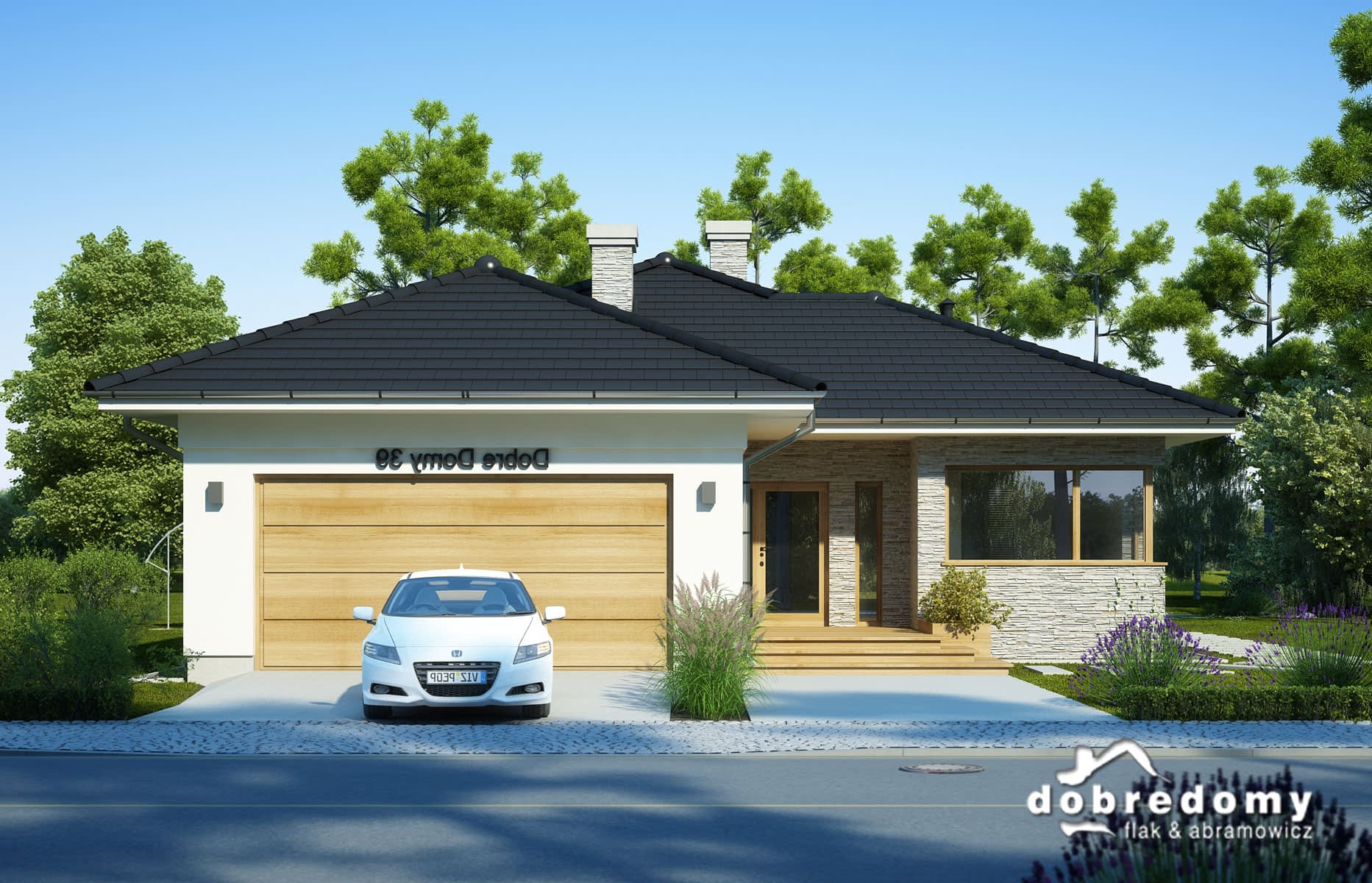 Elewacje pokryte tynkiem strukturalnym w systemie ociepleń Termo Organika oraz okładziną kamienną. Pokrycie dachu - dachówka ceramiczna lub cementowa CREATON.