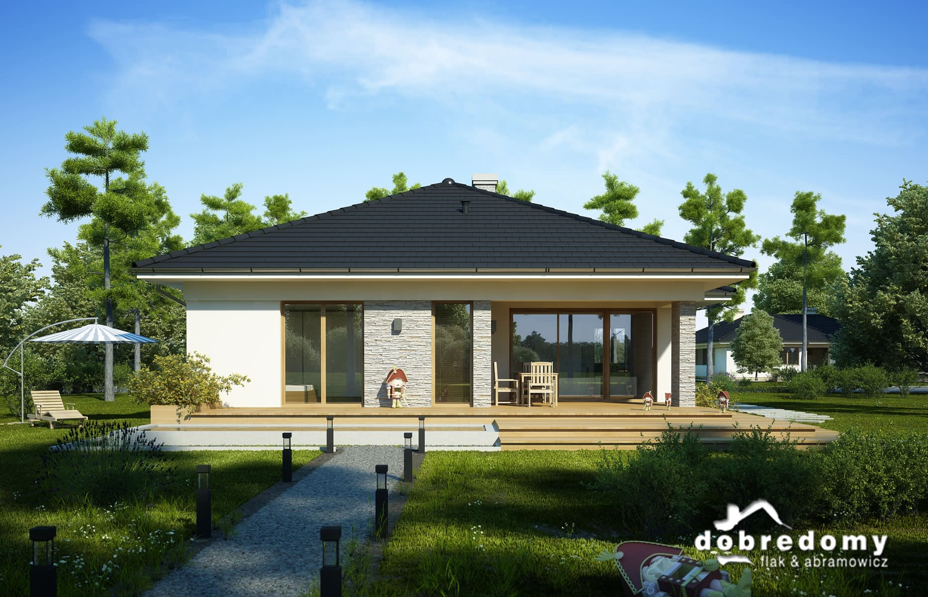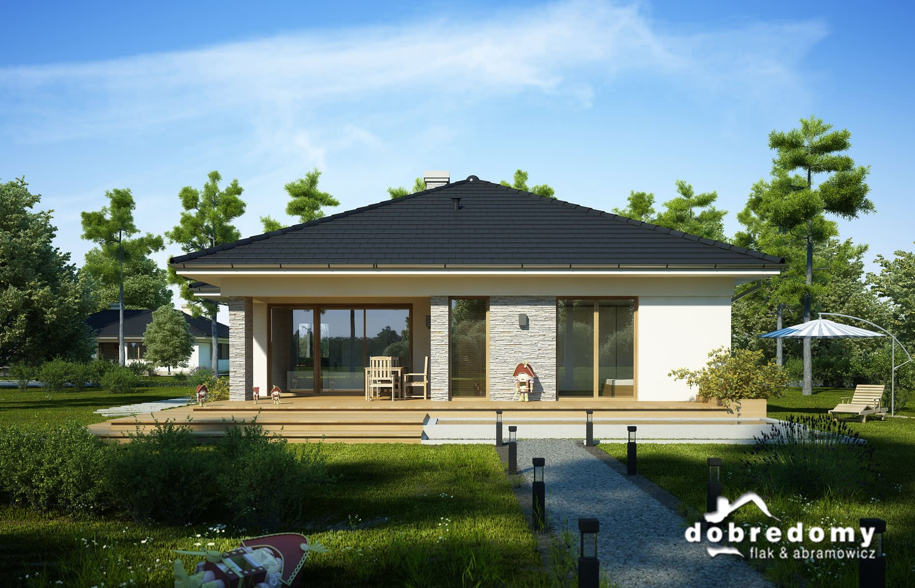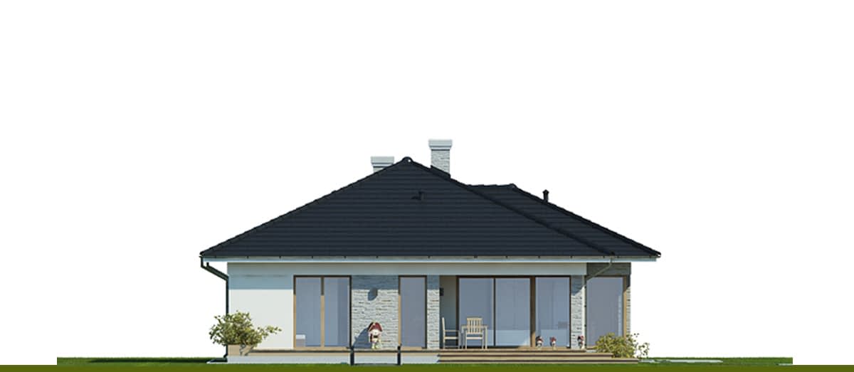 Projekt domu jednorodzinnego, parterowego, dla 4-5-osobowej rodziny. Część dzienna obejmuje pokój dzienny, dużą jadalnię oraz sporą kuchnię ze spiżarnią. Tuz przy wiatrołapie zaprojektowano wygodną garderobę. W hallu znajduje się osobne wc. Strefa nocna domu to trzy sypialnie (jedna z własną łazienką), ogólnodostępna łazienka oraz pralnia. W części gospodarczej znajduje się kotłownia oraz dwustanowiskowy garaż. Projekt dostępny w wersji z innym układem pomieszczeń - Miriam III oraz w wersji z większą powierzchnią użytkową - Miriam II oraz Miriam IV (cztery sypialnie).