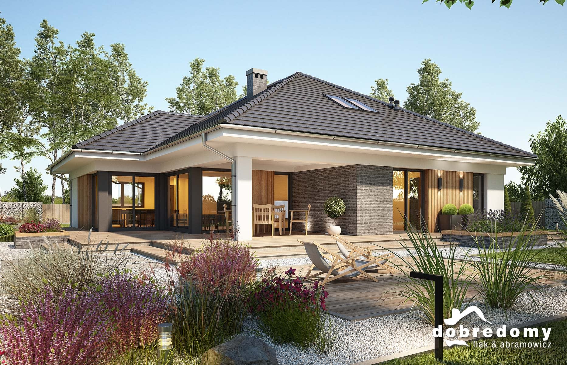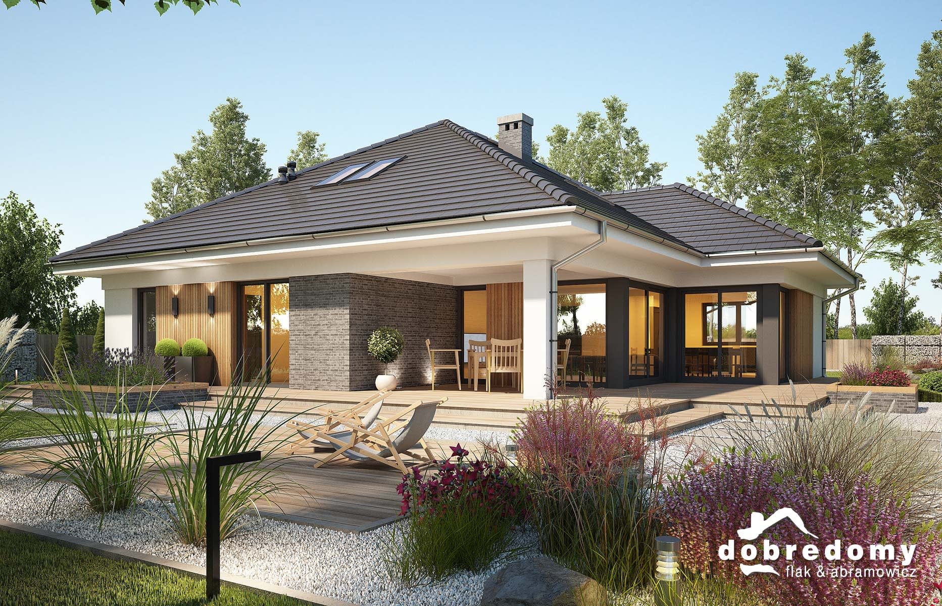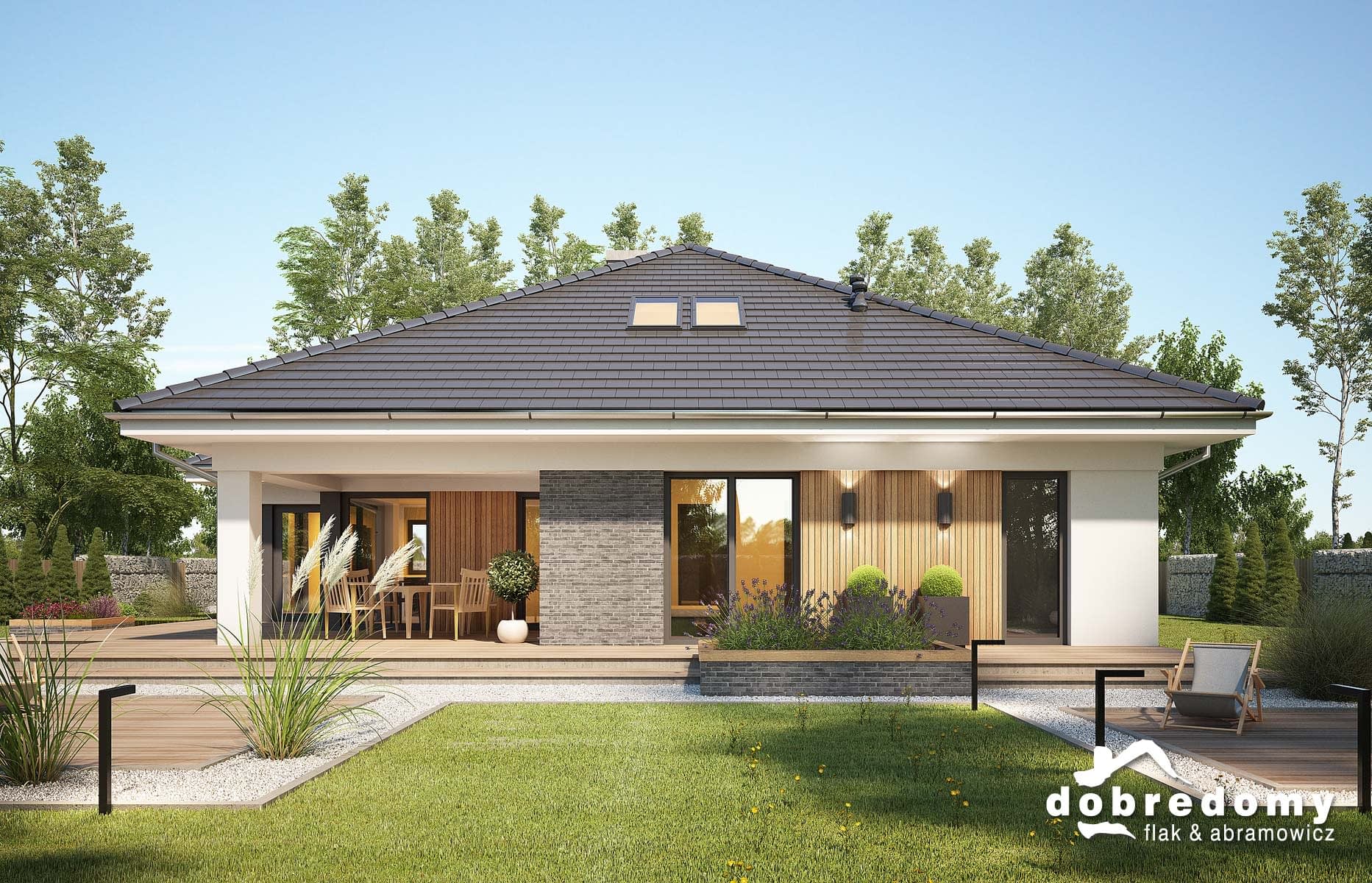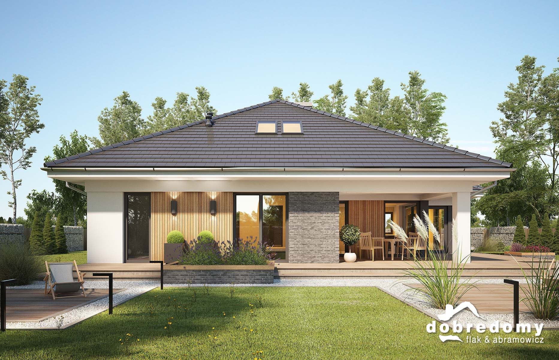 Elewacje pokryte tynkiem strukturalnym w systemie ociepleń Termo Organika oraz okładziną klinkierową oraz drewnianą. Pokrycie dachu - dachówka ceramiczna lub cementowa CREATON.