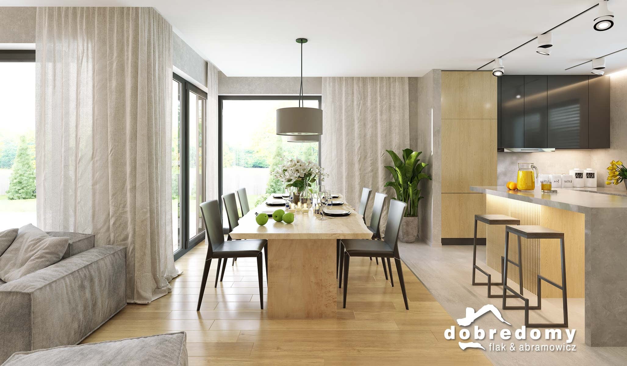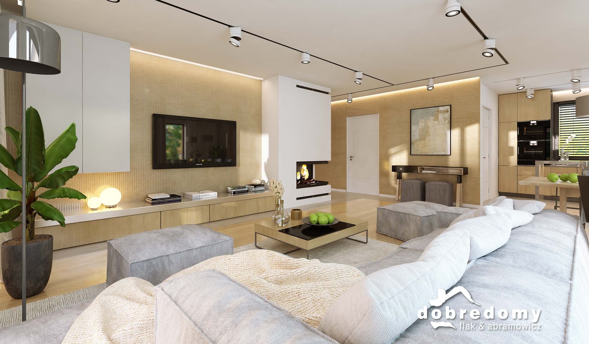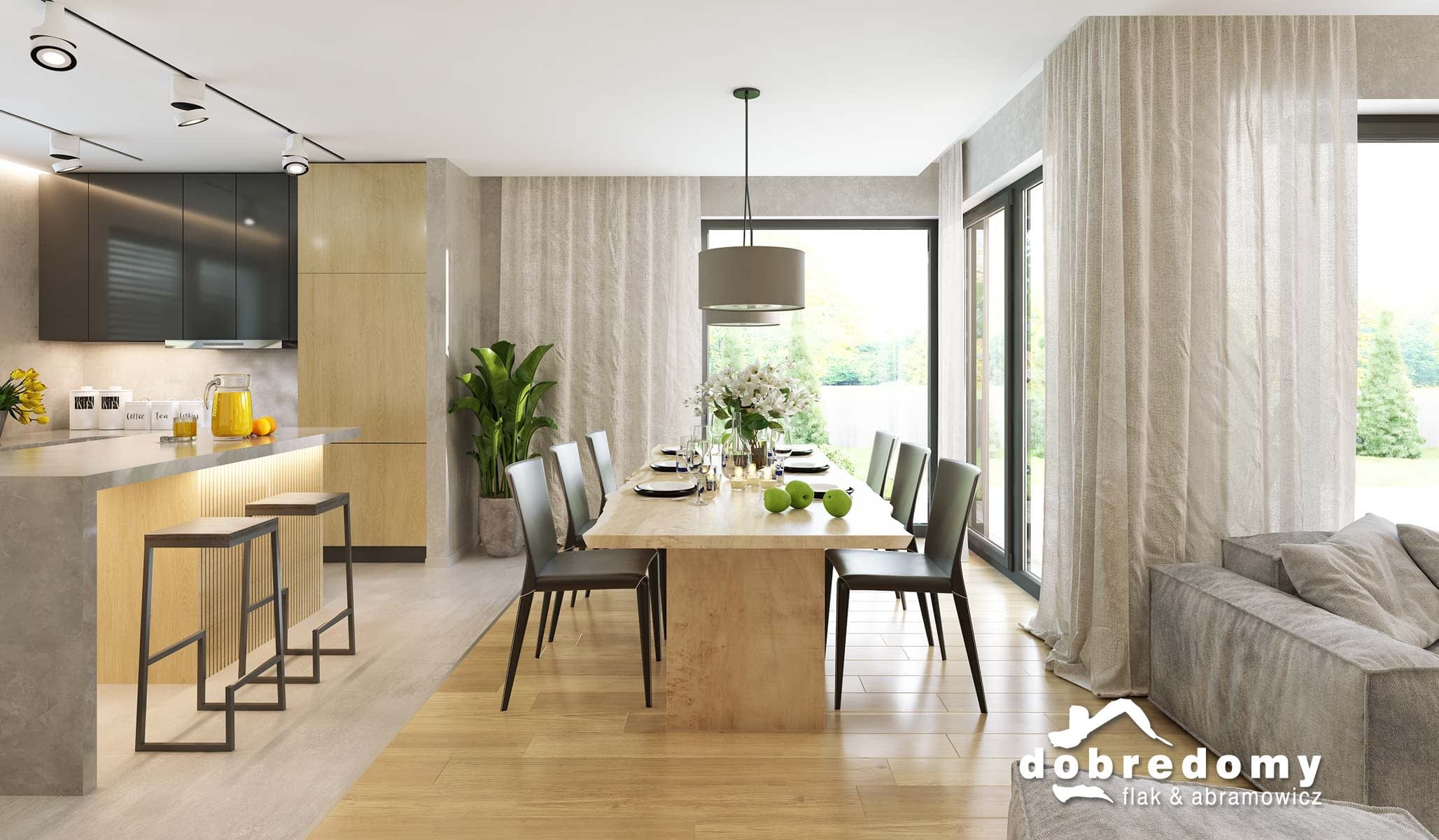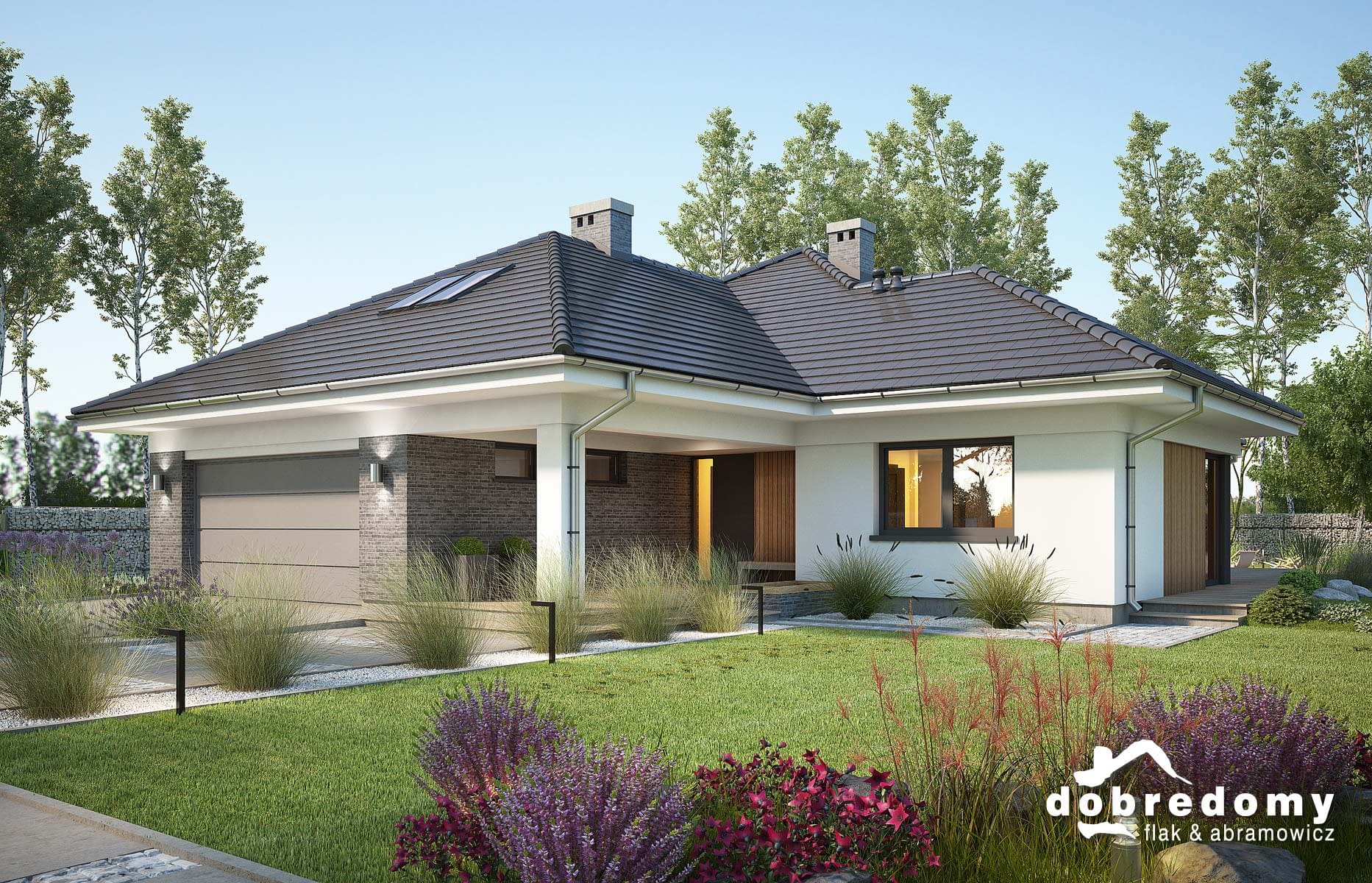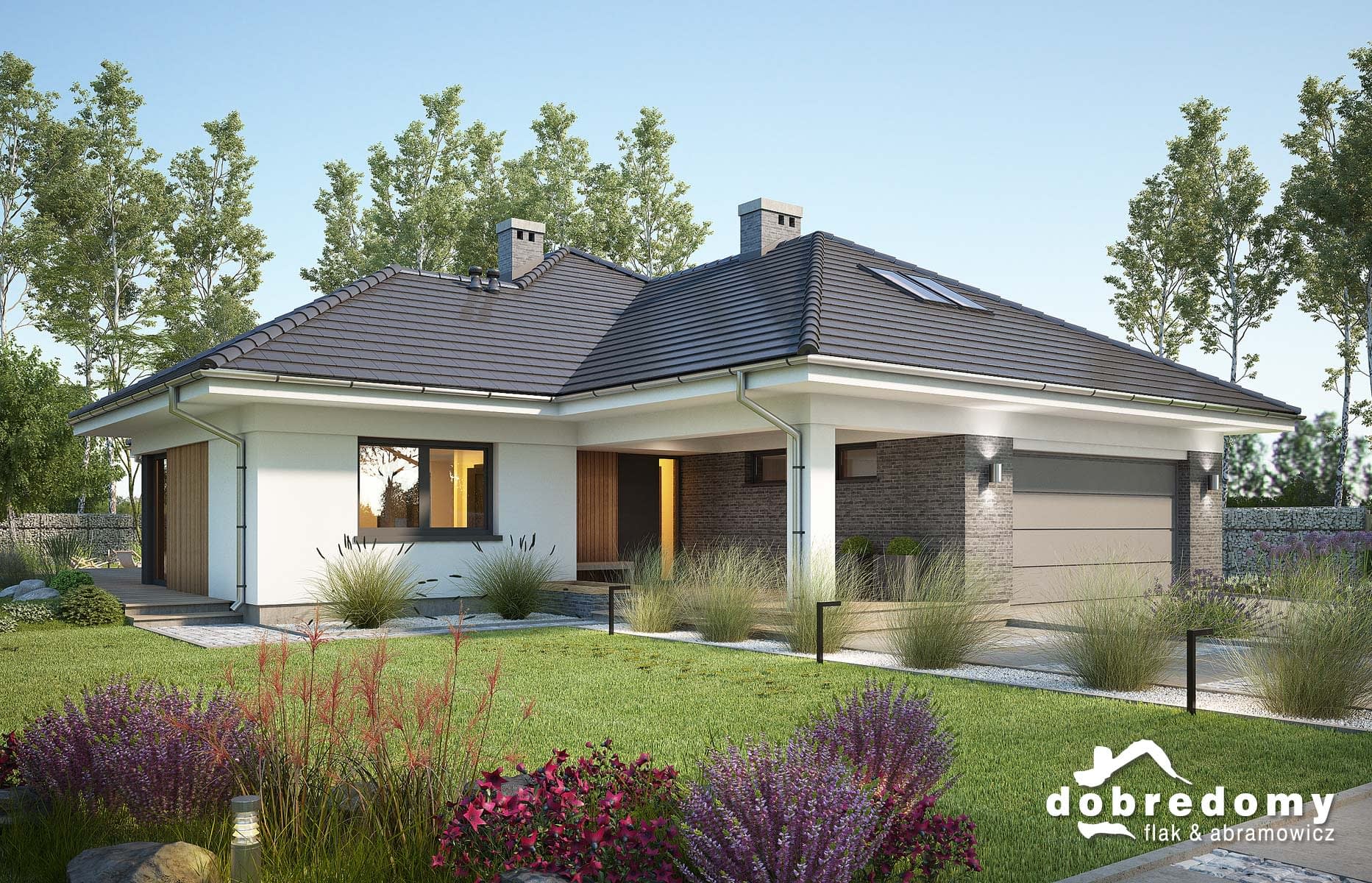 Elewacje pokryte tynkiem strukturalnym w systemie ociepleń Termo Organika oraz okładziną klinkierową oraz drewnianą. Pokrycie dachu - dachówka ceramiczna lub cementowa CREATON.