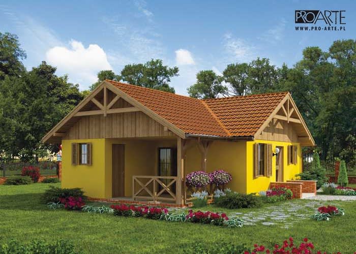 Modena to prześliczny domek letniskowy, który sprawi, że będziesz za nim tęsknić zaraz po tym jak skończy się urlop! Deskowany szczyt oraz drewniane wykończenia elewacji spowodują, że wyraźnie wyczujesz harmonię między tym uroczym budynkiem a naturą, która go otacza. Nieodparty podziw budzą drewniane okiennice, którymi każdego poranka do wnętrza domku zostaną wpuszczone promyki dopiero co wschodzącego słońca, dzięki którym już od pierwszej chwili dzień stanie się piękniejszy. Jeżeli jesteś otwarty na większą ilość światła, przy równie zachwycających okiennicach, to koniecznie zobacz Malabo! Nie musisz martwić się o stan portfela, ponieważ Modena została zaprojektowana tak, aby jej niewielka powierzchnia dachu, wynikająca z małego kontu jego nachylenia, skupiona była na niskich kosztach. Innymi słowy Modena to domek dla każdego! Wszystkie wygody, którymi dotychczas cieszyłeś się wyłącznie w domu/mieszkaniu zostaną zapewnione, gdyż w budynku znajdują się najpotrzebniejsze pomieszczenia użytku codziennego + dodatkowo garaż. Do tego domek został wyposażony w werandę, na której wspólne wakacyjne posiłki przyniosą nieograniczoną radość, oraz niewielki pomieszczenie gospodarcze.
