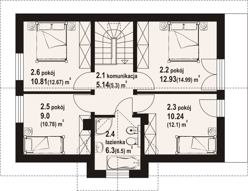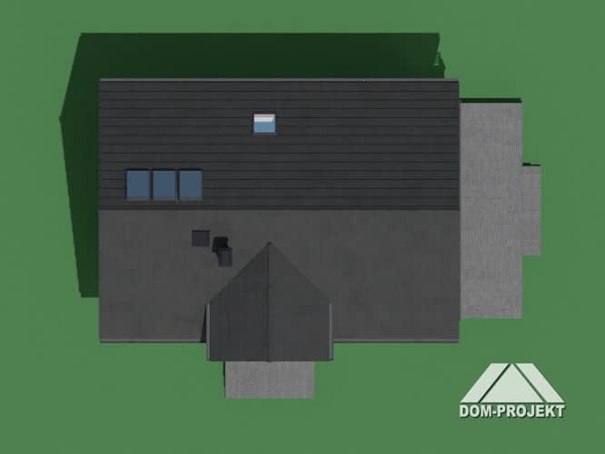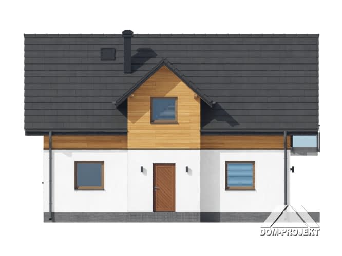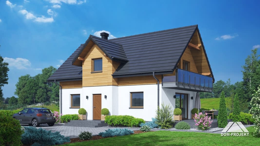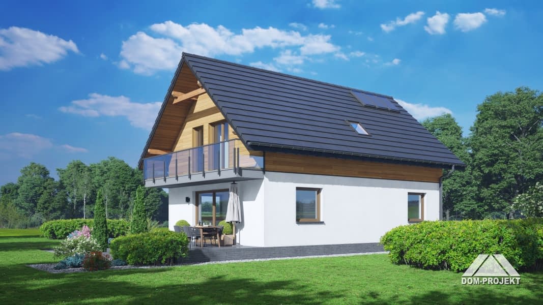 Dom z poddaszem użytkowym. Na parterze salon z aneksem kuchennym oraz wyjściem na taras. Pokój do pracy, łazienka, kotłownia, komunikacja, wiatrołap. Na poddaszu cztery pokoje, komunikacja, łazienka oraz balkon dostępny z dwóch pokoi. Zwarta bryła budynku oraz dach dwuspadowy sprzyjają szybkiej i taniej budowie oraz niskim kosztom eksploatacji.Rzuty