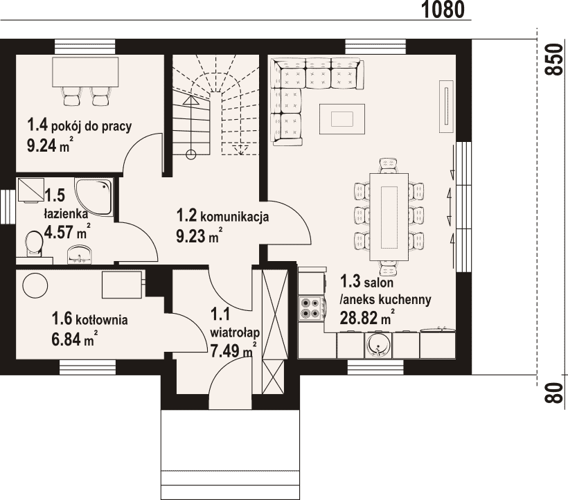 - 1.3 - salon z aneksem kuchennym28.82 m²