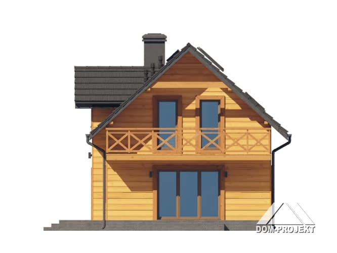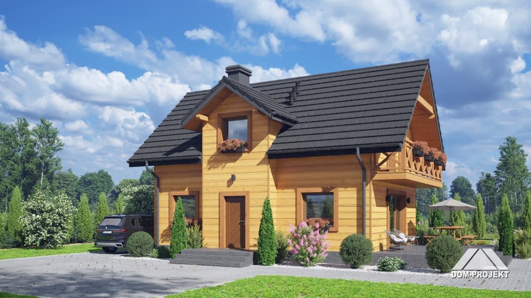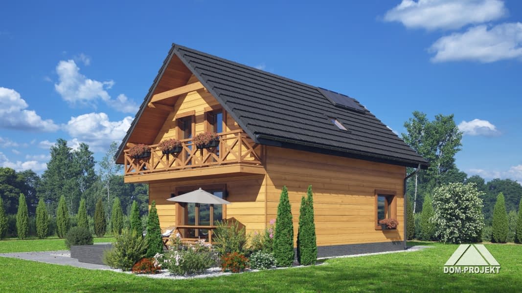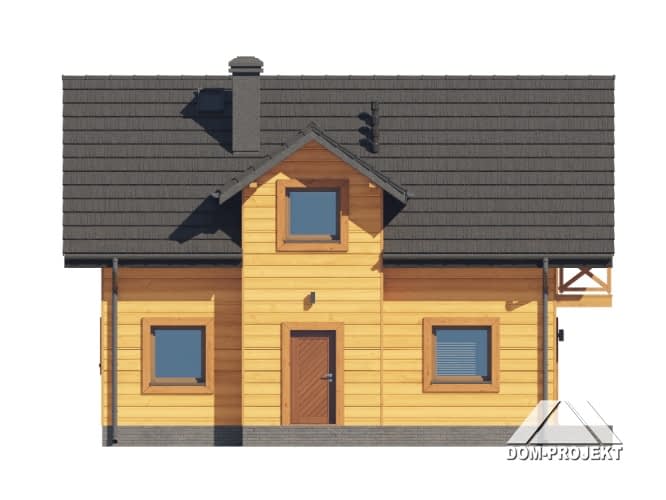 Dom w konstrukcji szkieletu drewnianego. Na parterze salon z aneksem kuchennym, wyjściem na taras i schodami na poddasze. Pokój do pracy, wc, kotłownia, wiatrołap. Na poddaszu trzy pokoje, łazienka, komunikacja oraz balkon. Zwarta bryła budynku oraz dach dwuspadowy sprzyjają szybkiej i taniej budowie oraz niskim kosztom eksploatacji.Rzuty