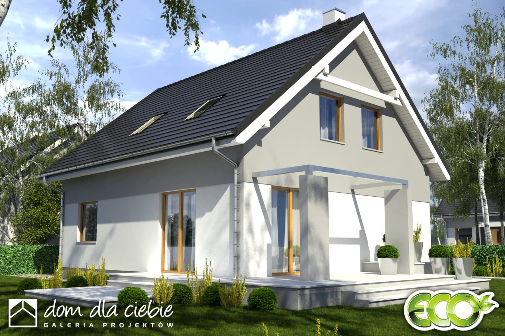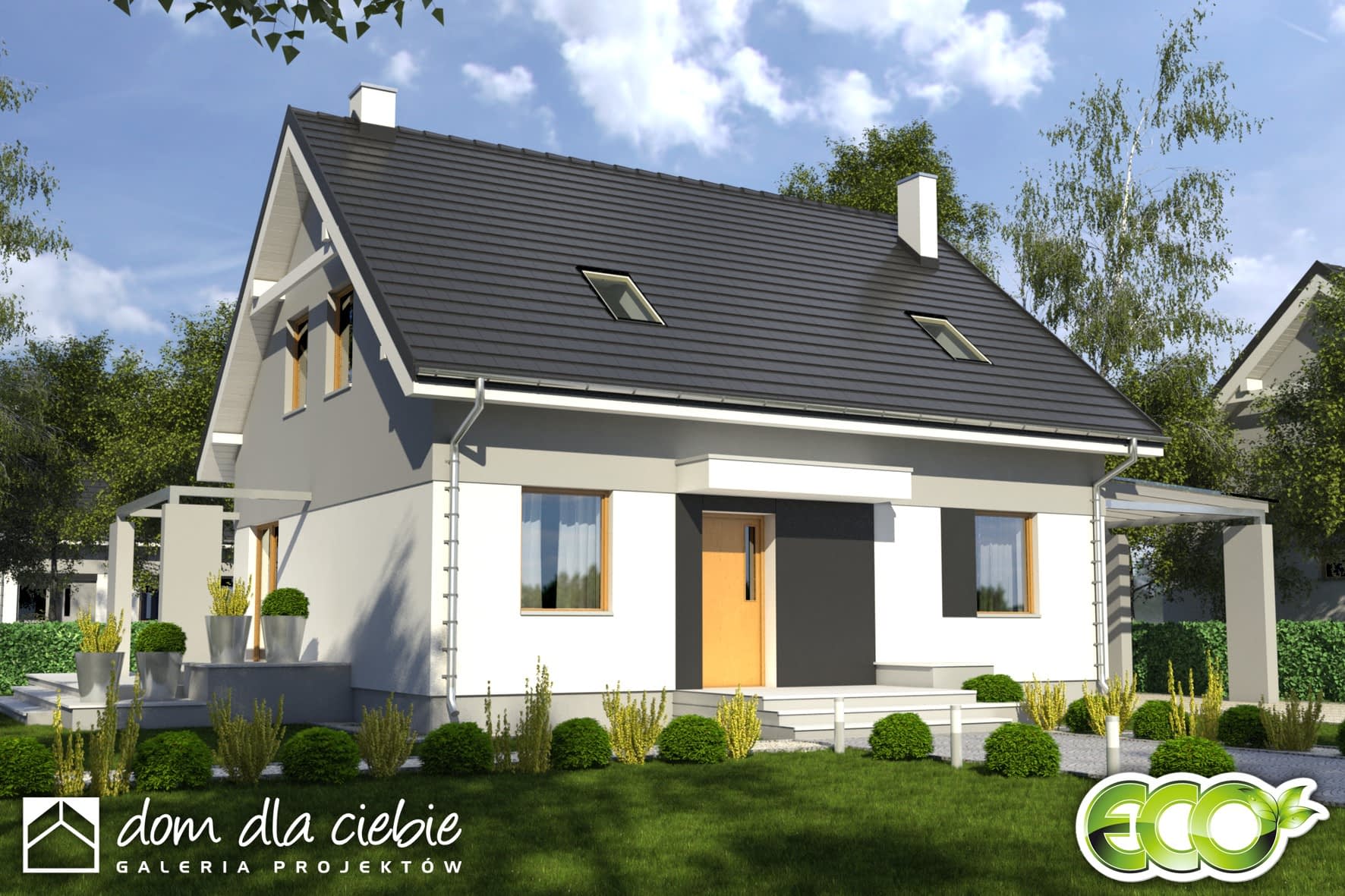 Projekt Monika II to prosty konstrukcyjnie, atrakcyjny, niewielki dom z poddaszem użytkowym i wiatą garażową dla 4-osobowej rodziny.
