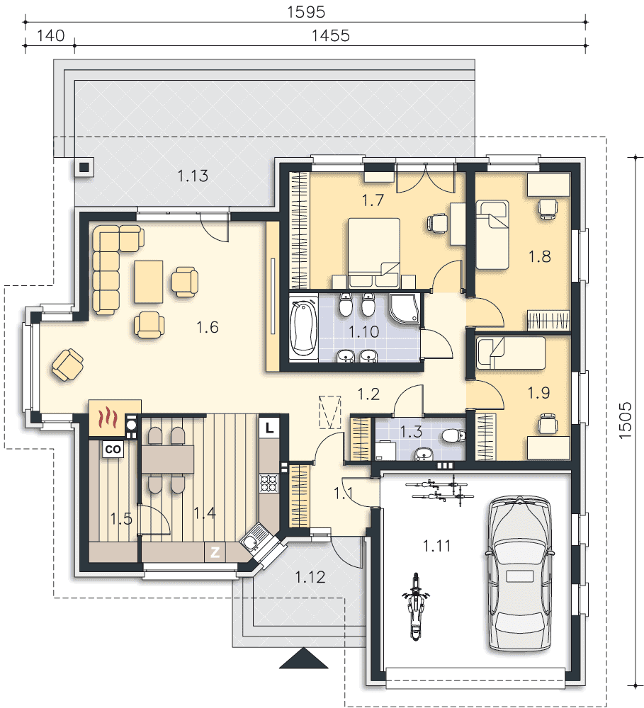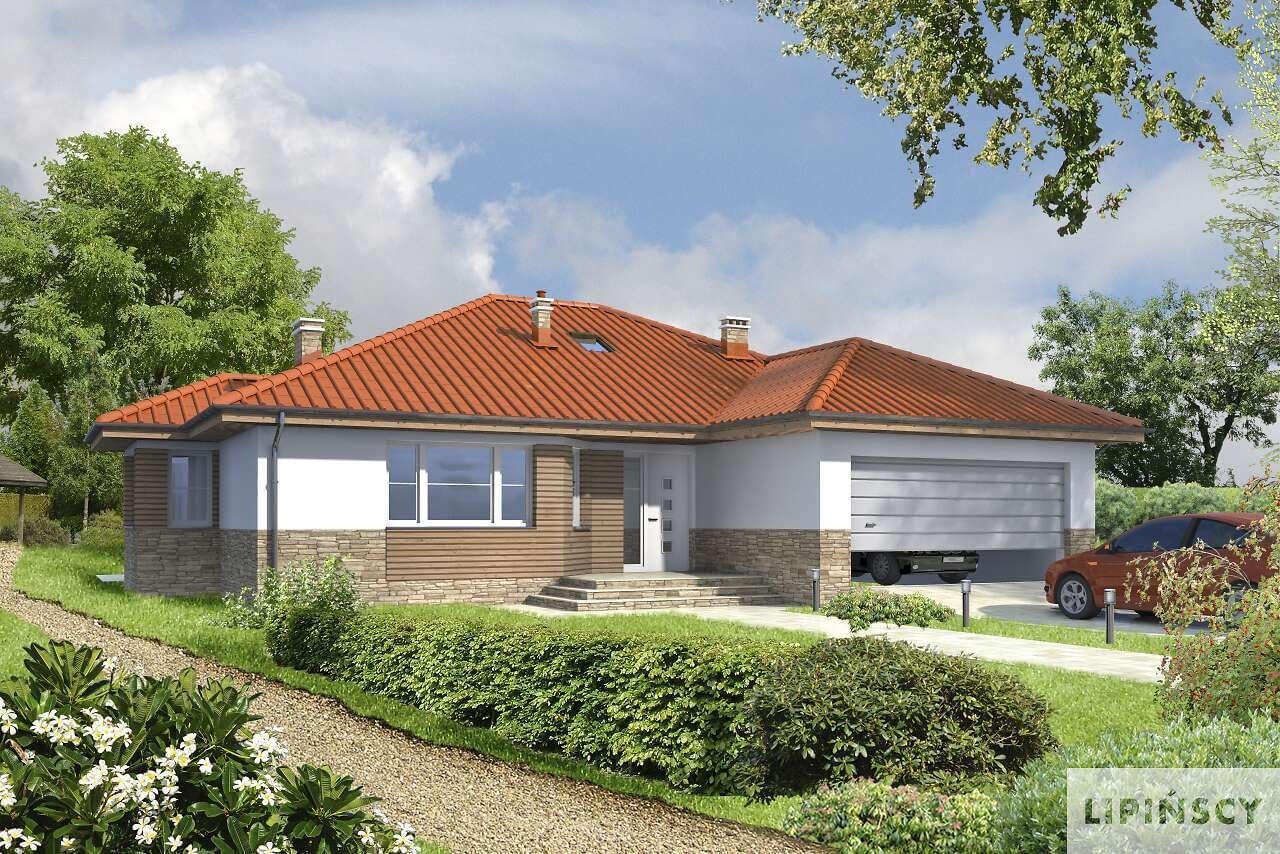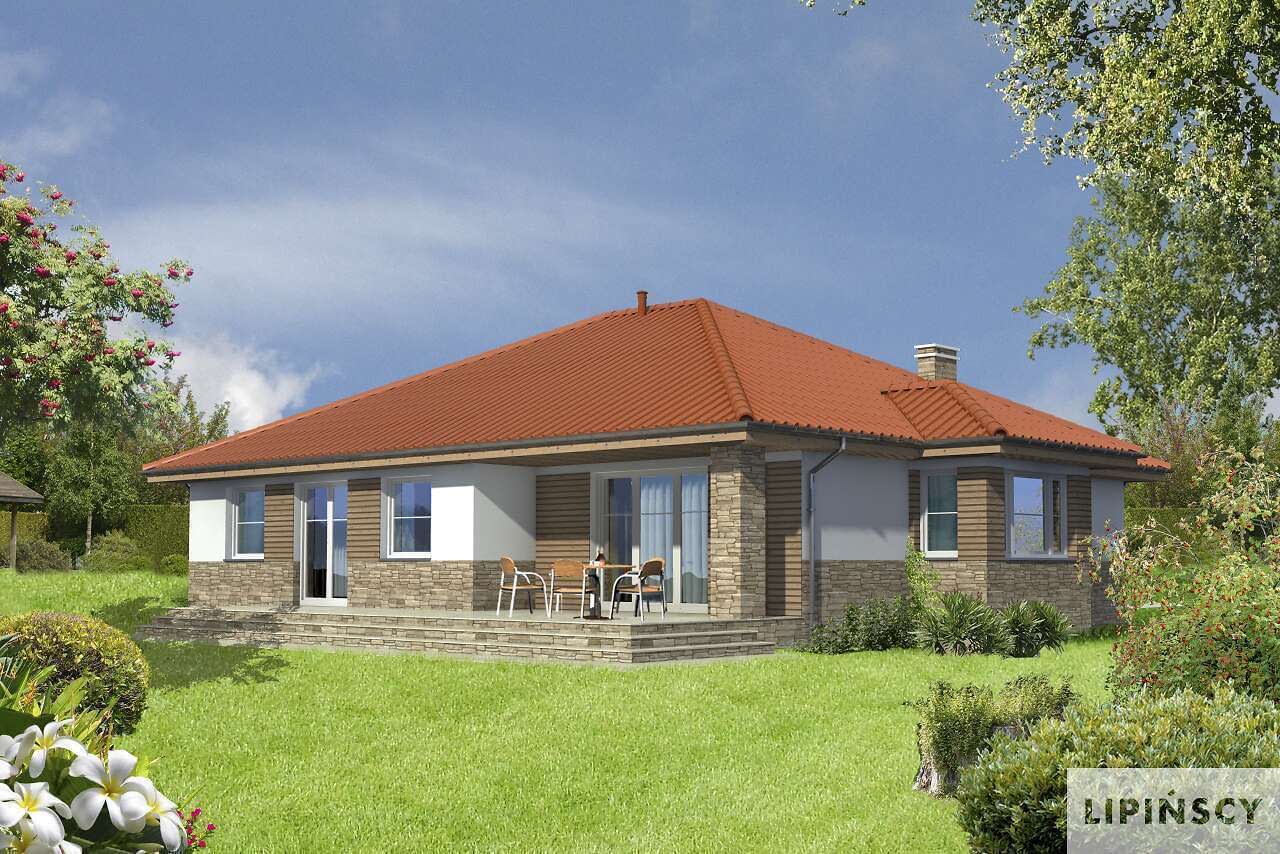 Parterowy dom z wpisanym w bryłę garażem. Funkcjonalny układ wnętrza, z wyraźnie zaznaczonymi strefami dzienną i nocną gwarantuje wygodę mieszkańcom. Do strefy wspólnej należy ustawny salon z kominkiem i wykuszem, duża kuchnia z miejscem na stół, przy której zlokalizowano przydatną spiżarnię, i wc. Strefa nocna to trzy wygodne sypialnie i łazienka z wanną i prysznicem. Ozdobą domu jest duży, częściowo zadaszony taras, doskonały do odpoczynku na świeżym powietrzu i duże przeszklenia, dzięki którym do środka wpada dużo dziennego światła.