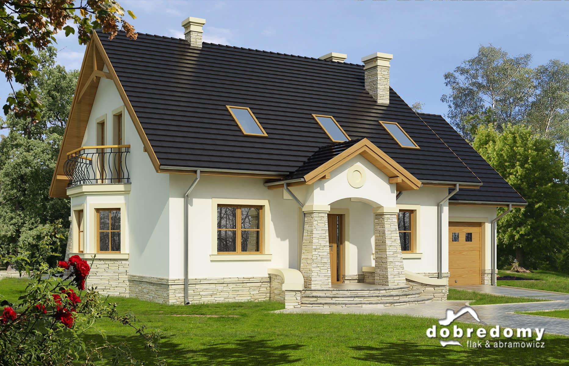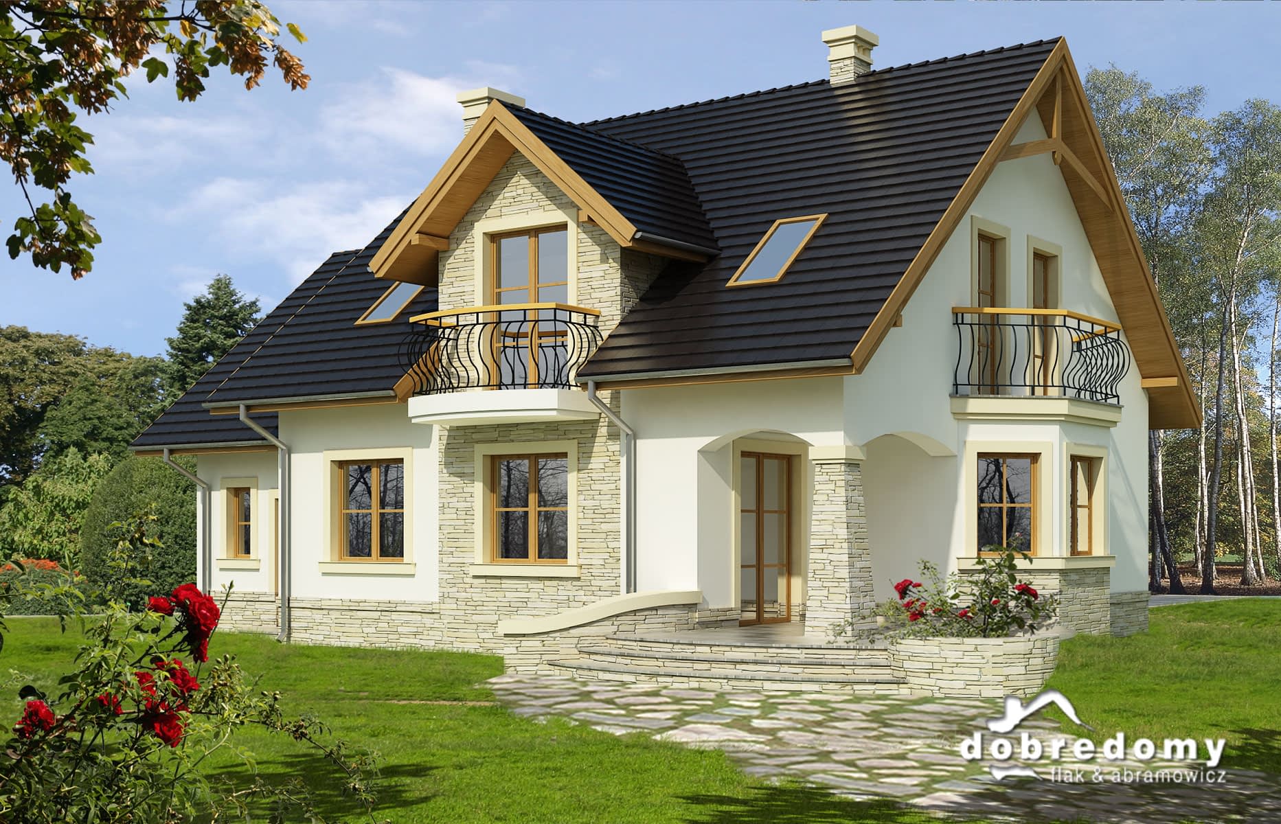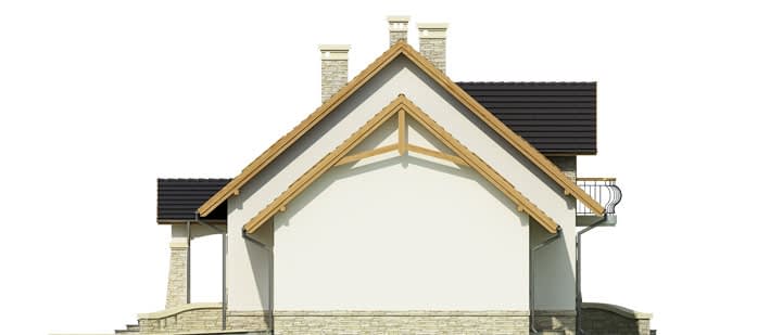 Elewacje pokryte tynkiem strukturalnym w systemie ociepleń Termo Organika oraz okładziną kamienną. W projekcie zastosowano okna dachowe marki FAKRO. Pokrycie dachu - dachówka ceramiczna lub cementowa CREATON.