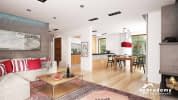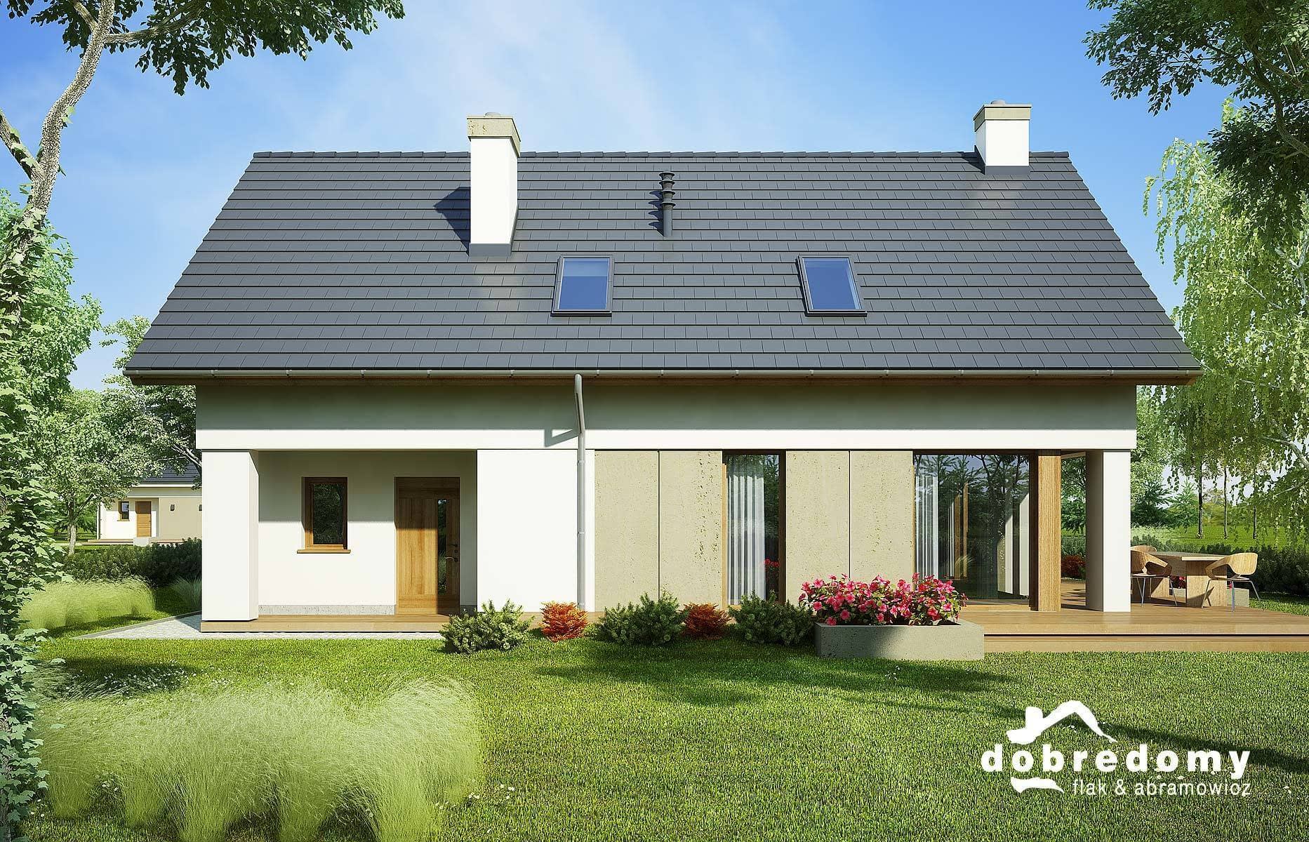 Projekt jednorodzinnego domu parterowego z poddaszem użytkowym i garażem 1-stanowiskowym, przeznaczony dla rodziny 4-osobowej. Układ funkcjonalny parteru obejmuje strefę dzienną (salon połączony z jadalnią i osobna kuchnia) oraz gospodarczą (garaż i pom. gosp.). Dodatkowe pomieszczenia na tej kondygnacji to: spiżarnia, wc, garderoba. Na poddaszu zlokalizowano strefę nocną (4 sypialnie, garderoba i łazienka).