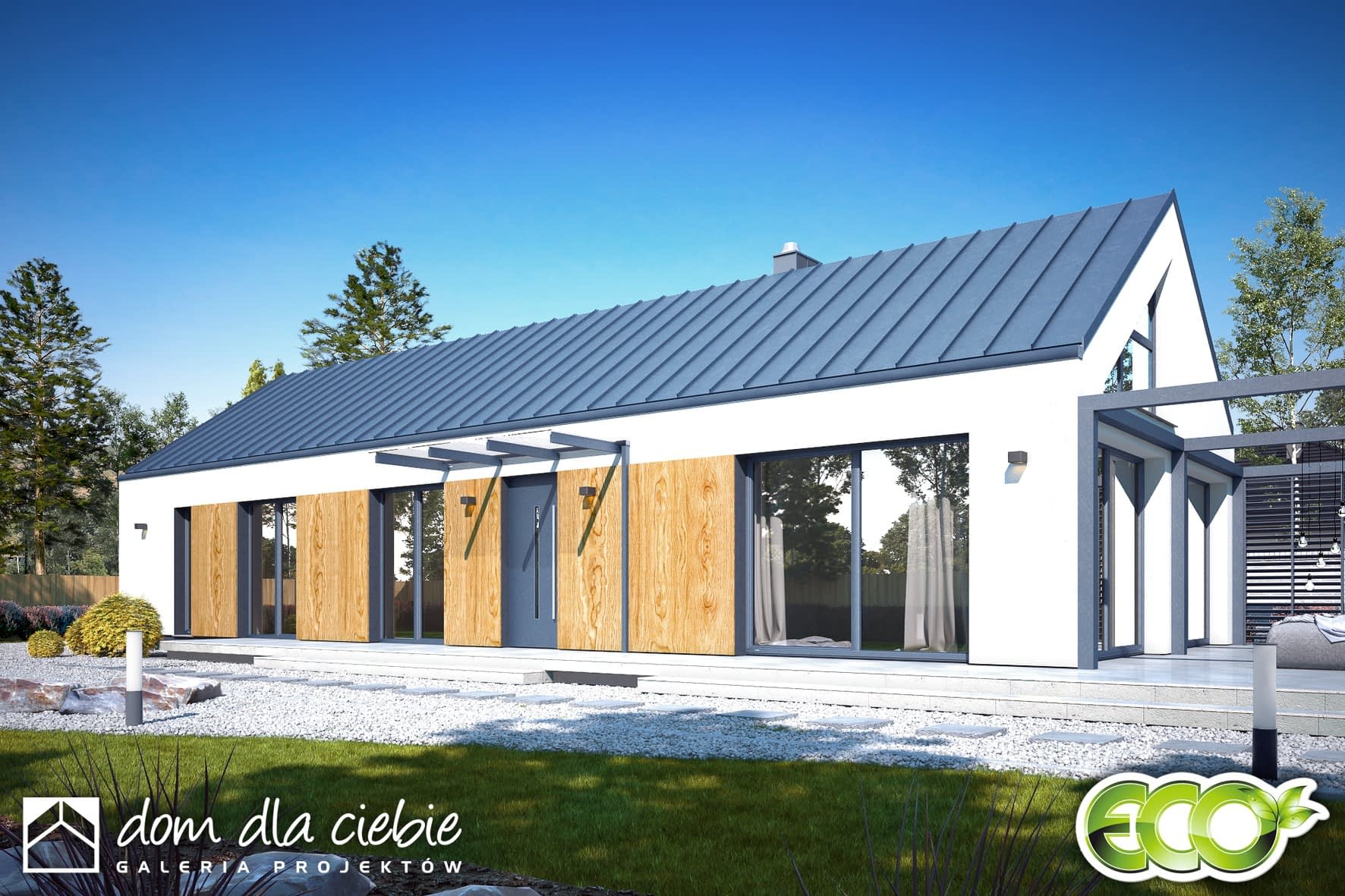 Projekt domu jednorodzinnego Natan II to projekt domu na wąską działkę, w układzie szczytowym względem frontu działki. Dom zaprojektowano na planie wydłużonego prostokąta, z prostym dwuspadowym dachem, z wykończeniem jednorodnym materiałem z nielicznymi elementami drewnianymi. Z jednej strony dom pozbawiony jest okien, co pozwala zbliżyć się budynkiem na co najmniej 3m od granicy działki. Jest to propozycja kompaktowego domu parterowego przeznaczonego dla czteroosobowej rodziny. Projekt przewiduje wygodną strefę dzienną (z salonem z wyjściem na częściowo zadaszony taras, z kuchnią, małym schowkiem - spiżarnią, wc oraz funkcjonalną strefę nocną (3 sypialnie, w tym jedna z prywatną łazienką i garderobą, duża ogólnodostępna łazienka z oknem oraz kotłownia). Dużym atutem tego domu jest salon, nad którym nie ma stropu a przestrzeń nad nim ograniczają dopiero połacie dachowe. Prosta konstrukcja domu i bryły, przełoży się na niskie koszty budowy, odczuwalne w trakcie realizacji inwestycji.