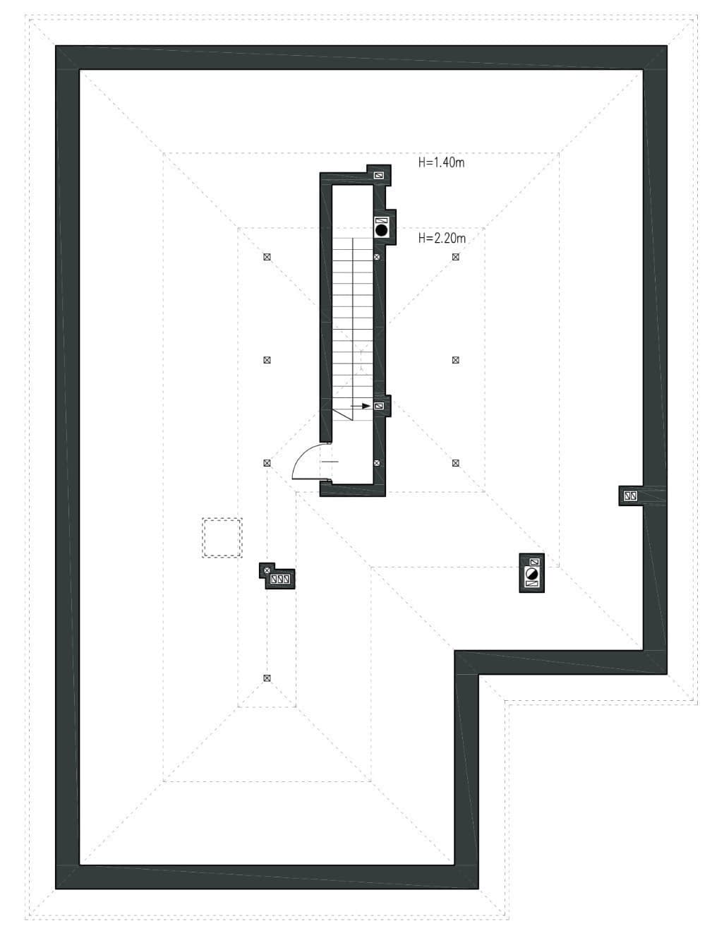 Strefa dzienna to wygodny, przeszklony salon z wyjściem na zadaszony taras, kominkiem oraz miejscem na duży stół. Kuchnia z dużym oknem zapewniającym widok na wejście do domu oraz spiżarnia. Obszerny wiatrołap z miejscem na pakowne szafy stanowi komunikację z dwustanowiskowym garażem oraz pomieszczeniem technicznym/kotłownią. Dla strefy dziennej zaprojektowano łazienkę z prysznicem.
