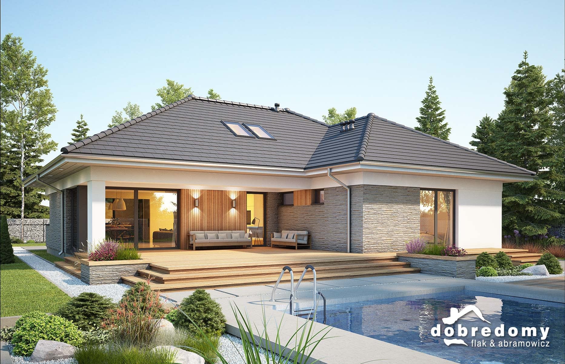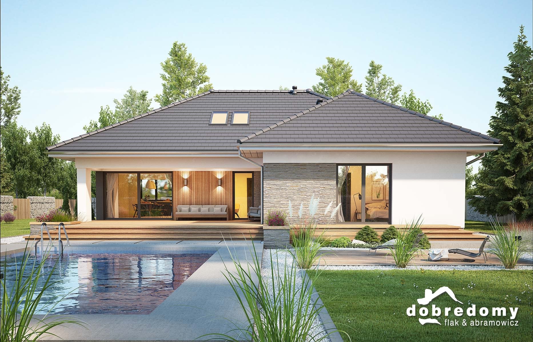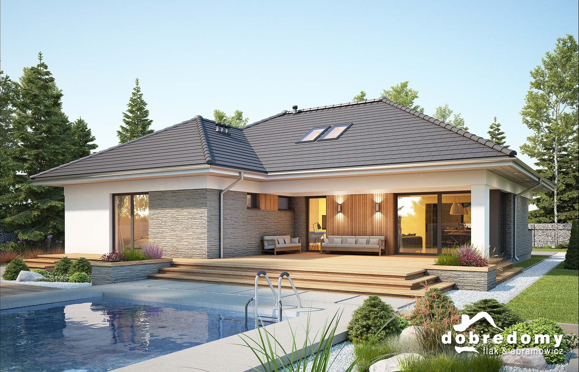 Elewacje pokryte tynkiem strukturalnym w systemie ociepleń Termo Organika oraz okładziną kamienną i drewnianą. Pokrycie dachu - dachówka ceramiczna lub cementowa CREATON.