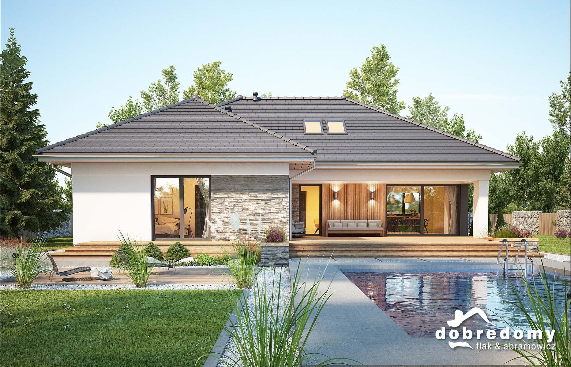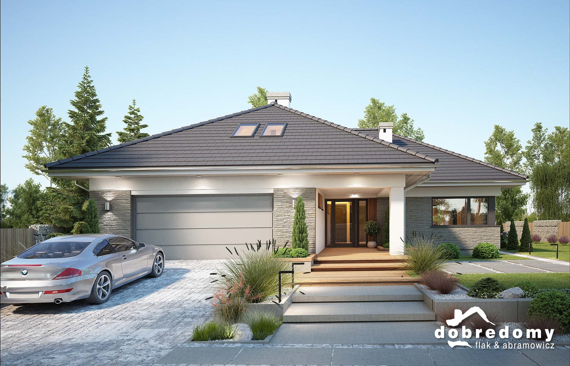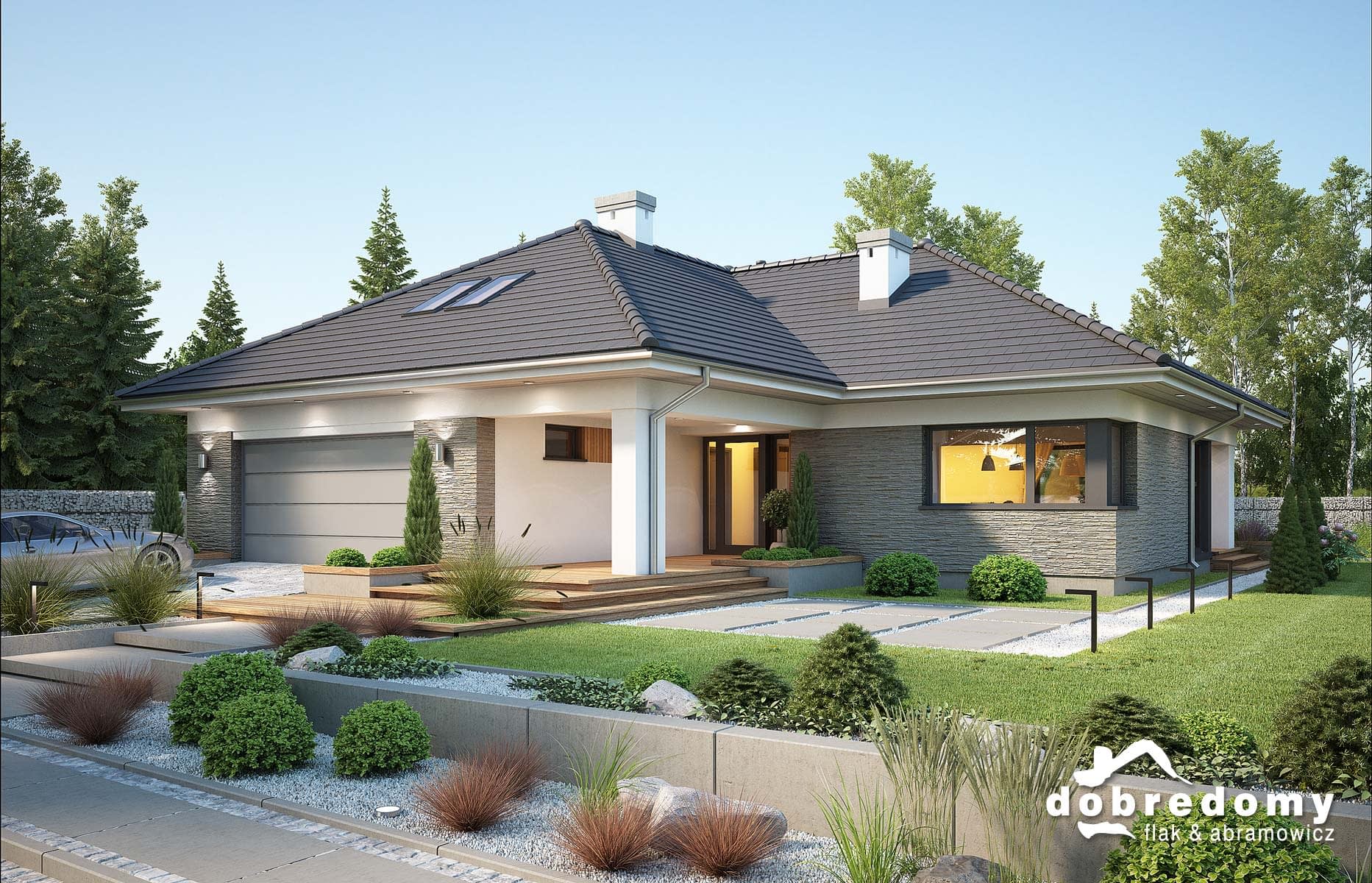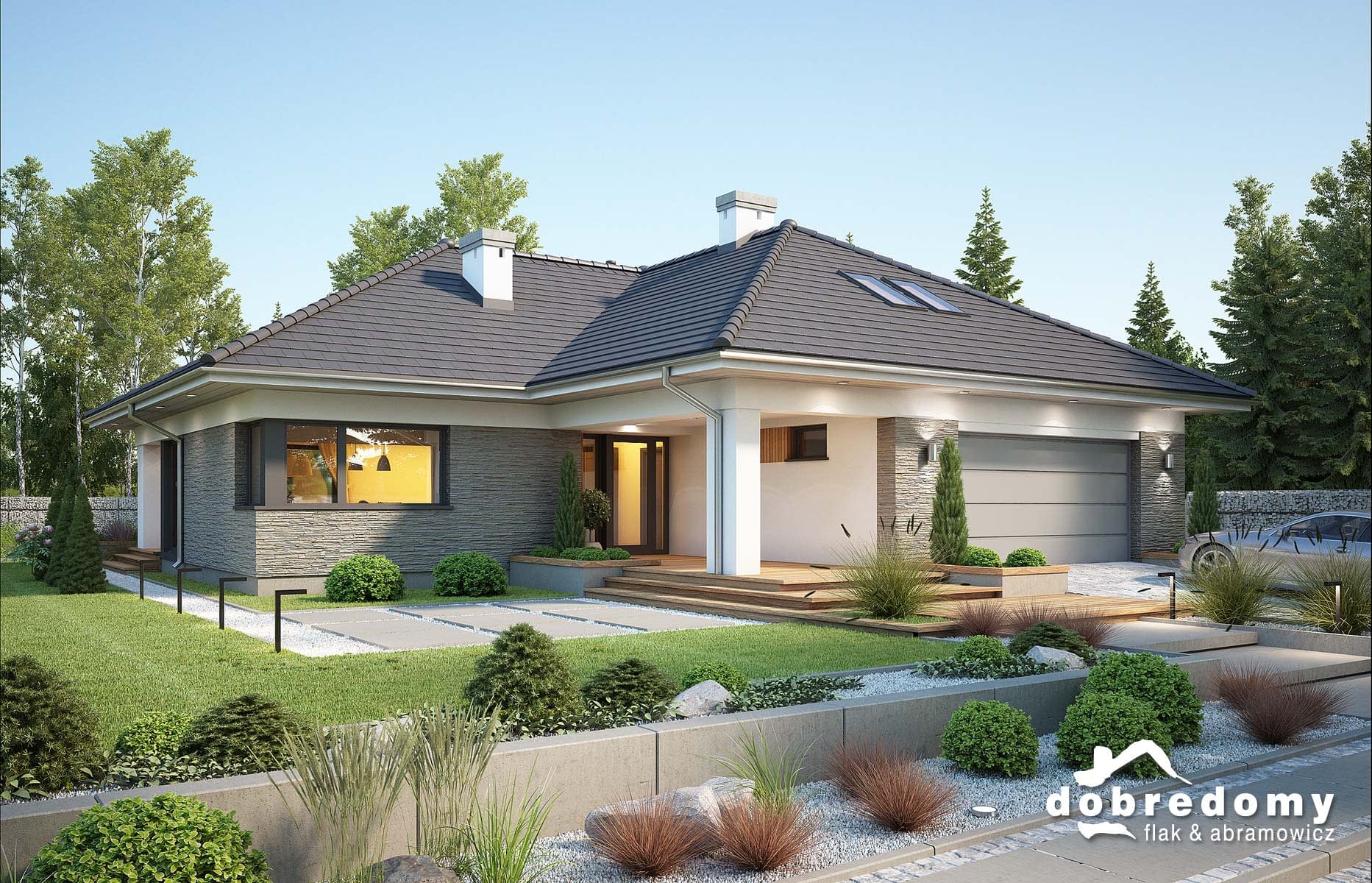 Elewacje pokryte tynkiem strukturalnym w systemie ociepleń Termo Organika oraz okładziną kamienną i drewnianą. Pokrycie dachu - dachówka ceramiczna lub cementowa CREATON.