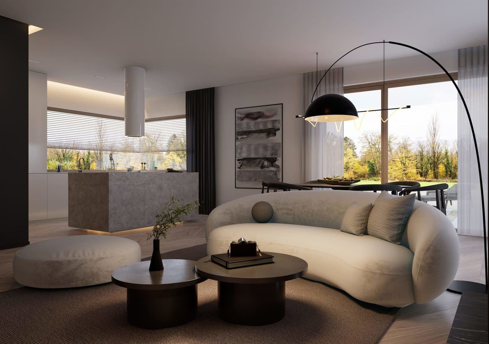 Projekt wnętrza nowoczesnej parterówki został starannie dostosowany do potrzeb codziennego życia, uwzględniając niezbędne pomieszczenia gospodarcze, takie jak garderoba, spiżarnia, kotłownia i pralnia. W jak najwygodniejszym życiu pomogą także rodzinna łazienka (6 m2) i toaleta (2 m2).