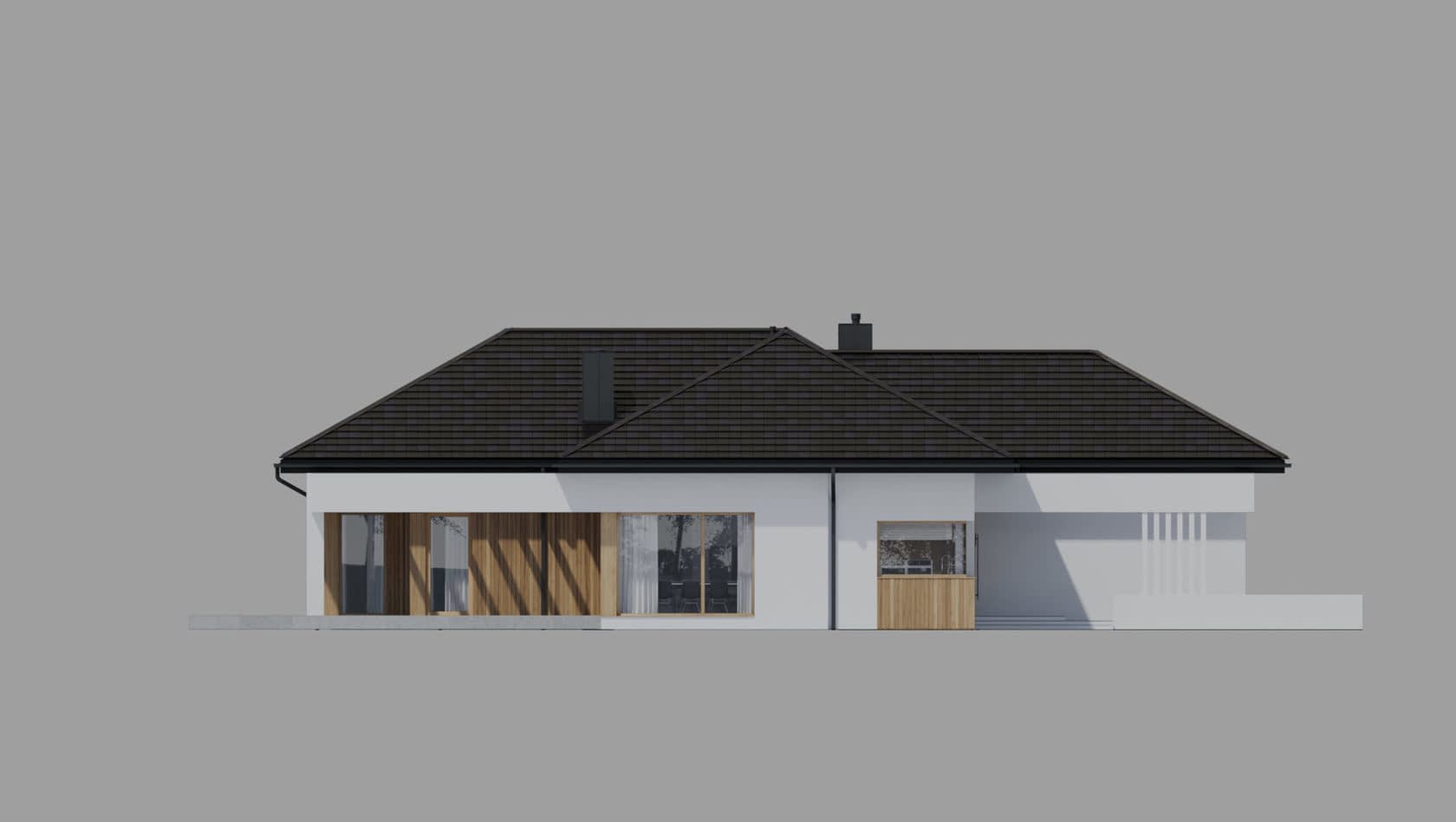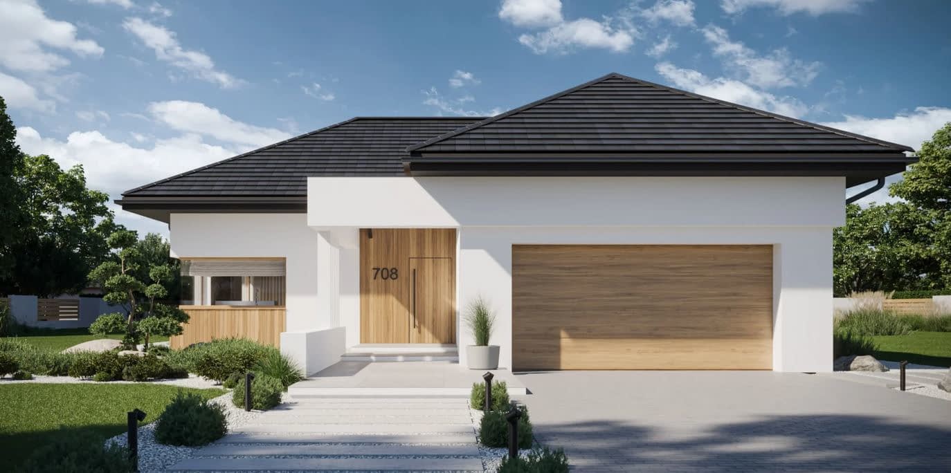- Elewacja tynk silikonowy w kolorze białym połączony z drewnem elewacyjnym