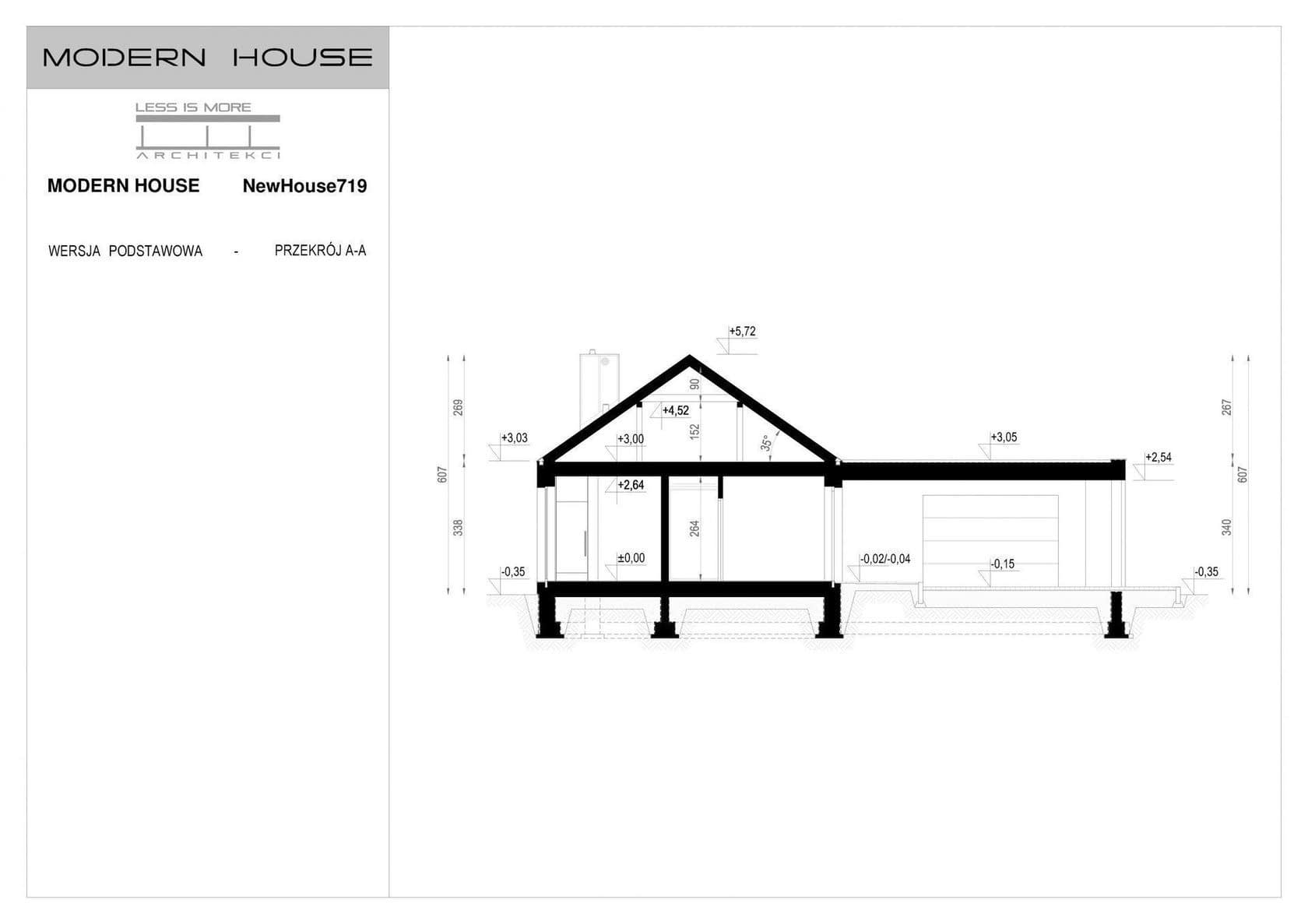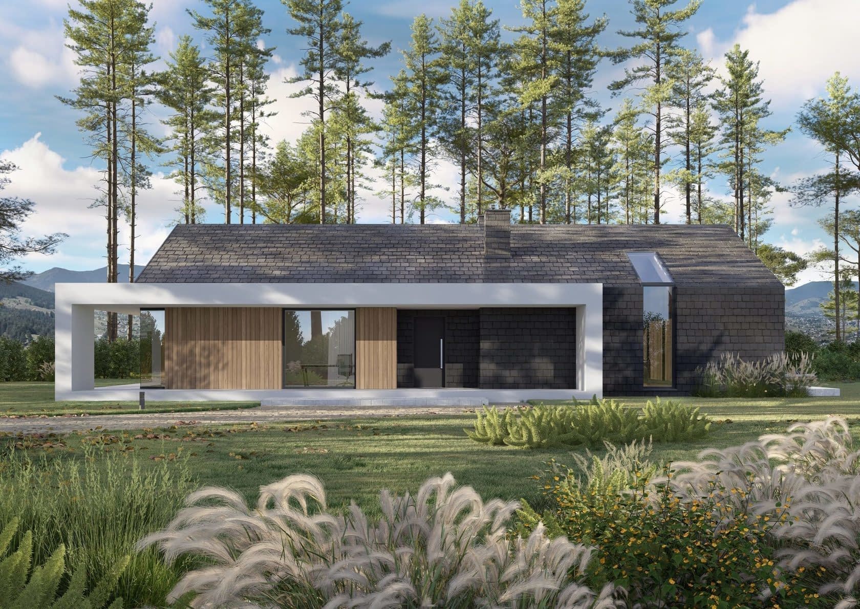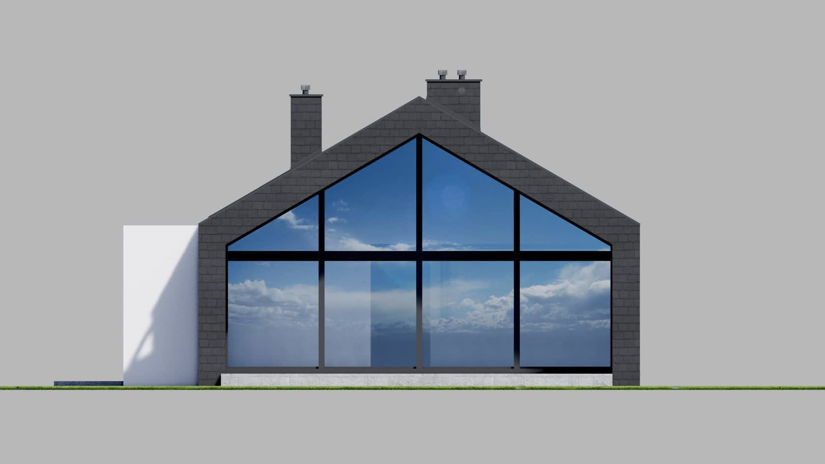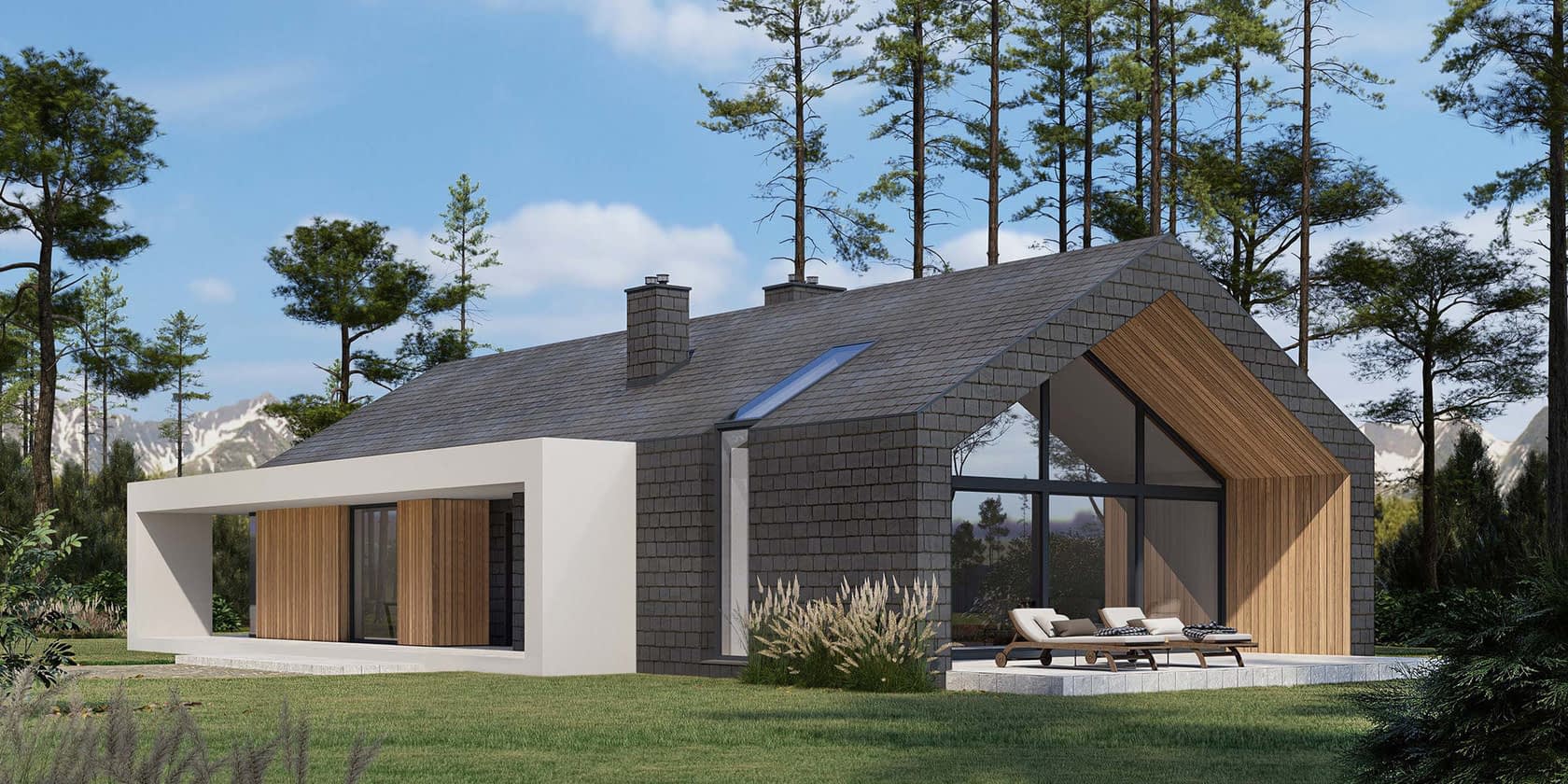 NewHouse 714 to projekt nowoczesnego domu dla tych, którzy równie wysoko co bryłę domu cenią także to, co na zewnątrz. Właśnie dlatego ten projekt parterowego domu charakteryzuje się efektownymi przeszkleniami oraz wysokim oknem kolankowym w kuchni.