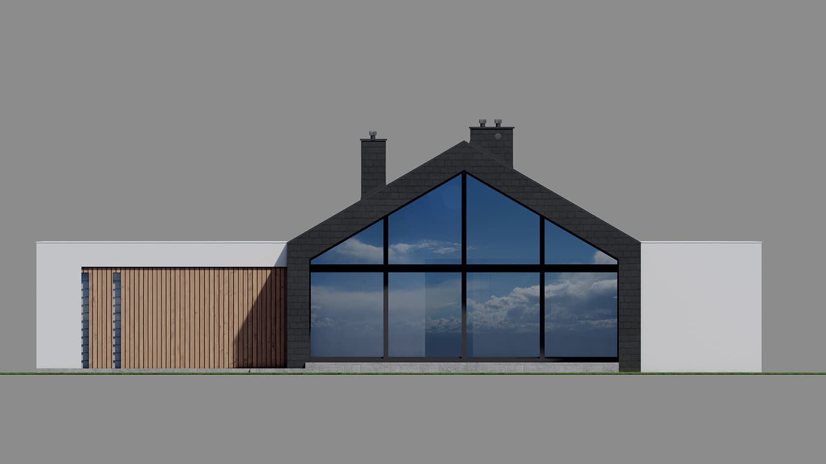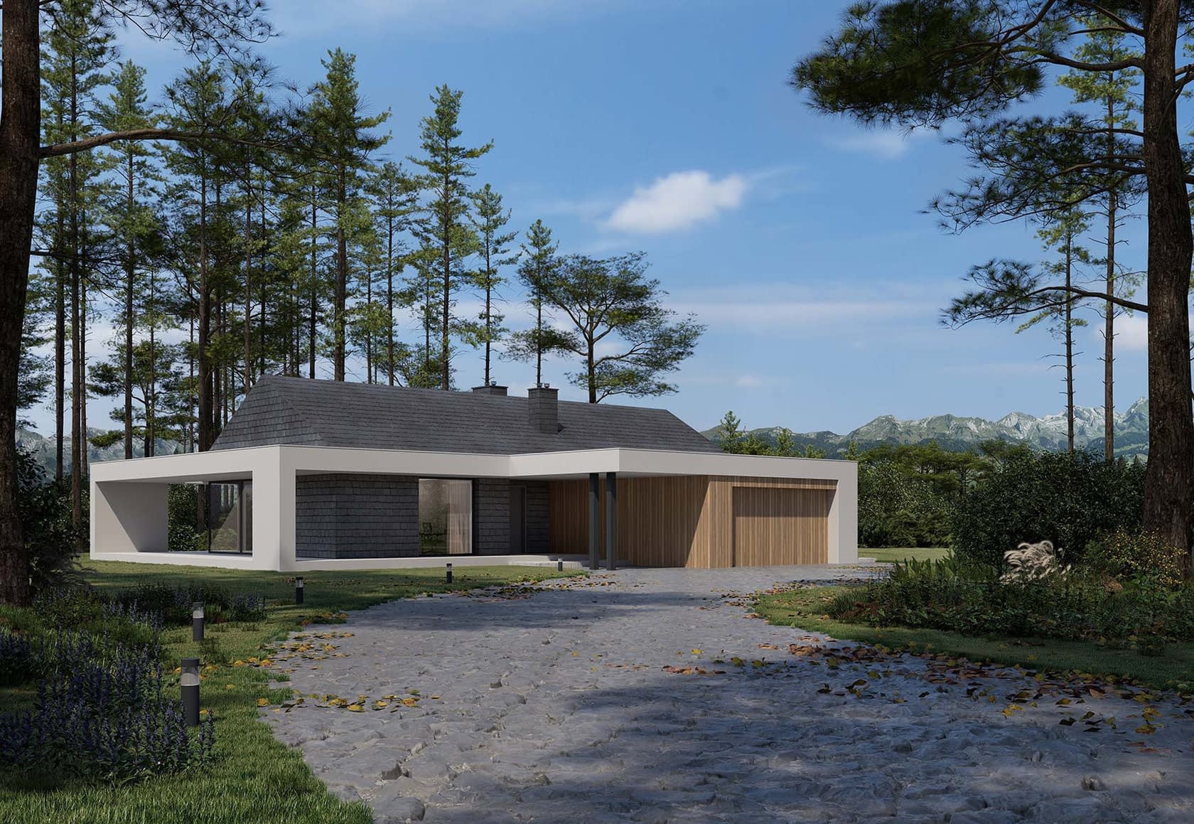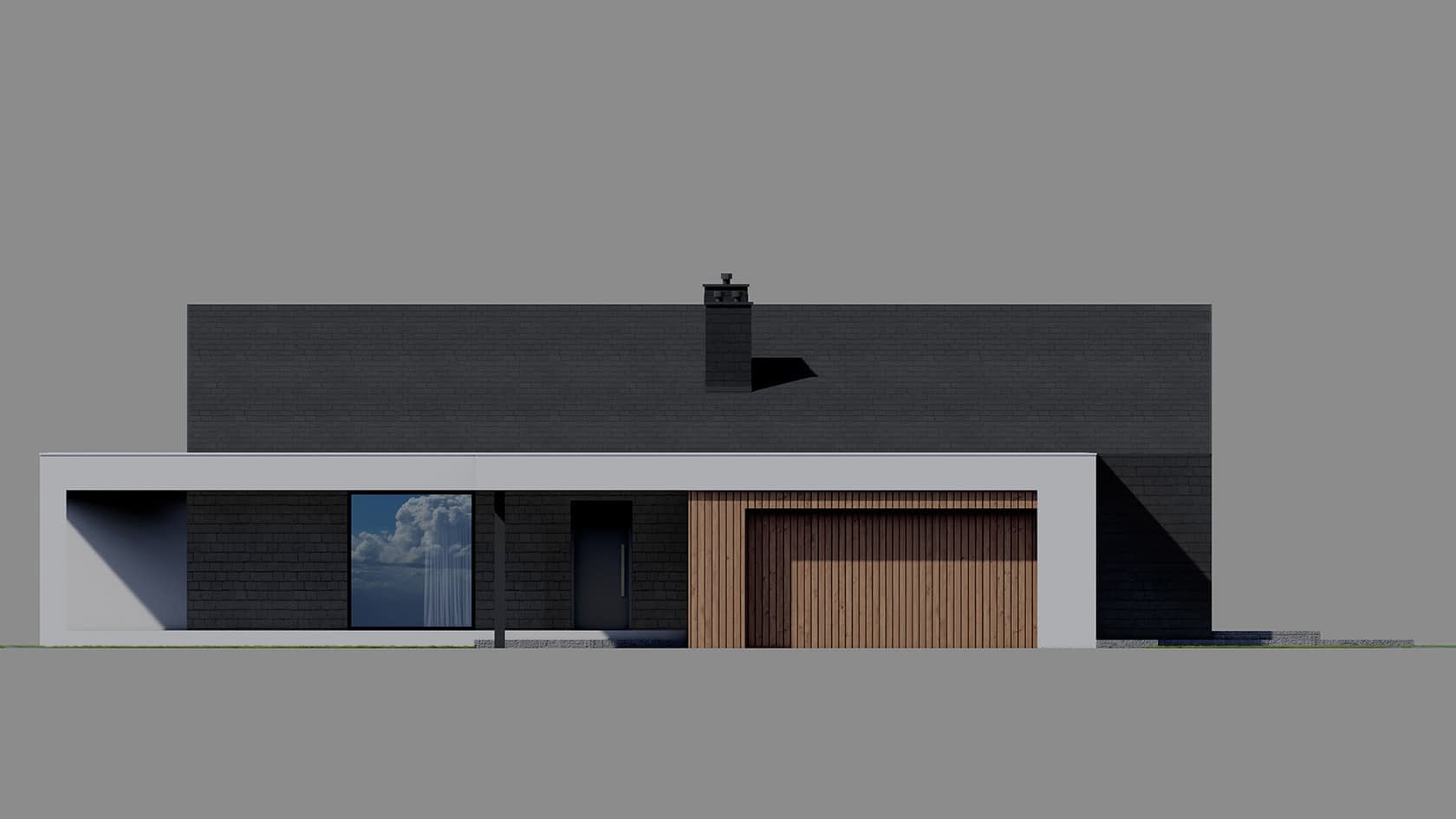 Ten kameralny dom (105 m2) urzeka już przy pierwszym spojrzeniu. Ponadczasowa elegancja bryły to efekt umiejętnego połączenia skandynawskiego minimalizmu z nowoczesnością. Ściany domu oraz dach wykończone są w łupku, ściany garażu jasnym, naturalnym drewnem a całość opasana jest białą belką. Uwagę zwraca ciekawa konstrukcja tarasu (29 m2) – projektanci Modern House stworzyli to zadaszone miejsce poprzez wysunięcie bocznych ścian oraz dachu. Do Waszej dyspozycji będzie jeszcze drugi, również zadaszony taras – wyjść na niego można z największej, głównej sypialni (16 m2) z panoramicznym oknem. Jest ona wyposażona we własną garderobę (5 m2).