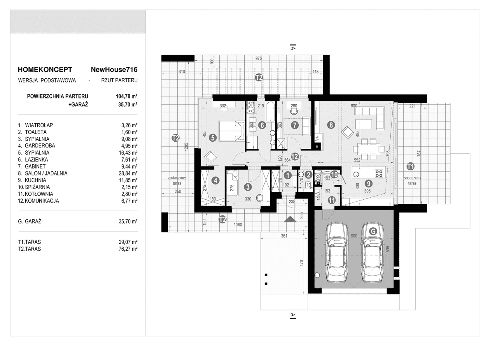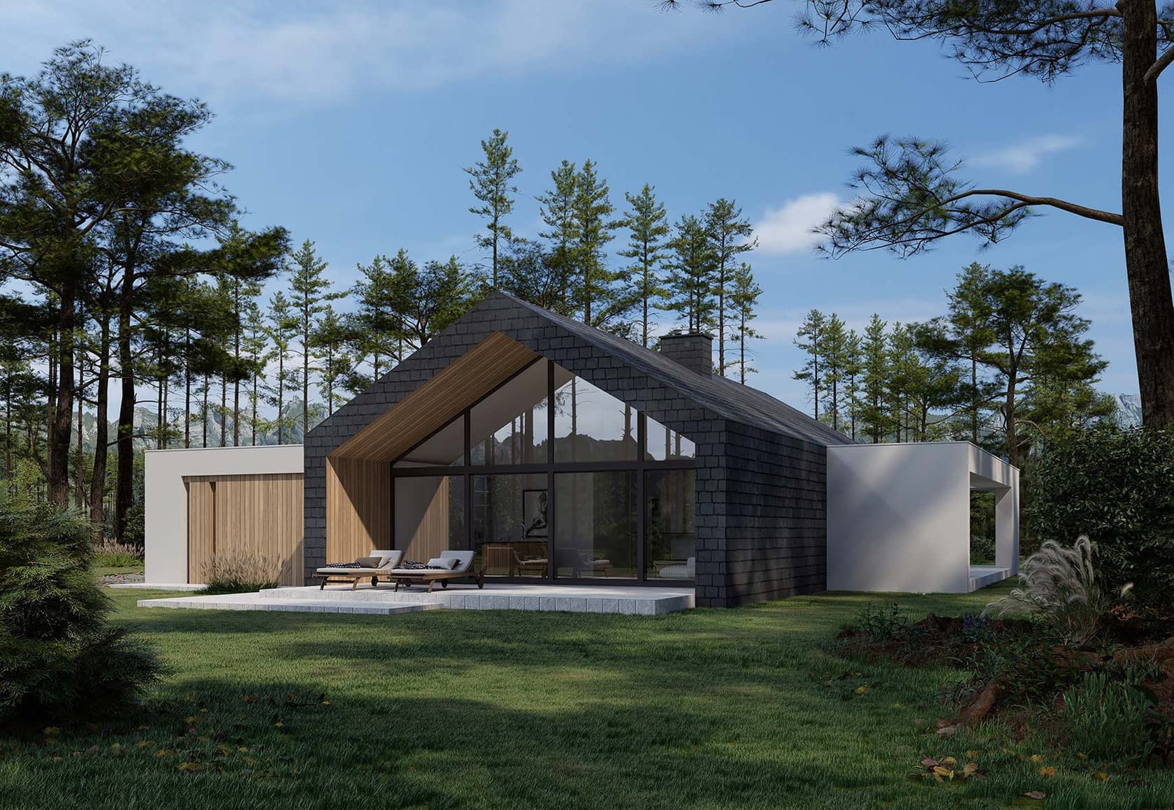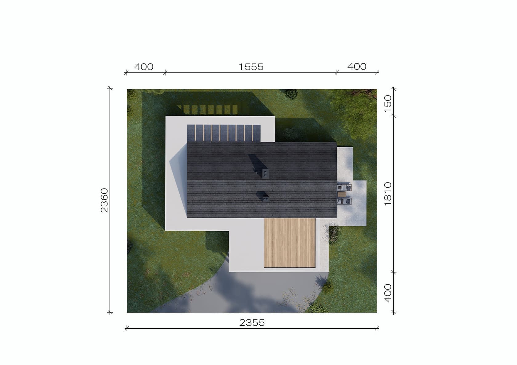 Ten kameralny dom (105 m2) urzeka już przy pierwszym spojrzeniu. Ponadczasowa elegancja bryły to efekt umiejętnego połączenia skandynawskiego minimalizmu z nowoczesnością. Ściany domu oraz dach wykończone są w łupku, ściany garażu jasnym, naturalnym drewnem a całość opasana jest białą belką. Uwagę zwraca ciekawa konstrukcja tarasu (29 m2) – projektanci Modern House stworzyli to zadaszone miejsce poprzez wysunięcie bocznych ścian oraz dachu. Do Waszej dyspozycji będzie jeszcze drugi, również zadaszony taras – wyjść na niego można z największej, głównej sypialni (16 m2) z panoramicznym oknem. Jest ona wyposażona we własną garderobę (5 m2).