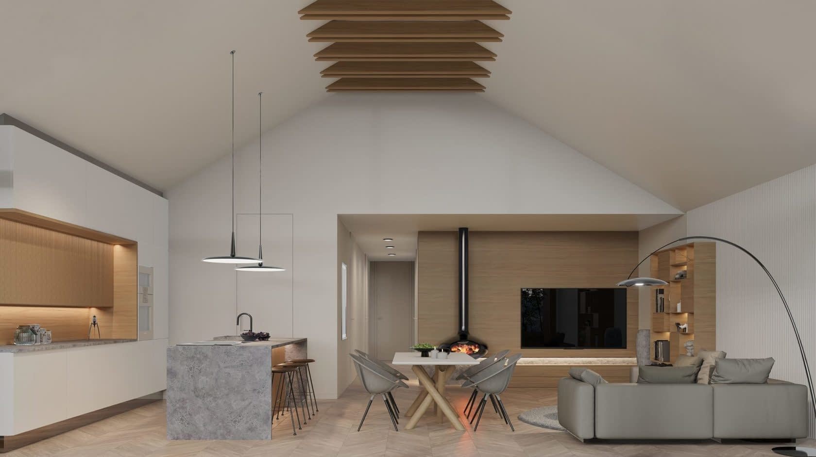 Za sypialniami znajduje się otwarta strefa dzienna (prawie 40 m2) z wysokim sufitem nad całością oraz przeszkloną ścianą otwierającą tę cześć domu na taras i ogród.