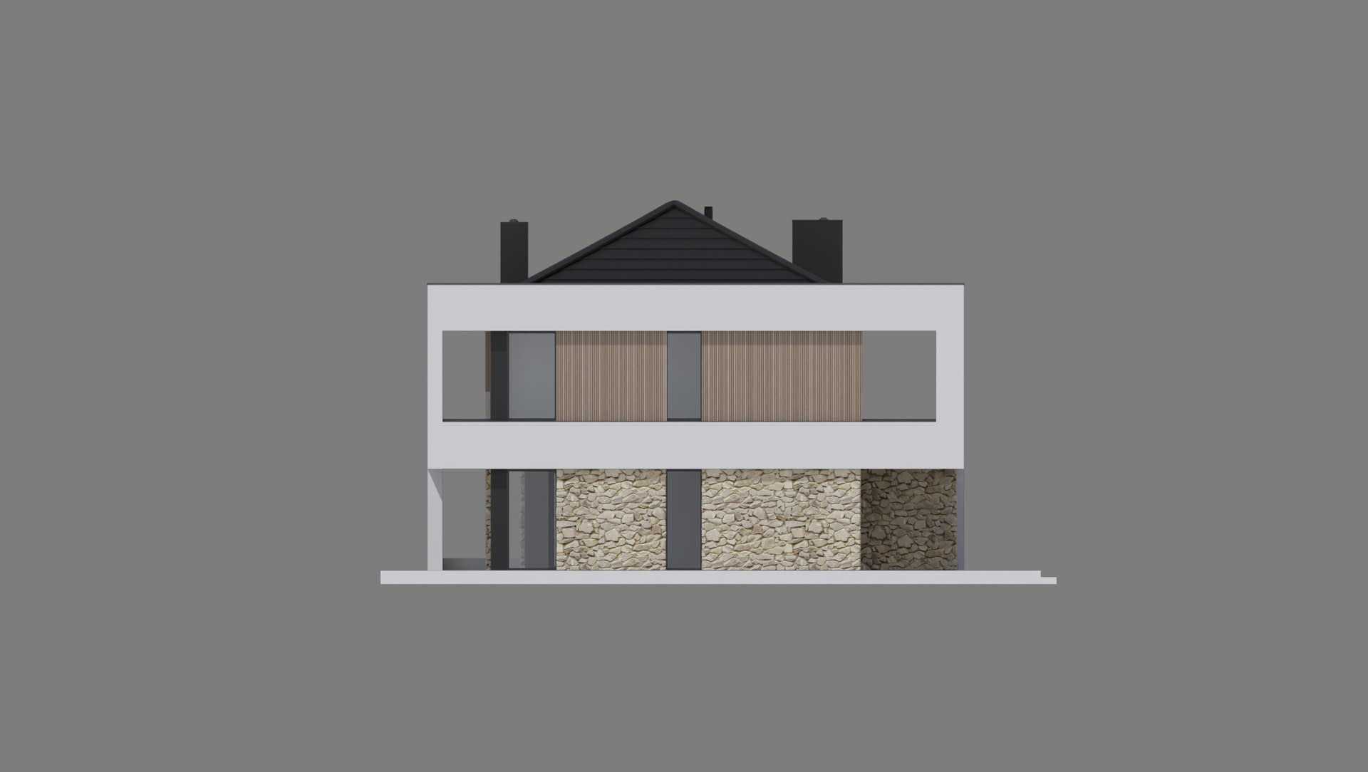 - Elewacja Tynk silikonowy w kolorze białym, drewno elewacyjne i kamień naturalny.