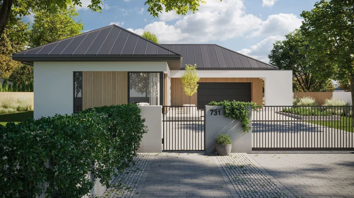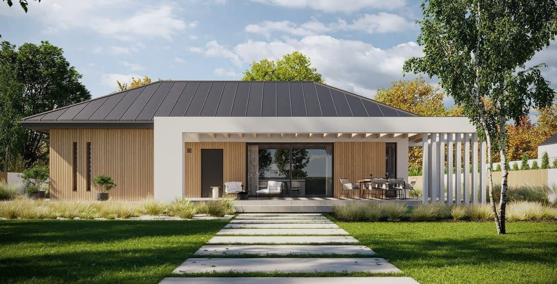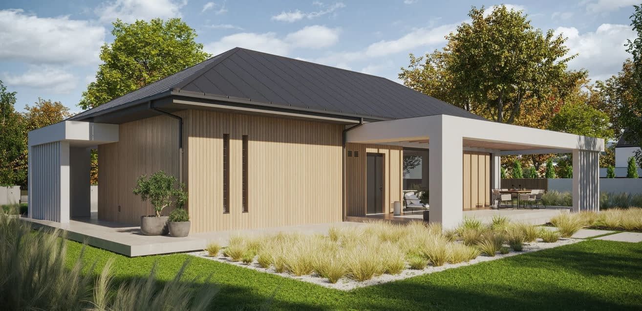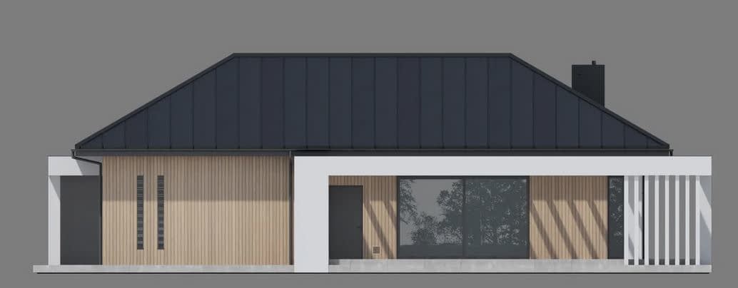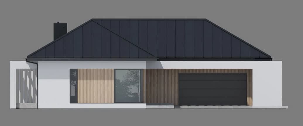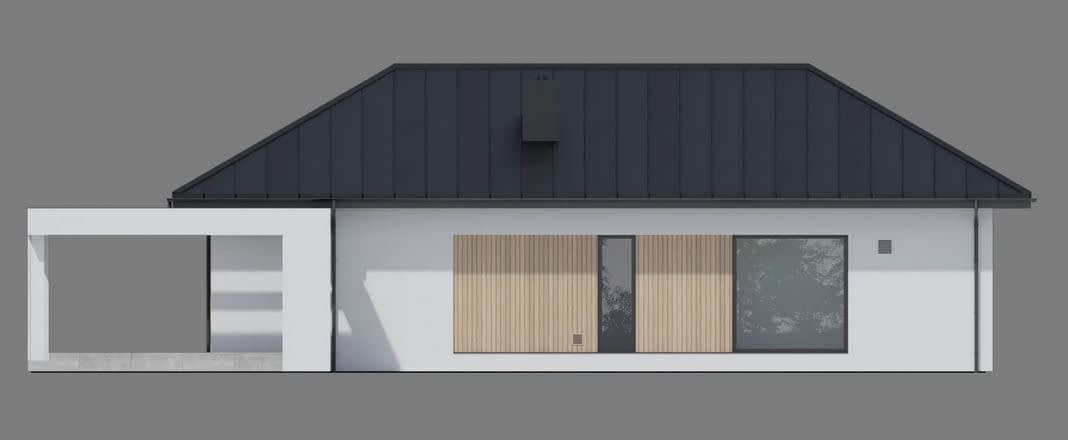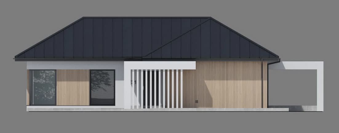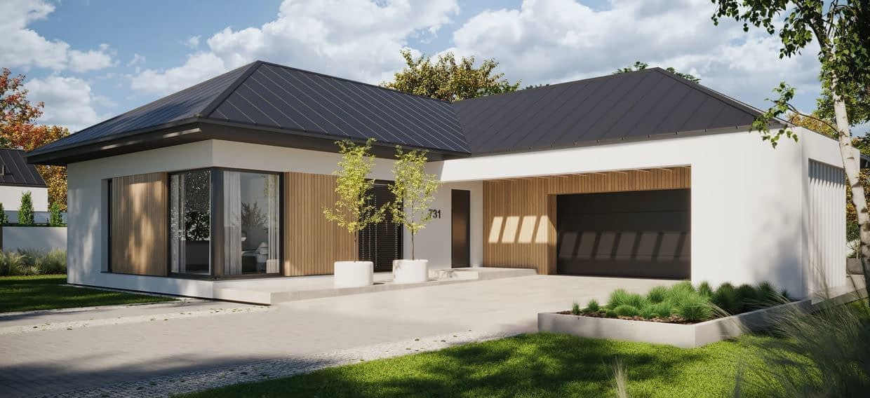 - ElewacjaTynk silikonowy w kolorze białym połączony z drewnem elewacyjnym