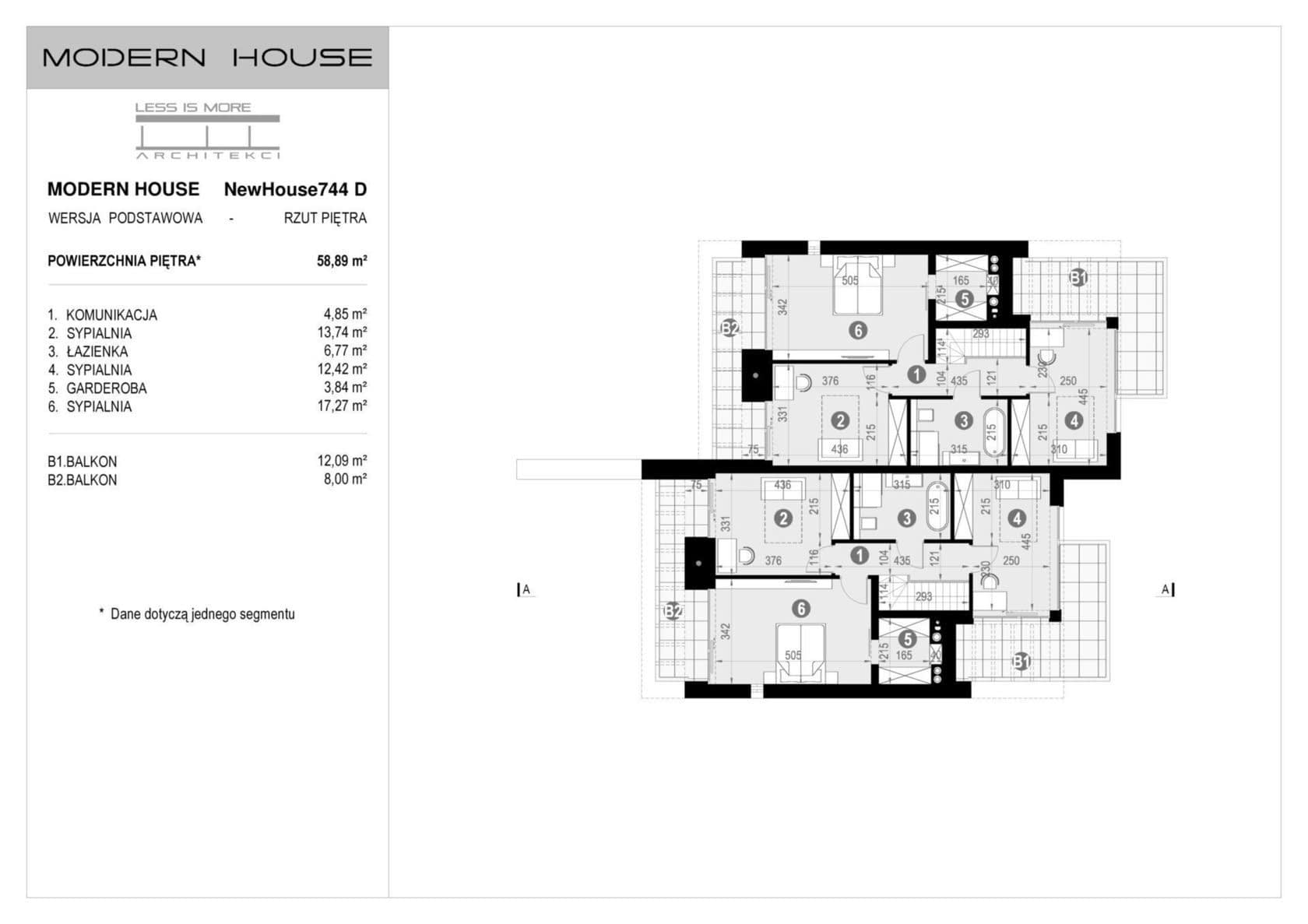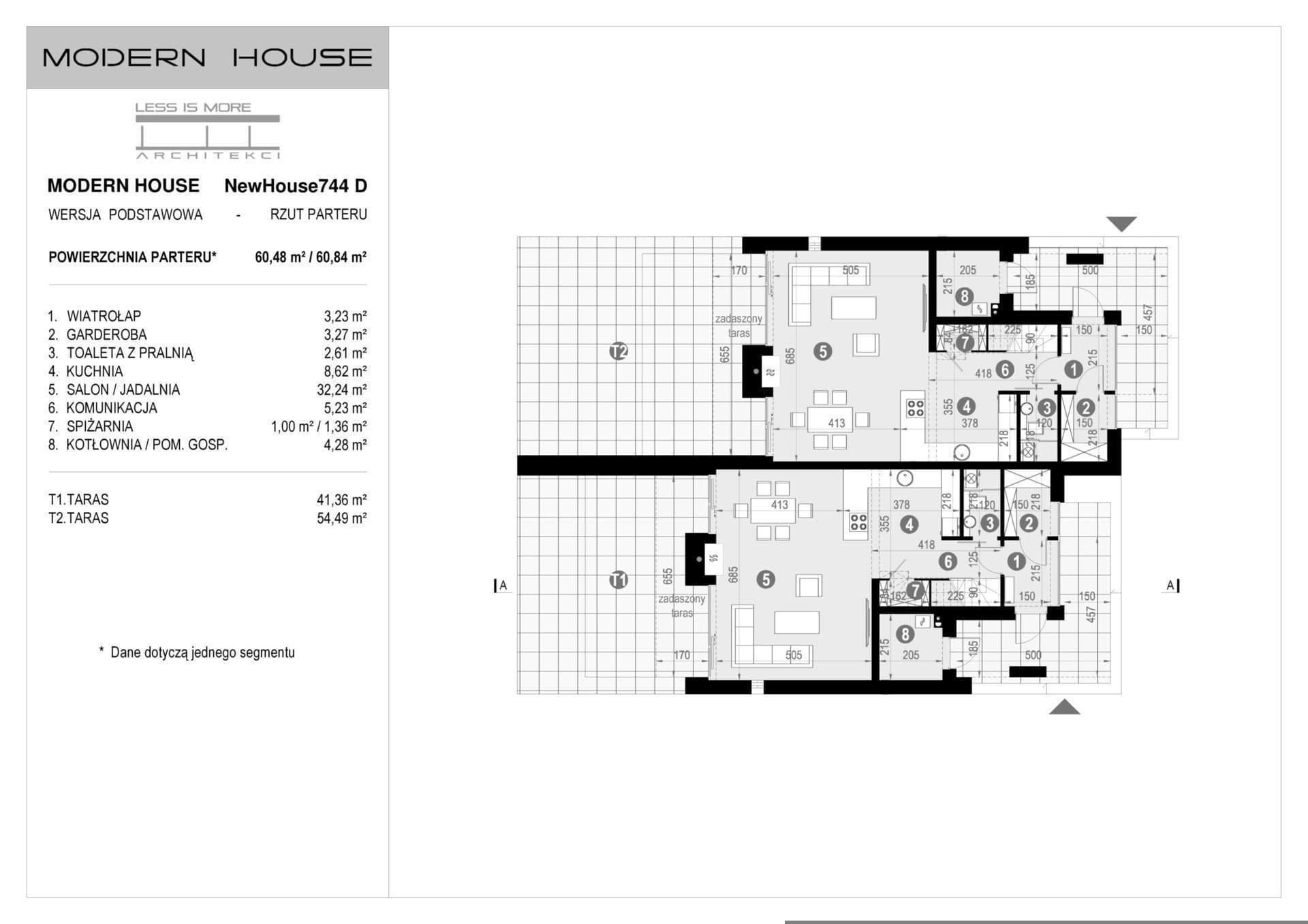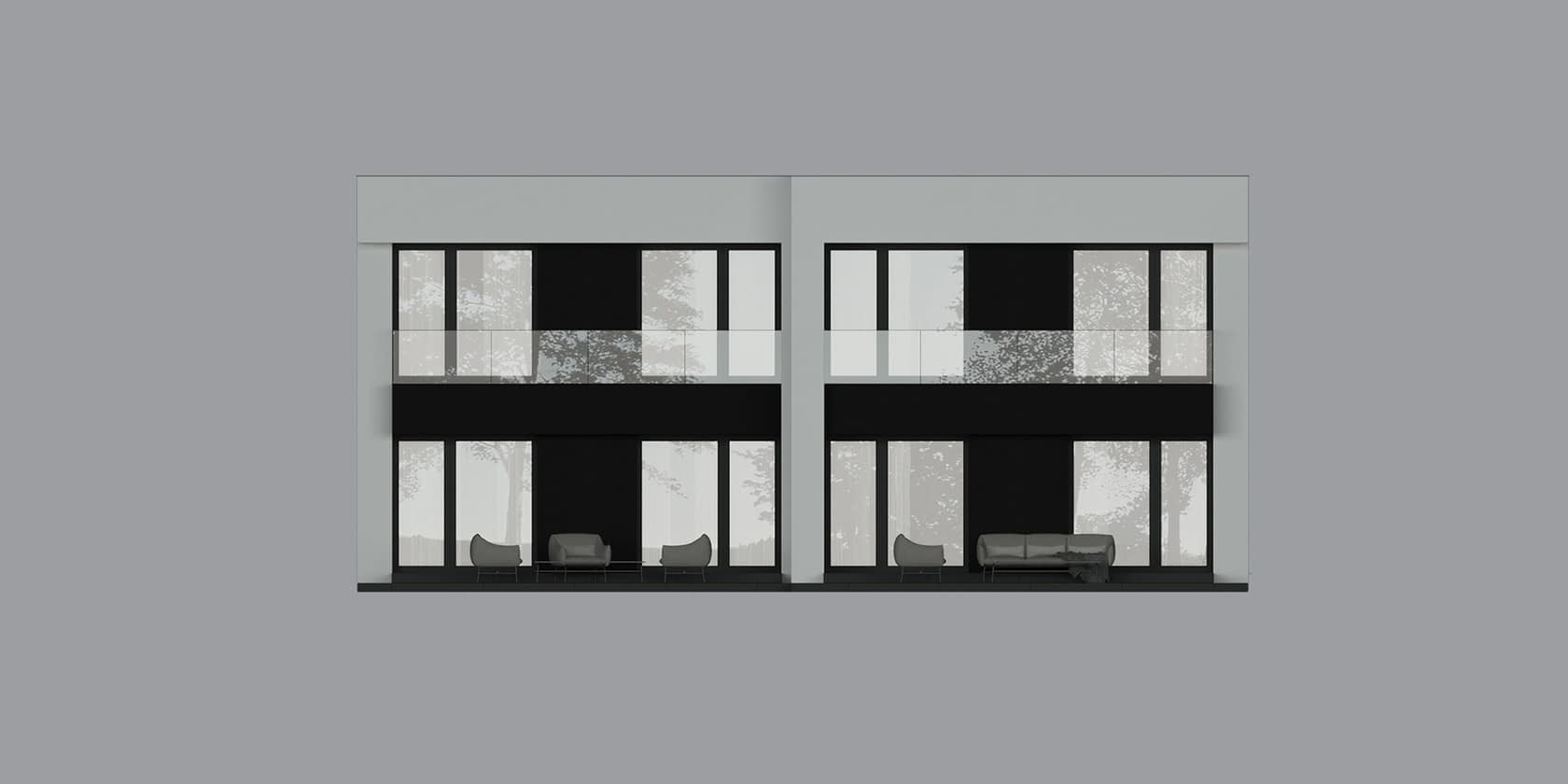 NewHouse 744 D to projekt nowoczesnego domu dwulokalowego. Każda z rodzin ma swoje niezależne mieszkanie o powierzchni 120 metrów kwadratowych. Parter to przestronna strefa dzienna z kominkiem i panoramicznymi przeszkleniami, spiżarnia, toaleta z pralnią, garderoba oraz dostępne z zewnątrz pomieszczenie gospodarcze z kotłownią. Na piętrze znajdują się trzy wygodne sypialnie z balkonami, prywatna garderoba oraz rodzinna łazienka.
