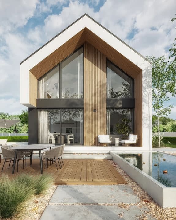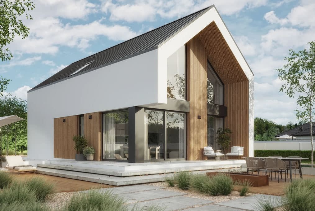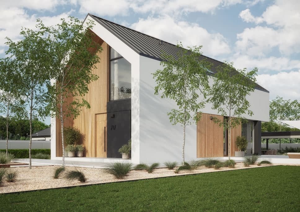 - Elewacja tynk silikonowy w kolorze białym i grafitowym, połączony z drewnem elewacyjnym lub lamelami elewacyjnymi Super Premium Qulanti