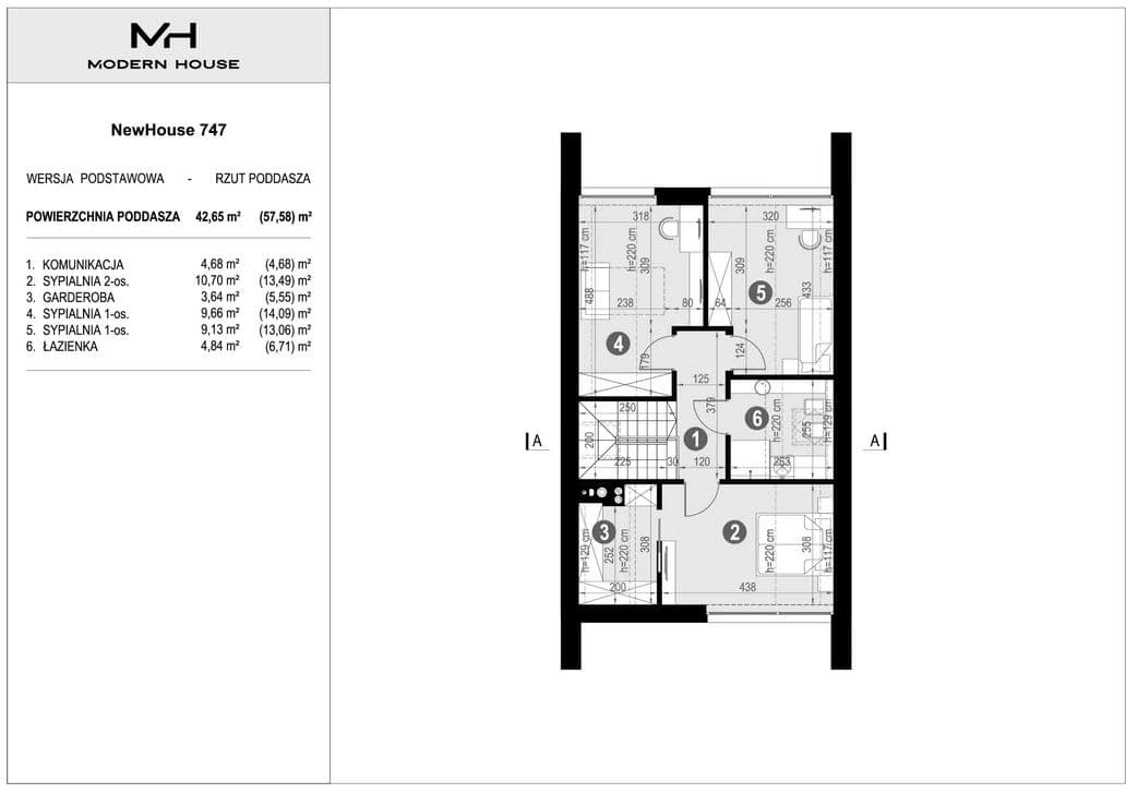 Na poddaszu znajdują się: trzy sypialnie, w tym jedna z przestronną garderobą, łazienka z prysznicem oraz miejscem na pralkę.