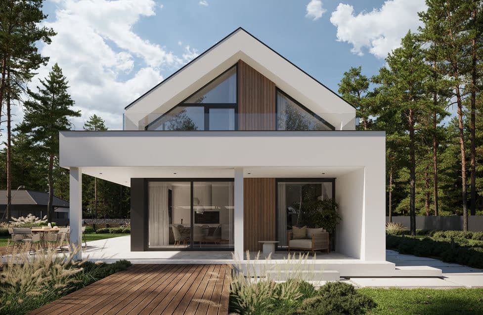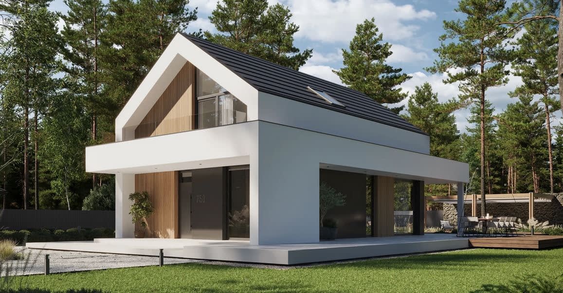 - Elewacja tynk w kolorze białym i grafitowym, połączony z drewnem elewacyjnym lub lamelami elewacyjnymi Super Premium Qulanti