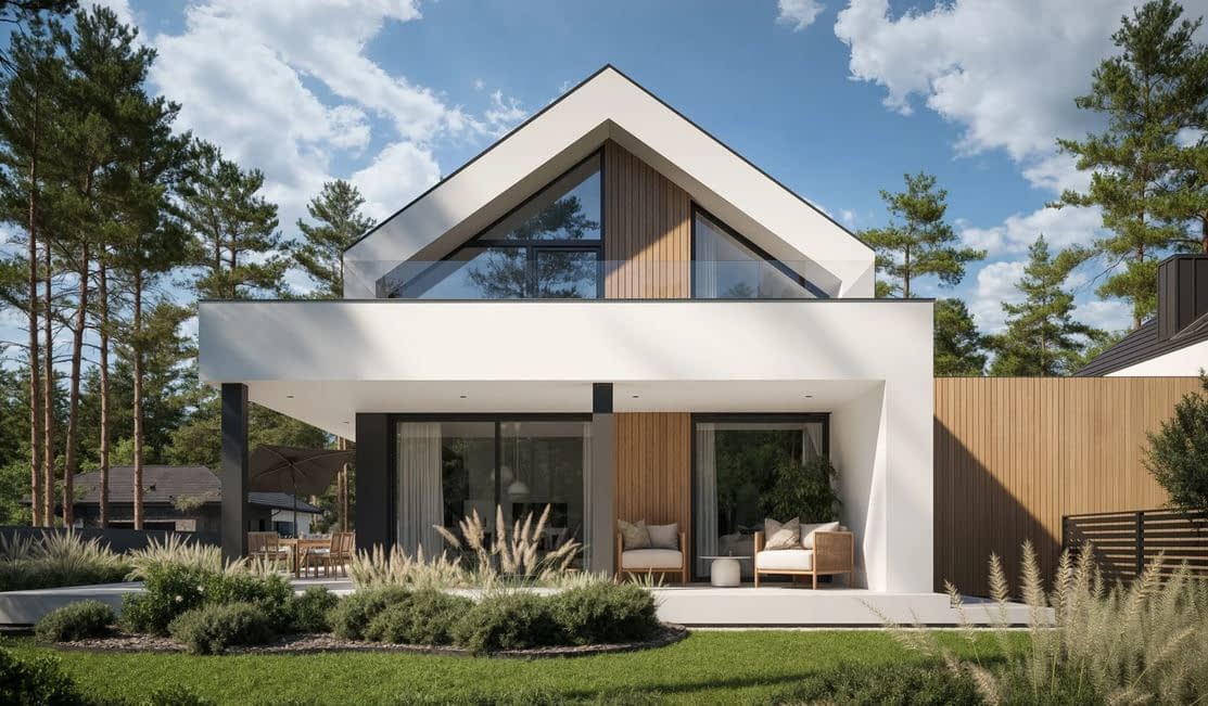 - Elewacja tynk w kolorze białym i grafitowym, połączony z drewnem elewacyjnym lub lamelami elewacyjnymi Super Premium Qulanti