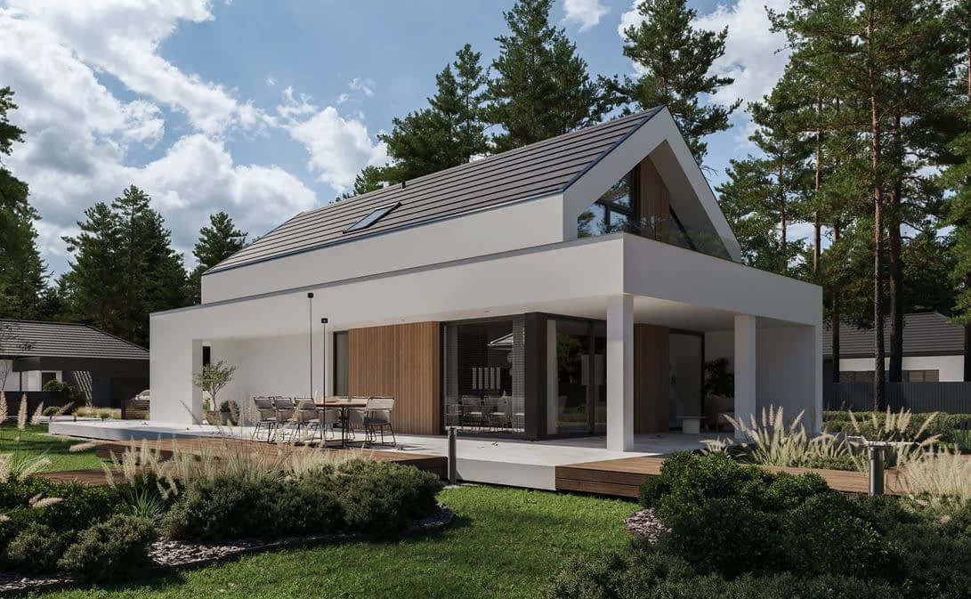 - Elewacja tynk silikonowy w kolorze białym, połączony z drewnem elewacyjnym