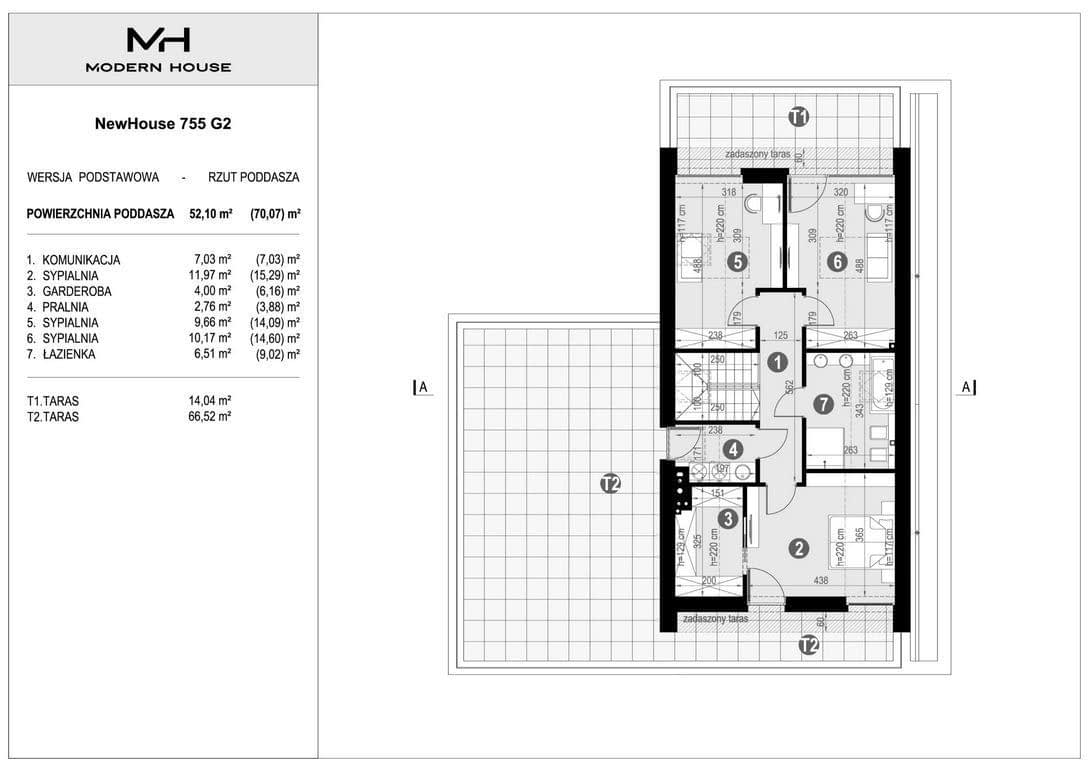 Na poddaszu zaprojektowano trzy komfortowe sypialnie, dwie z nich mają wyjście na taras. Główna sypialnia posiada własną dużą garderobę. Do dyspozycji mieszkańców jest również przestronna łazienka z wanną, prysznicem i dwiema umywalkami. Niewątpliwym atutem tej strefy jest oddzielna pralnia z bezpośrednim wyjściem na taras – praktyczne i wygodne rozwiązanie na co dzień.