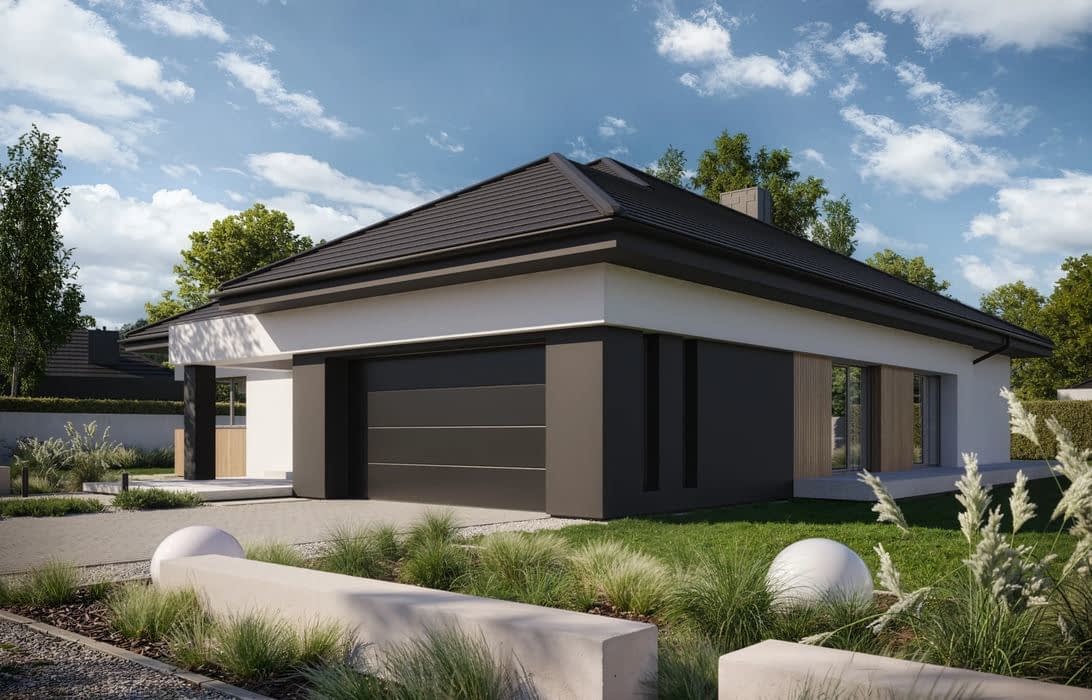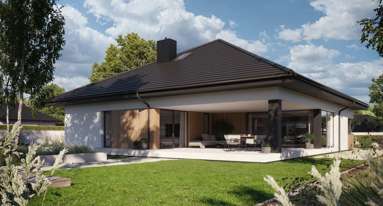 Wariant 6 popularnego projektu NewHouse 761 to odpowiedź na potrzeby rodzin, które marzą o domu parterowym łączącym nowoczesny wygląd, komfortowy układ pomieszczeń i funkcjonalność dopracowaną w każdym szczególe.