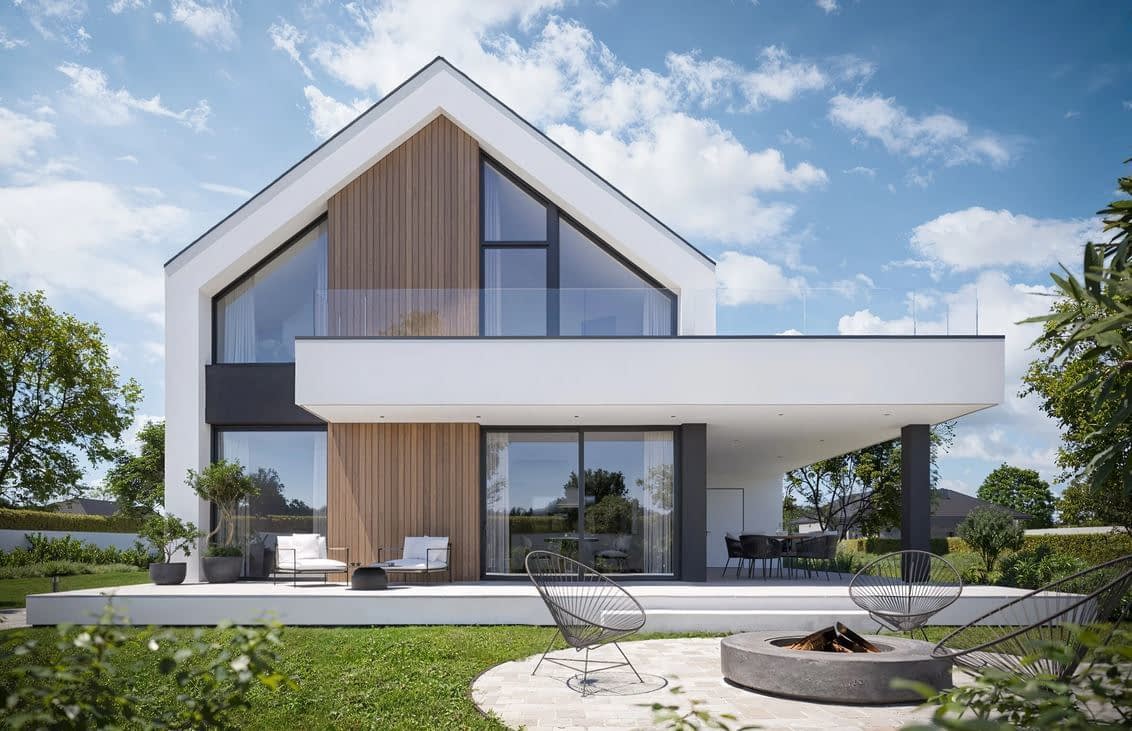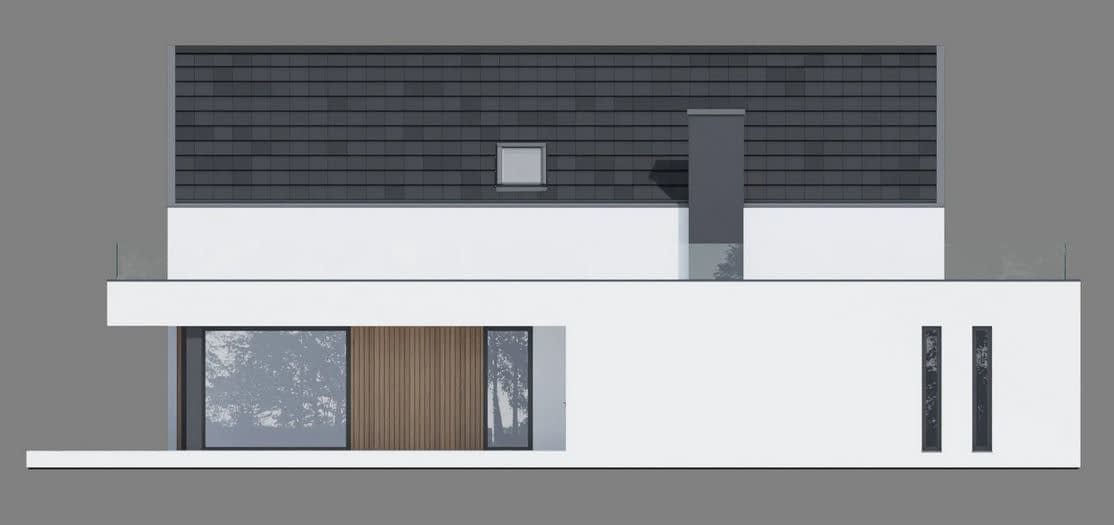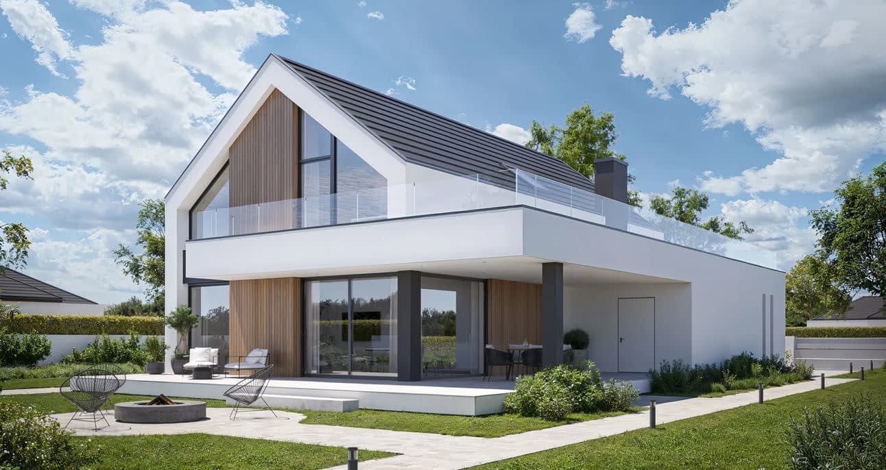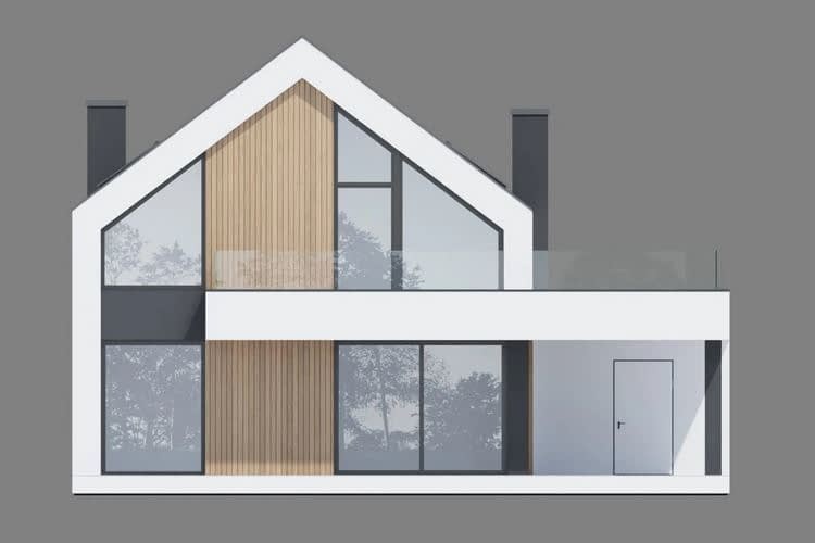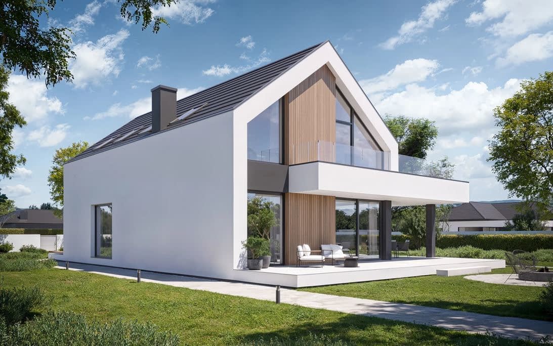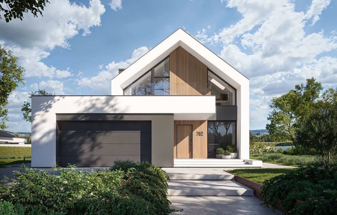 - Elewacja tynk silikonowy w kolorze białym i grafitowym połączony z drewnem elewacyjnym