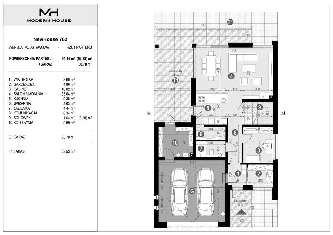 NewHouse 762 to wyjątkowy projekt nowoczesnej stodoły o powierzchni prawie 165 m², idealny dla rodzin 2+2. Bryła budynku, oparta na klasycznym kształcie prostokąta z dwuspadowym dachem, harmonijnie łączy minimalistyczny design z maksymalnym komfortem użytkowania. Funkcjonalny układ pomieszczeń, duże przeszklenia oraz wygodna strefa tarasowa sprawiają, że jest to idealny dom dla osób ceniących nowoczesność i kontakt z naturą.