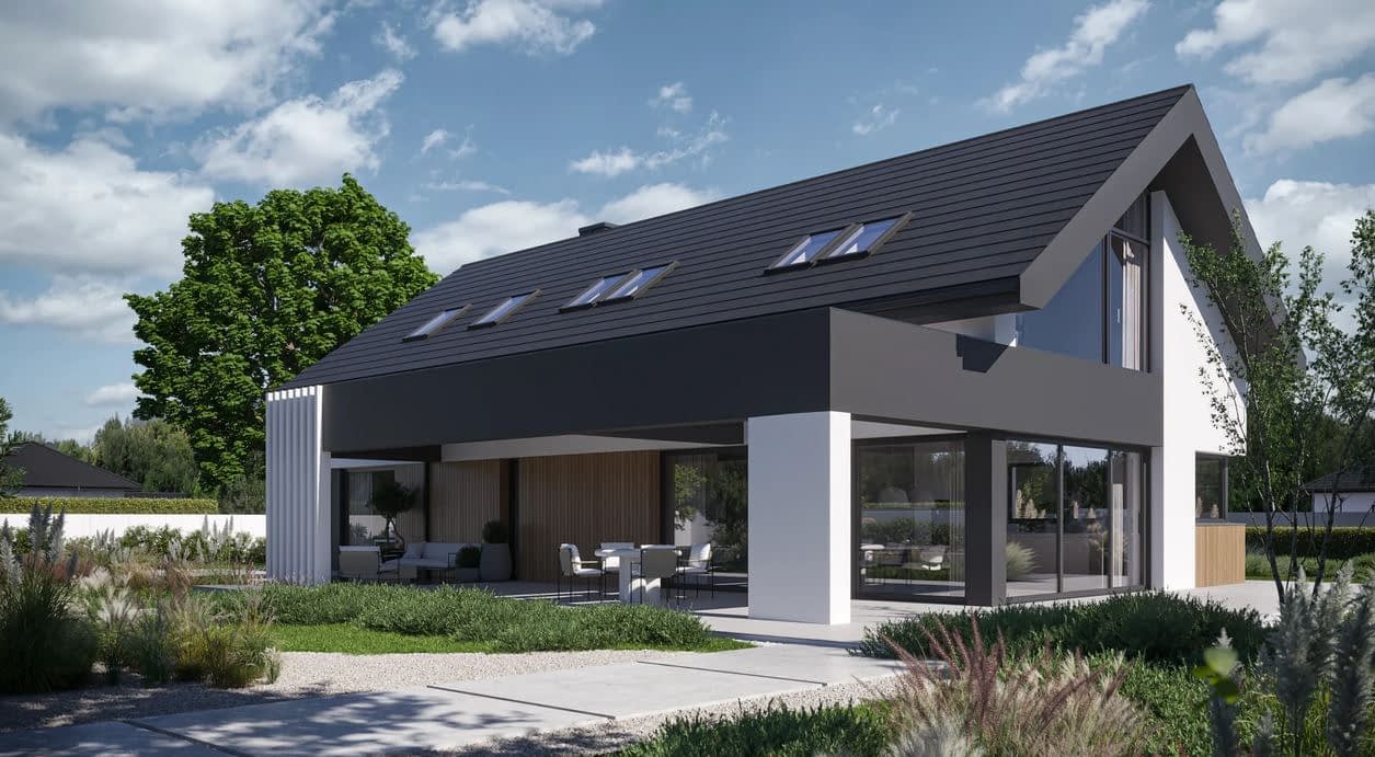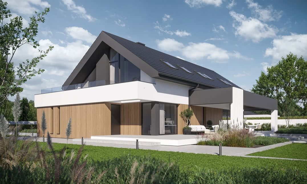 - Elewacja Tynk silikonowy w kolorze białym i grafitowym połączony z drewnem elewacyjnym lub lamelami elewacyjnymi Super Premium Qulanti
