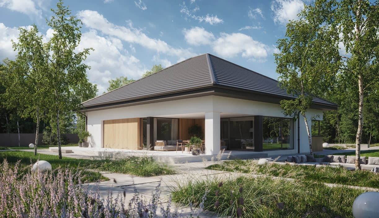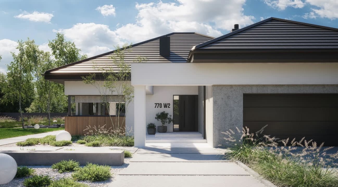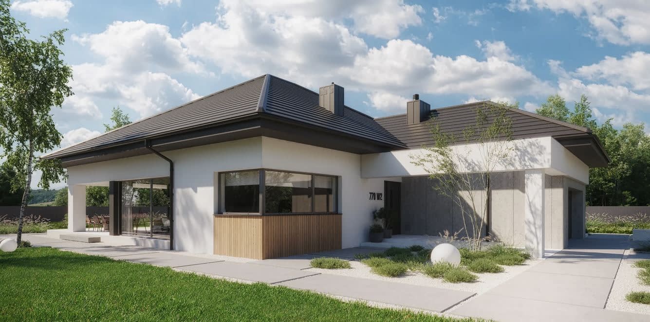To parterowy projekt domu z 4 sypialniami, który spełni oczekiwania najbardziej wymagających inwestorów. Przestronny salon, funkcjonalna kuchnia, prywatna strefa rodziców, komfortowe zaplecze gospodarcze i elegancka architektura sprawiają, że NewHouse 770 w2 to dom zaprojektowany z myślą o realnym komforcie życia.