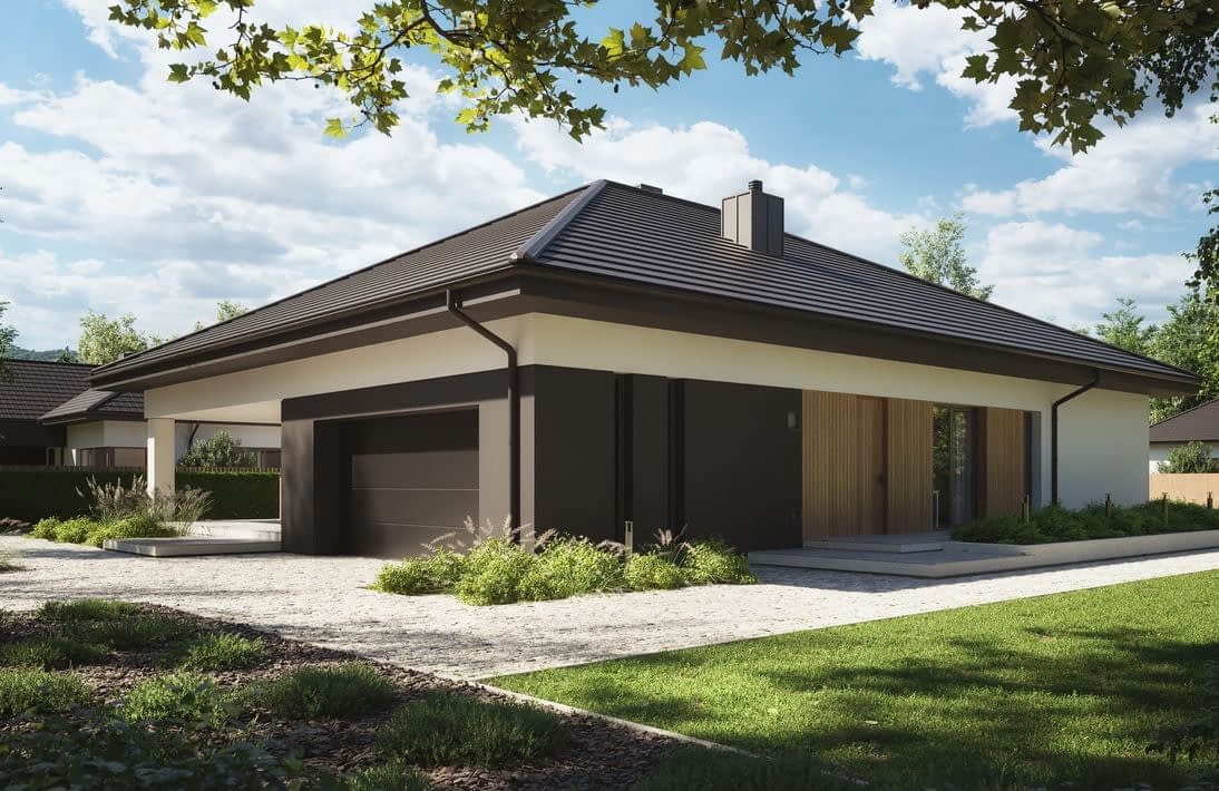 NewHouse 771 w2 to nowoczesny parterowy projekt domu z 3 sypialniami, który zapewnia wygodę codziennego życia bez konieczności budowy piętra.