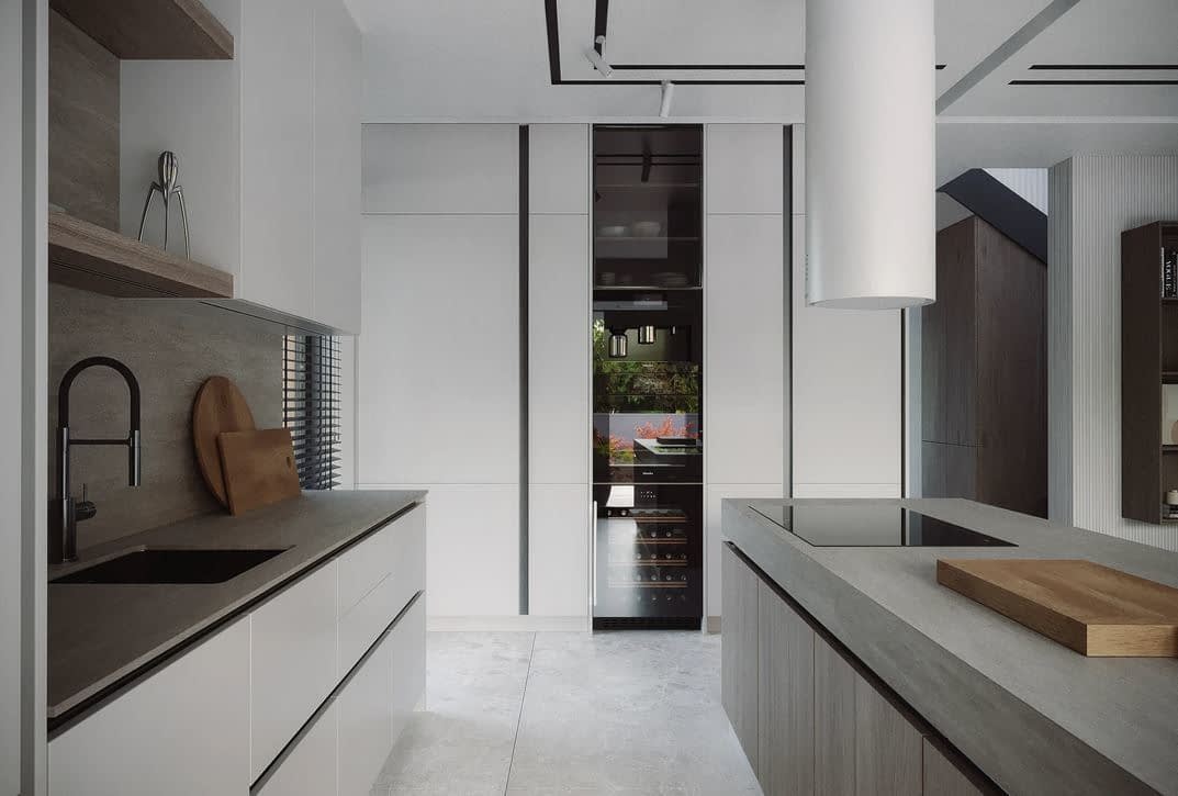 Przy kuchni zaprojektowano ukrytą w zabudowie meblowej spiżarnię, która pomieści zapasy, przetwory i sprzęty kuchenne. Obok znajduje się łazienka z prysznicem, a dalej dodatkowy pokój, który sprawdzi się jako gabinet do pracy zdalnej, pokój gościnny lub sypialnia dla seniora.