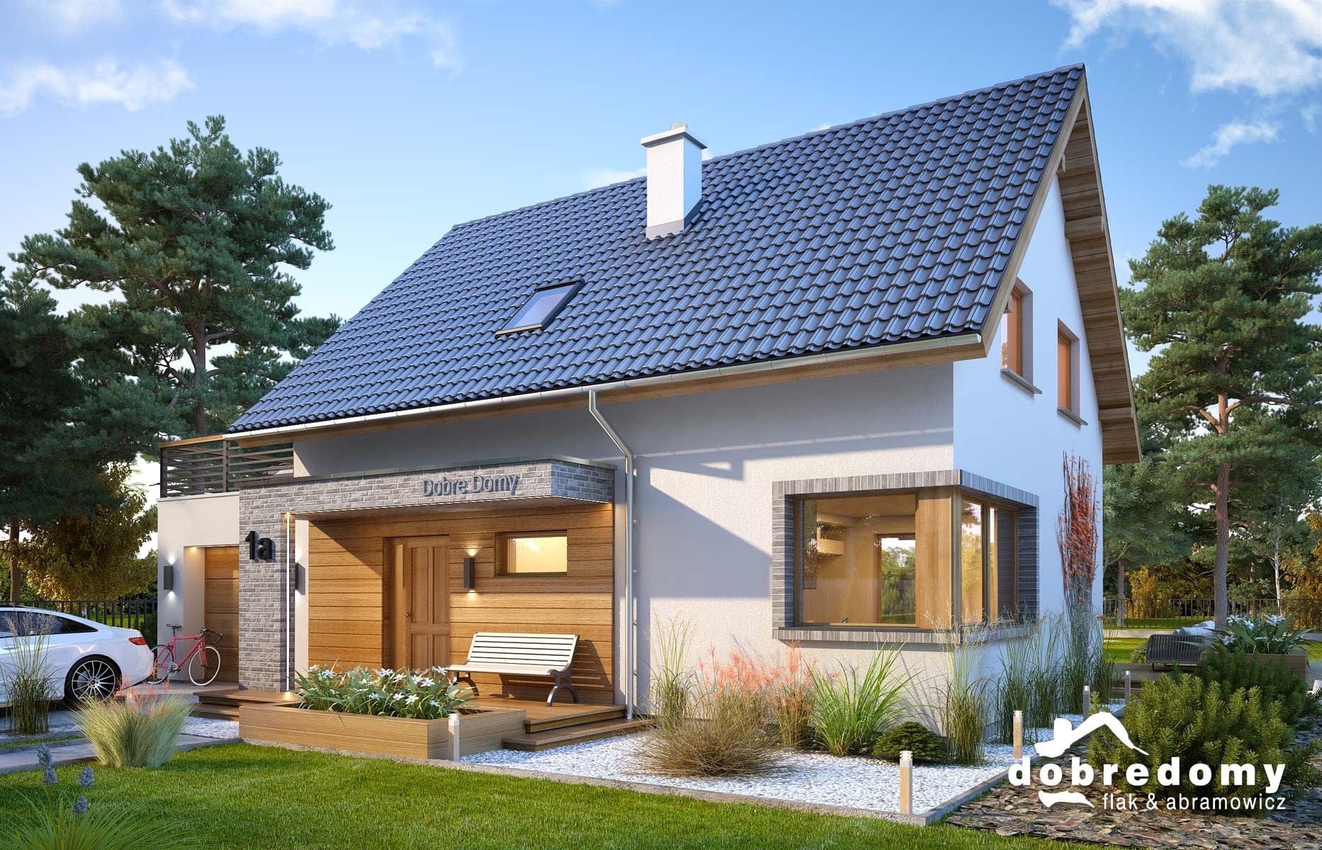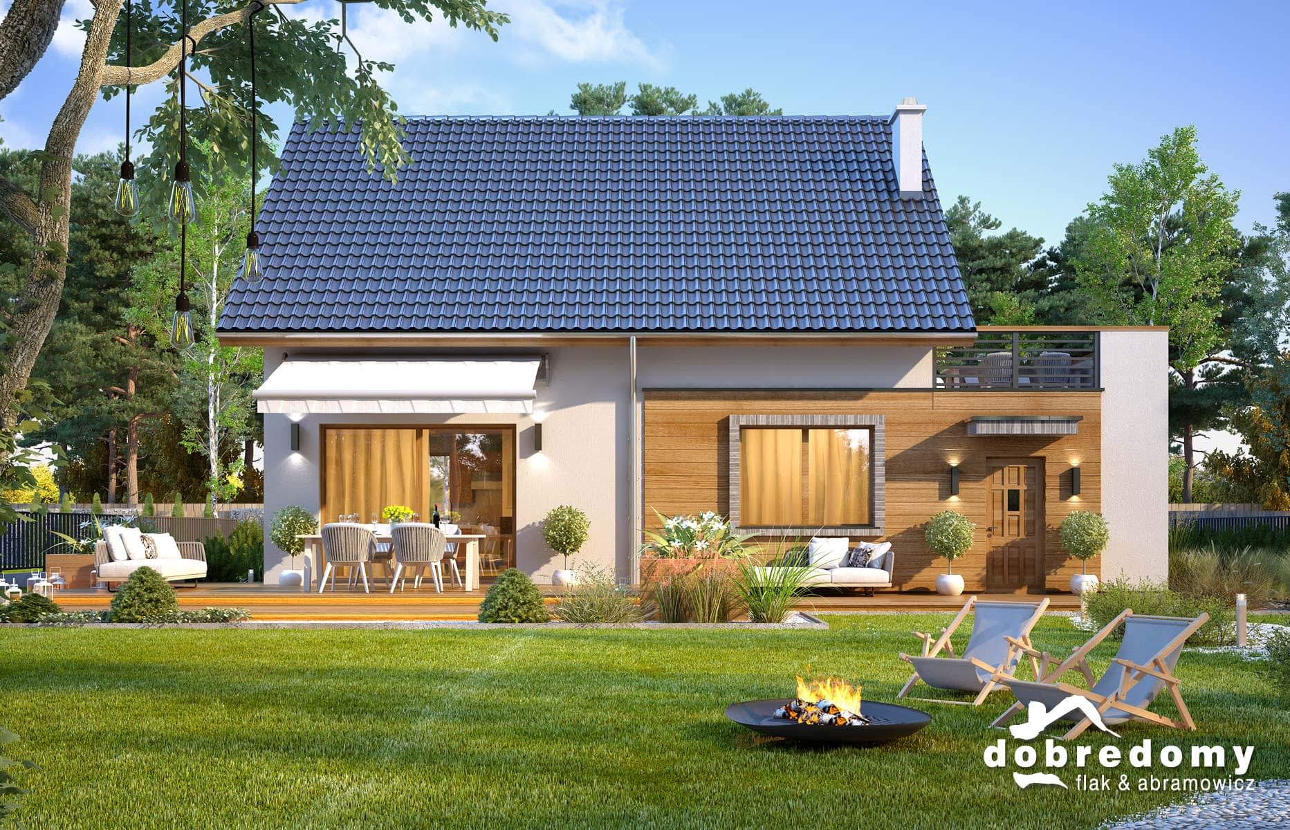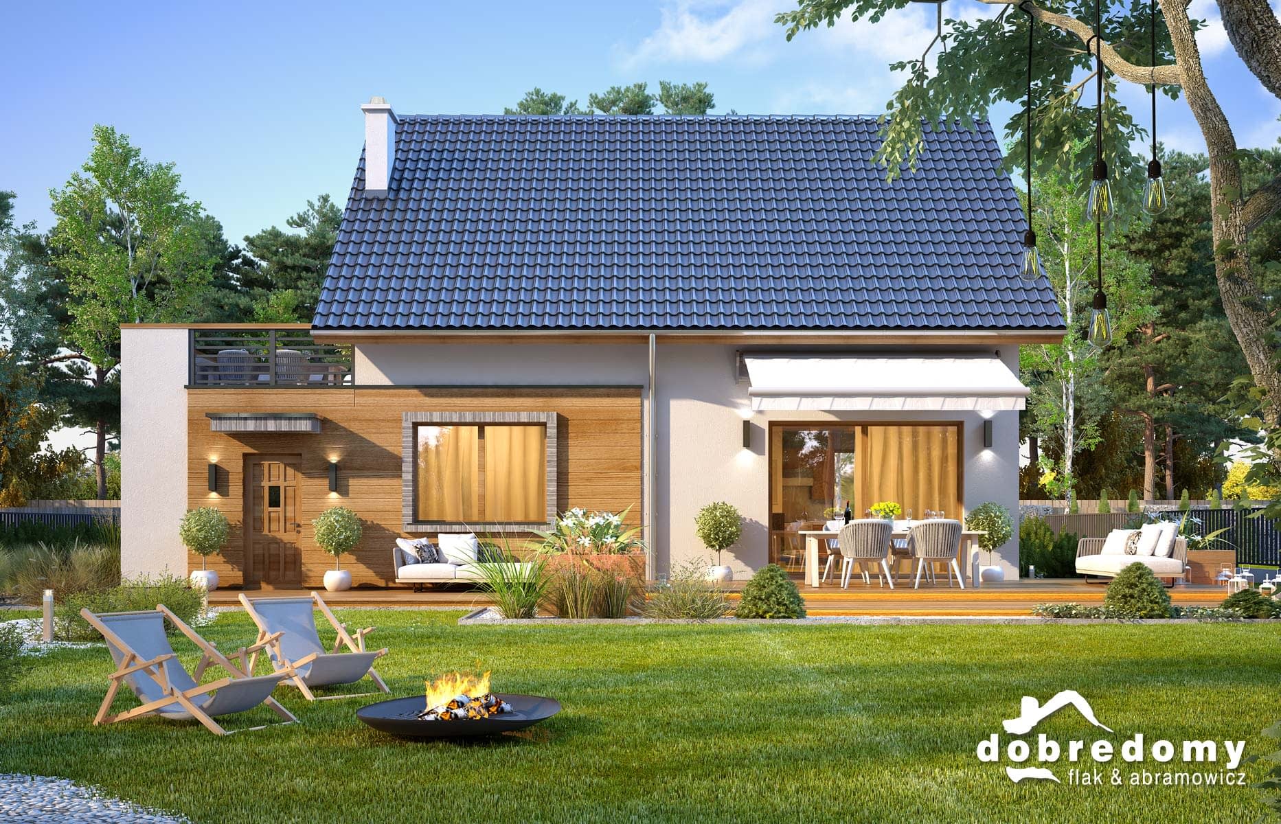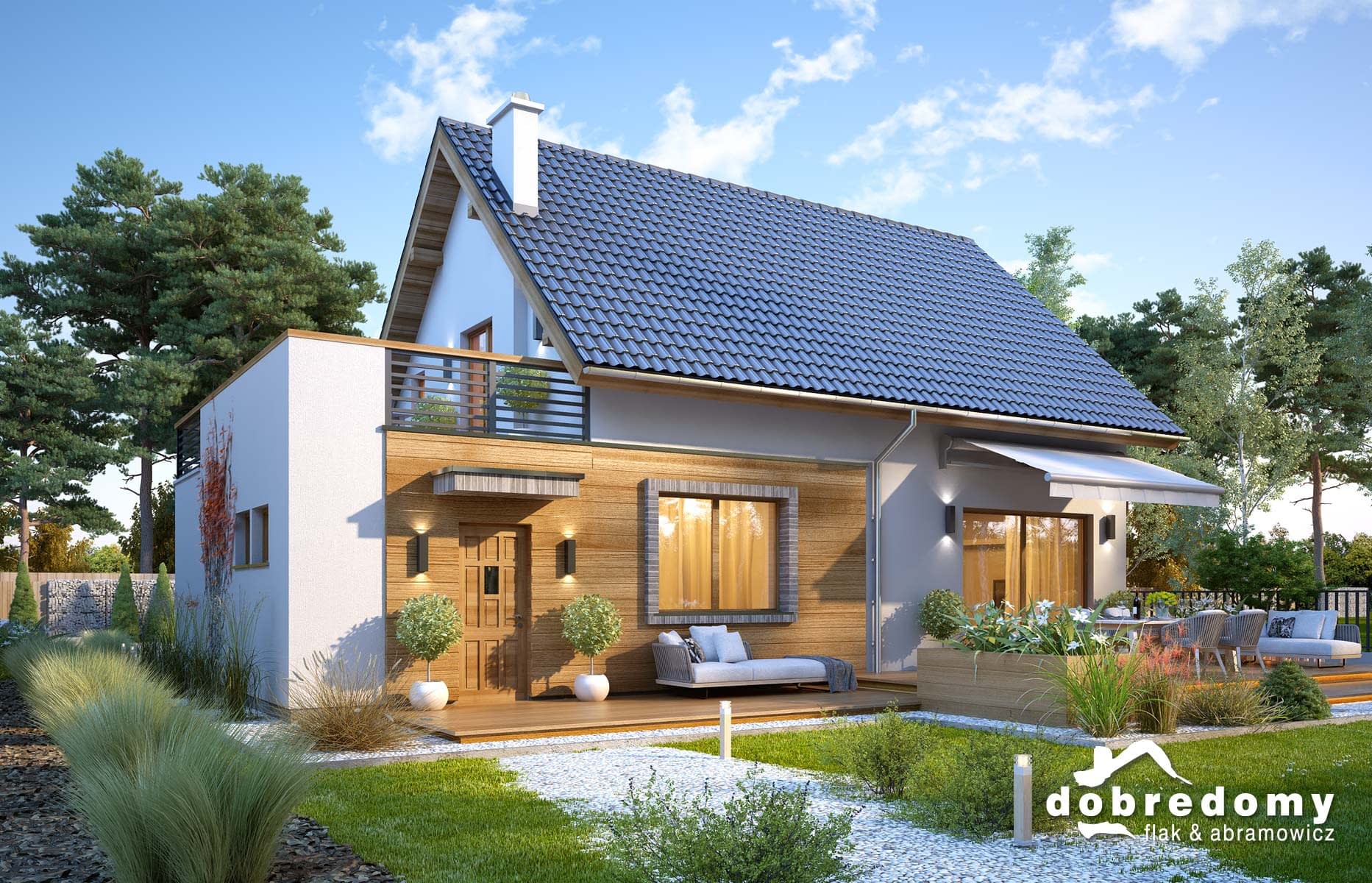 Elewacje pokryte tynkiem strukturalnym w systemie ociepleń Termo Organika oraz okładziną drewnianą i kamienną. Pokrycie dachu - dachówka ceramiczna lub cementowa CREATON.
