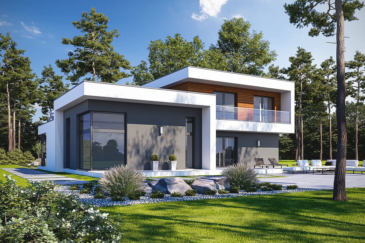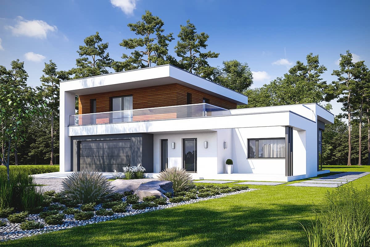 NOWATORSKI D57 to nowoczesny, komfortowy piętrowy dom z płaskim dachem.