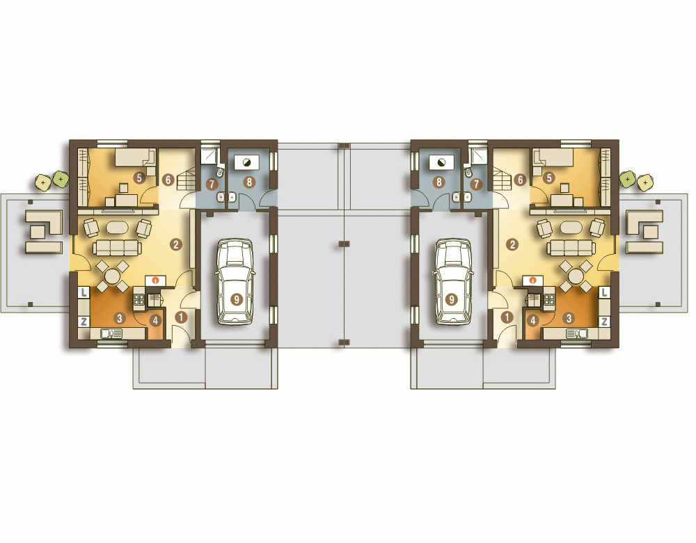 (Uwaga: ten projekt typu bliźniak oferujemy tylko jako dom dwulokalowy).Opis dotyczy jednego segmentu: Nowinka jest projektem domu, który spełnia wymogi współczesnego budownictwa jednorodzinnego. Jest to dom ekonomiczny w użytkowaniu ze względu na zwartą, prostą bryłę, nieskomplikowany dach oraz skumulowane łazienki i kotłownia w jednym pionie w celu obniżenia kosztów eksploatacji i budowy. Projekt tego kompaktowego domu przewiduje na parterze salon z otwartą kuchnią ze spiżarnią, pokój gościnny, wiatrołap, łazienkę. W bryle budynku został zawarty również garaż oraz duża kotłownia przewidziana na paliwo stałe. Poddasze przeznaczono na trzy sypialnie, łazienkę i garderobę. Z boku budynku zaprojektowano wiatę.Wizualizacje salonu, łazienki oraz sypialni mają za zadanie pomóc w wyobrażeniu wnętrza. Umeblowanie i wyposażenie domu zostało pokazane jako przykładowe i ma służyć dowolnej inspiracji. Wierzymy, że wnętrza prawdziwego domu, które powstaną na bazie projektu Nowinka, będą stanowiły dla państwa nieustające źródło radości.