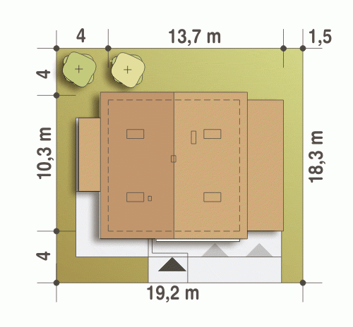 - Minimalne wymiary działki18.3 x 19.2m