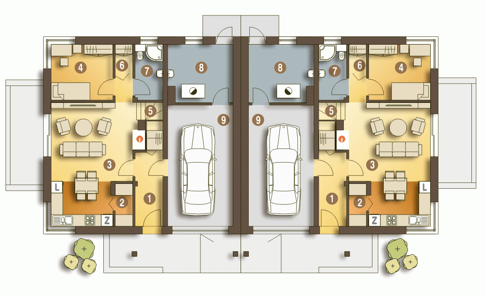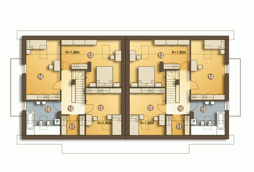 (Uwaga: projekty typu bliźniak oferujemy jako domy dwulokalowe, projekt można zamówić również w zabudowie bliźniaczej)Opis dotyczy jednego segmentu:Nowinka IV to kompaktowy projekt domu przeznaczony dla rodziny 2+2 - łączący styl tradycyjny z nowoczesnym. Ze względu na zwartą bryłę i rozmieszczenie pomieszczeń technologicznych oraz sanitarnych Nowinka IV to projekt ekonomiczny w budowie i eksploatacji. Bryła budynku jest prosta, zwarta i przykryta dwuspadowym dachem o kącie nachylenia połaci dachowych 35 st. Projekt przewiduje 5 pokoi wraz z salonem, otwartą kuchnię za spiżarnią, dwie łazienki, garderoby pod schodami oraz przy pokoju na parterze a także miejsce na nowoczesny centralnie zlokalizowany kominek. W projekcie zawarto także dużą kotłownię za garażem na dowolny piec CO. W bryle budynku zaprojektowano garaż jednostanowiskowy .