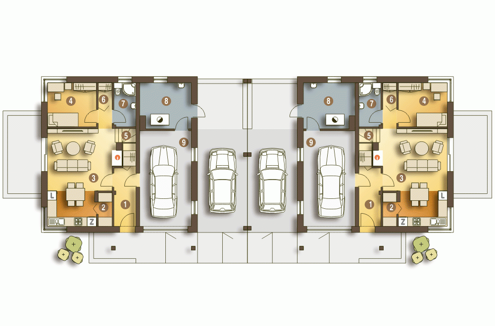 (Uwaga: ten projekt typu bliźniak oferujemy tylko jako dom dwulokalowy).Opis dotyczy jednego segmentu:Nowinka IV to kompaktowy projekt domu przeznaczony dla rodziny 2+2.Propozycja ta łączy styl tradycyjny z nowoczesnym. Ze względu na zwartą bryłę i rozmieszczenie pomieszczeń technologicznych oraz sanitarnych Nowinka IV to projekt ekonomiczny w budowie i eksploatacji. Bryła budynku jest prosta, zwarta i przykryta dwuspadowym dachem o kącie nachylenia połaci dachowych 35 st. Projekt przewiduje 5 pokoi wraz z salonem, otwartą kuchnię za spiżarnią, dwie łazienki, garderoby pod schodami oraz przy pokoju na parterze a także miejsce na nowoczesny centralnie zlokalizowany kominek. W projekcie zawarto także dużą kotłownię za garażem na dowolny piec CO. W bryle budynku zaprojektowano garaż jednostanowiskowy .Dobudowana wiata w projekcie domu Nowinka IV zapewnia drugie miejsce postojowe dla rodzin posiadających dwa samochody.