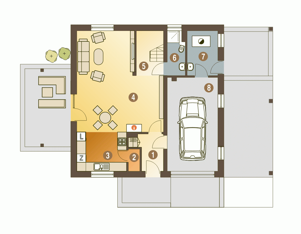 Nowinka V jest projektem domu, który spełnia wymogi współczesnego budownictwa jednorodzinnego. Jest to dom ekonomiczny w użytkowaniu ze względu na zwartą, prostą bryłę, nieskomplikowany dach oraz skumulowane łazienki wraz z kotłownią w jednym pionie w celu obniżenia kosztów eksploatacji i budowy. Projekt obejmuje na parterze salon z otwartą kuchnią ze spiżarnią, wiatrołap oraz łazienkę. W bryle budynku zawarto również garaż oraz dużą kotłownię przewidzianą na paliwo stałe. Poddasze to trzy sypialnie, łazienka i garderoba. Z boku znajduje się wiata z dodatkowym miejscem postojowym.Wizualizacje salonu, łazienki oraz sypialni mają za zadanie pomóc w wyobrażeniu wnętrza. Umeblowanie i wyposażenie domu zostało pokazane jako przykładowe i ma służyć dowolnej inspiracji. Wierzymy, że wnętrza prawdziwego domu, które powstaną na bazie projektu Nowinka, będą stanowiły dla państwa nieustające źródło radości.