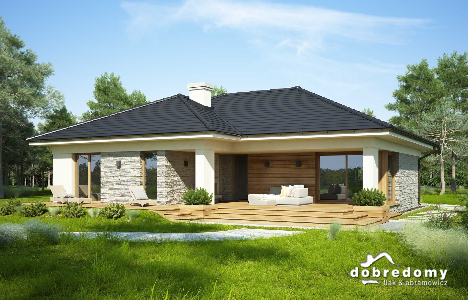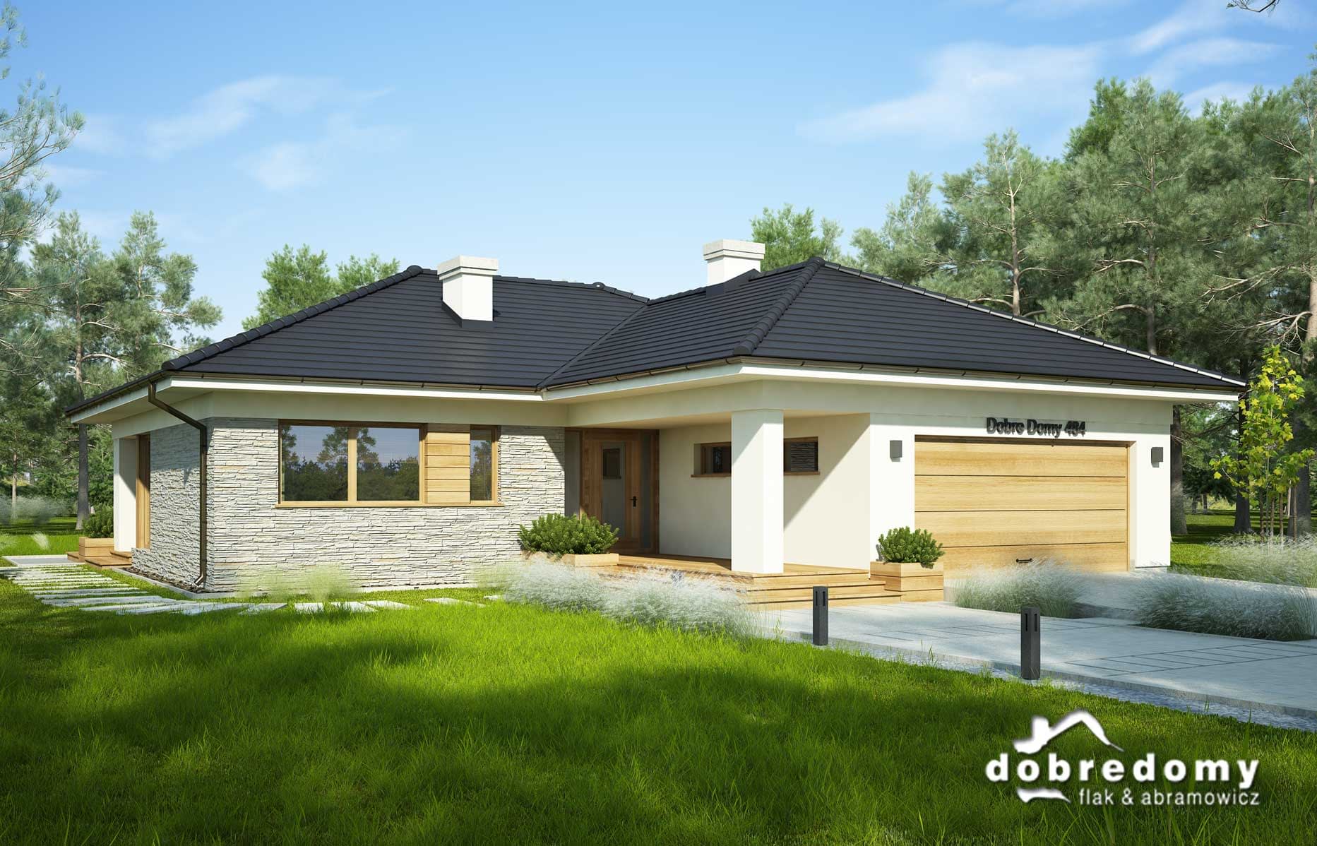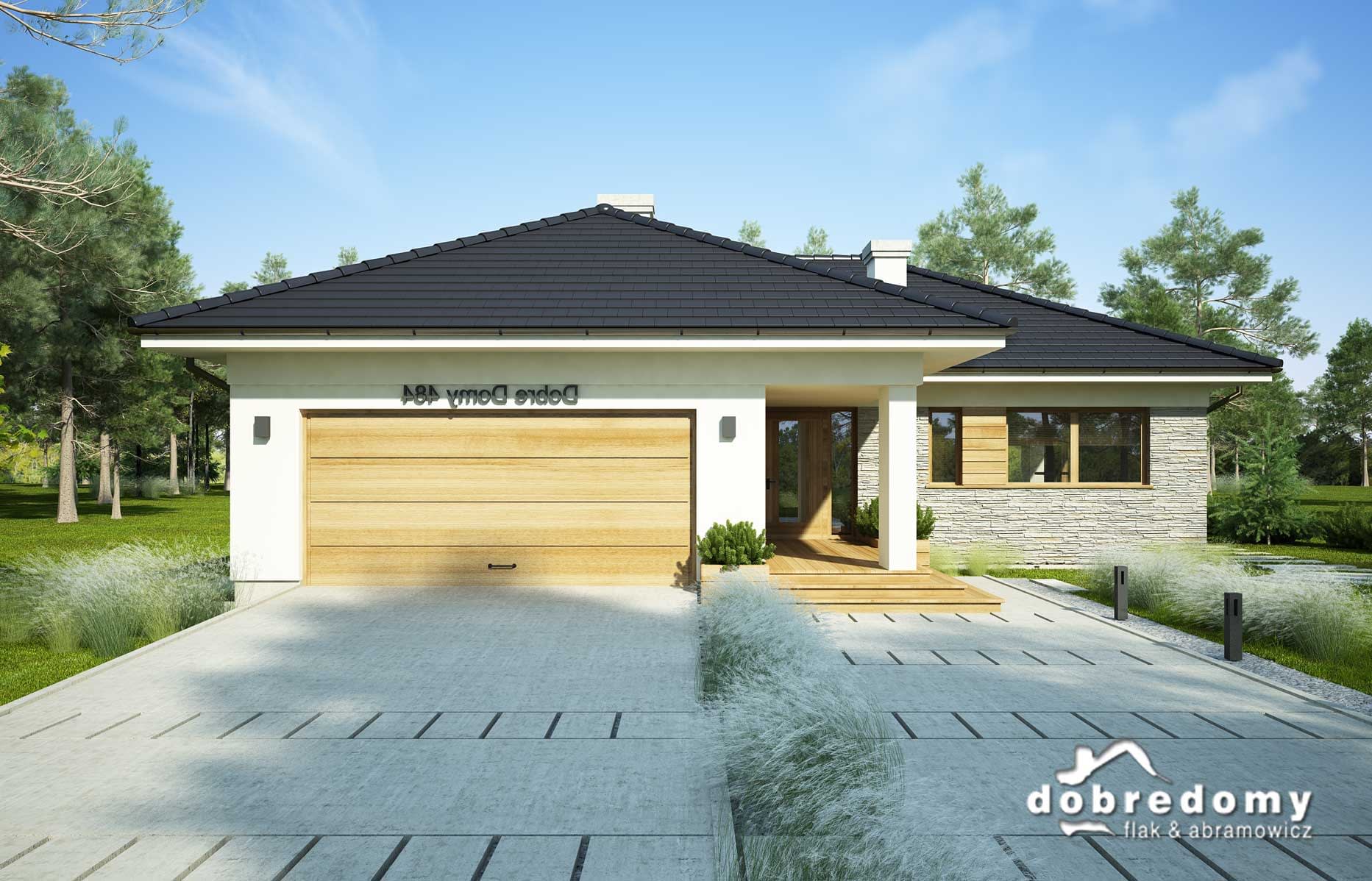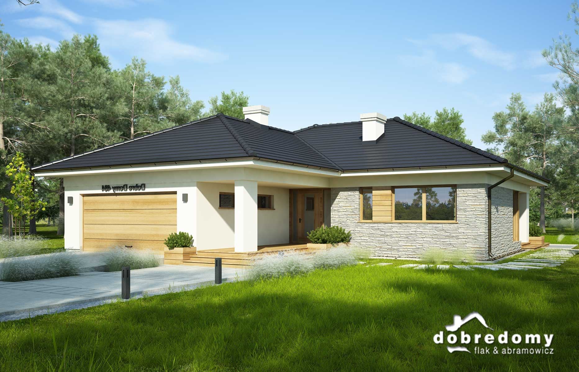 Dom parterowy z dwustanowiskowym garażem, dla 4-osobowej rodziny. Część dzienna to salon połączony z jadalnią i kuchnią. Część prywatna to trzy sypialnie, łazienka i wc. Dodatkowe pomieszczenia w domu to spiżarnia, garderoba i pralnia. Całości dopełnia kotłownia i garaż.
