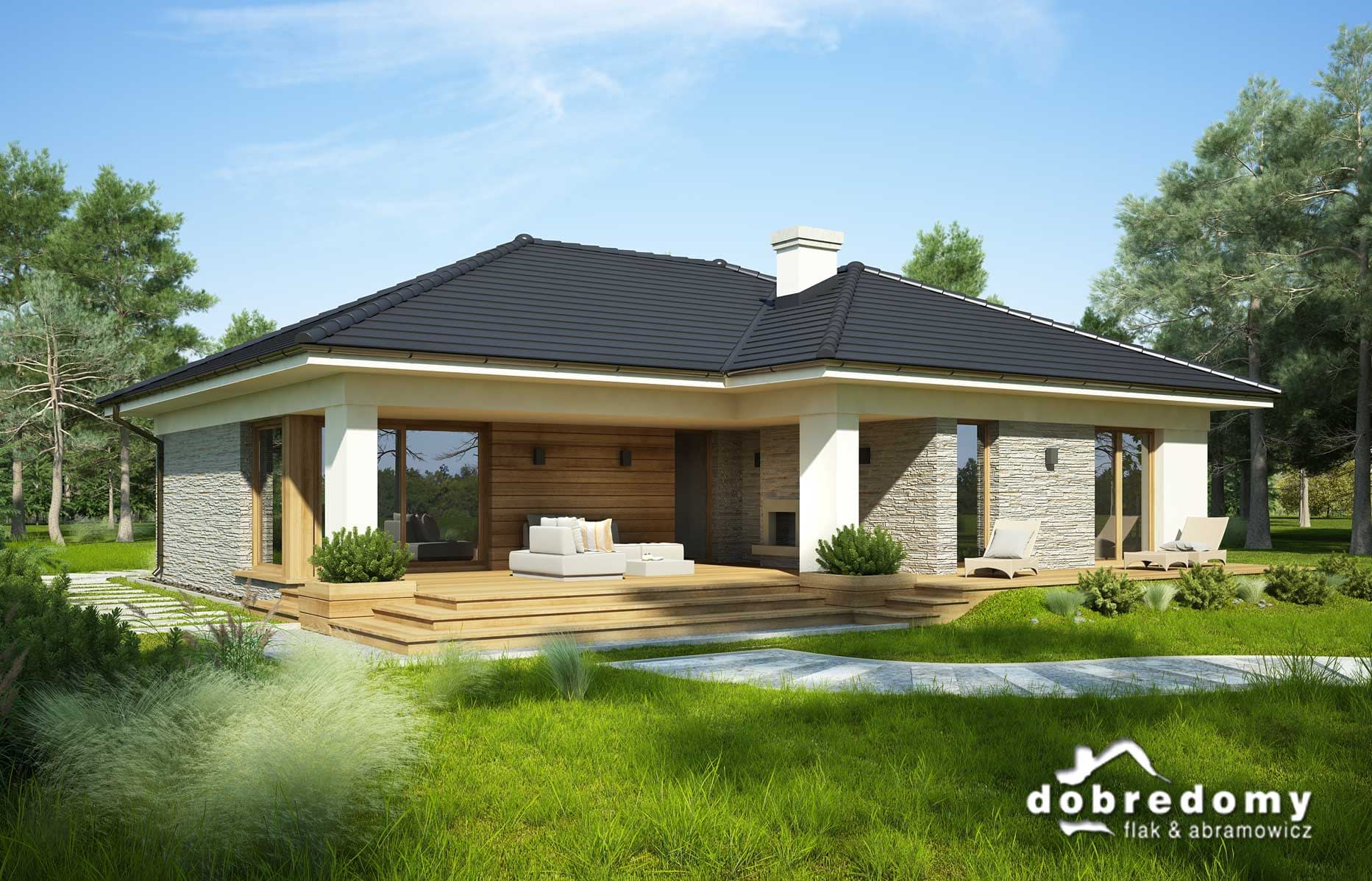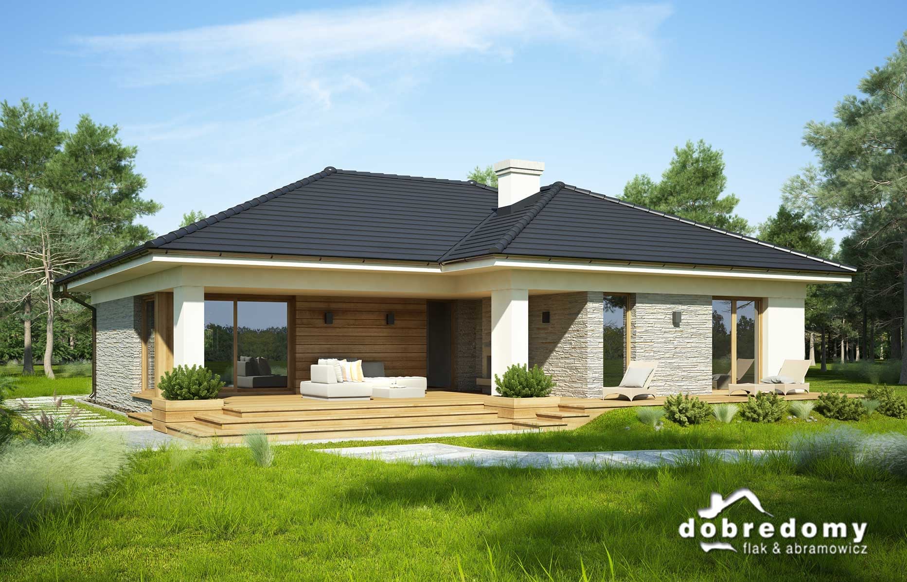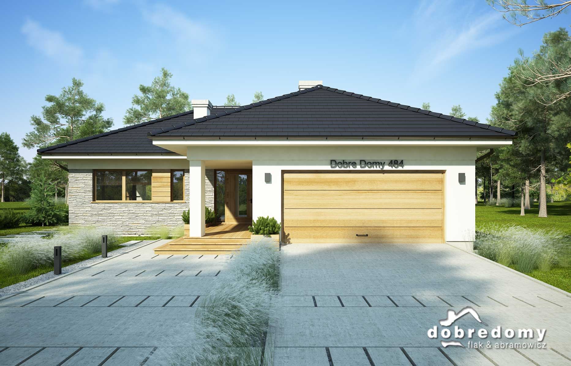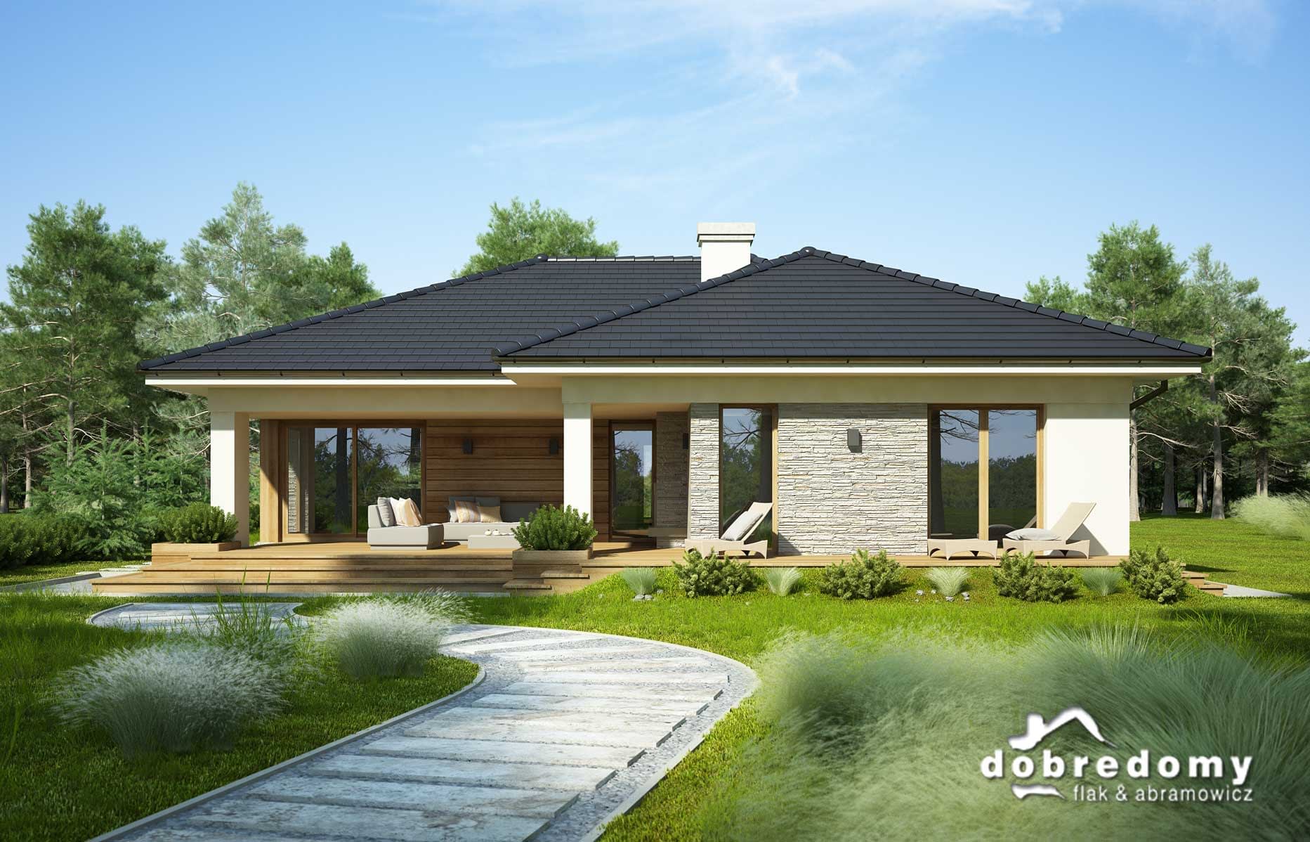 Dom parterowy z dwustanowiskowym garażem, dla 4-osobowej rodziny. Część dzienna to salon połączony z jadalnią i kuchnią. Część prywatna to trzy sypialnie, łazienka i wc. Dodatkowe pomieszczenia w domu to spiżarnia, garderoba i pralnia. Całości dopełnia kotłownia i garaż.