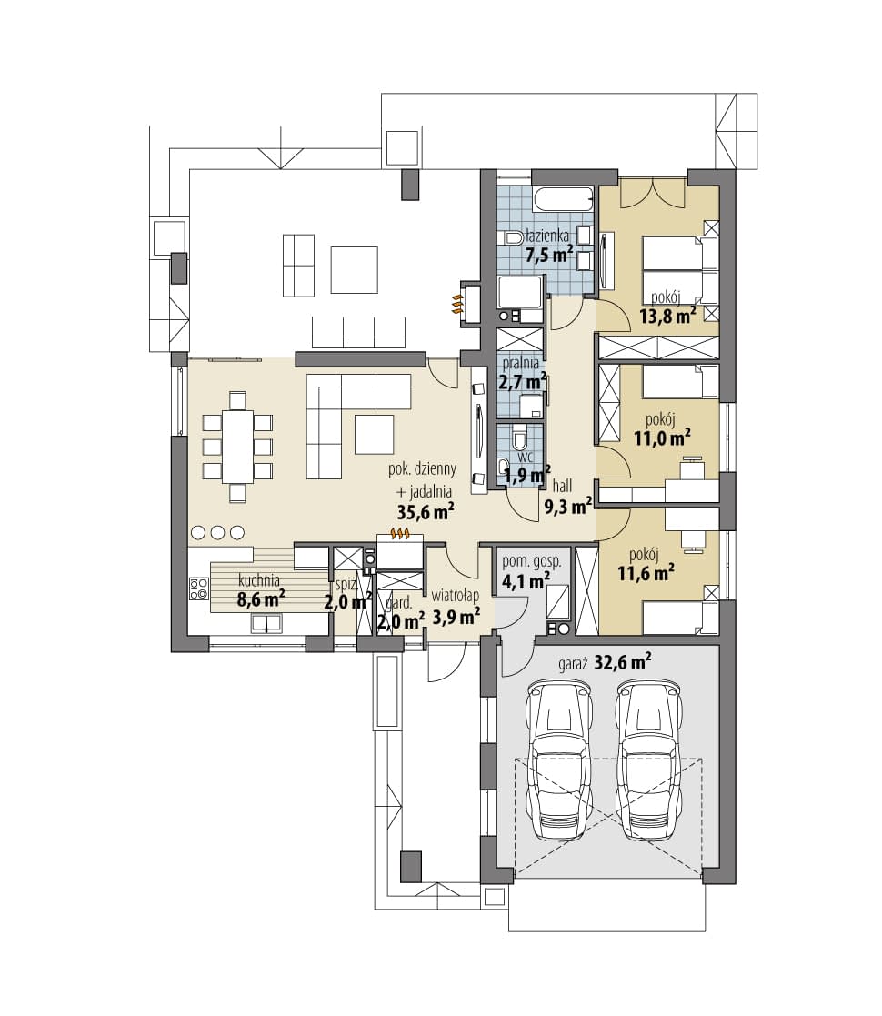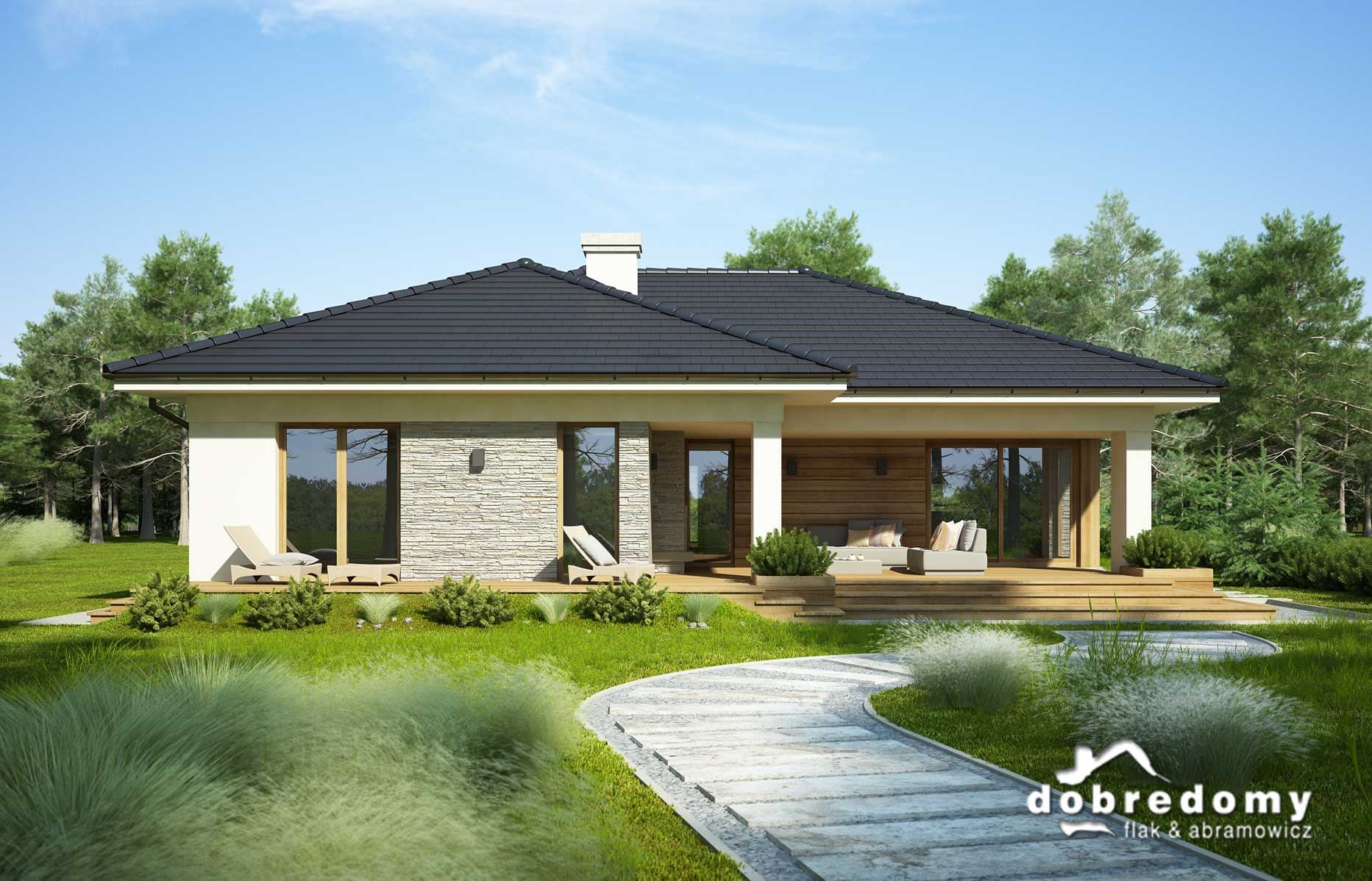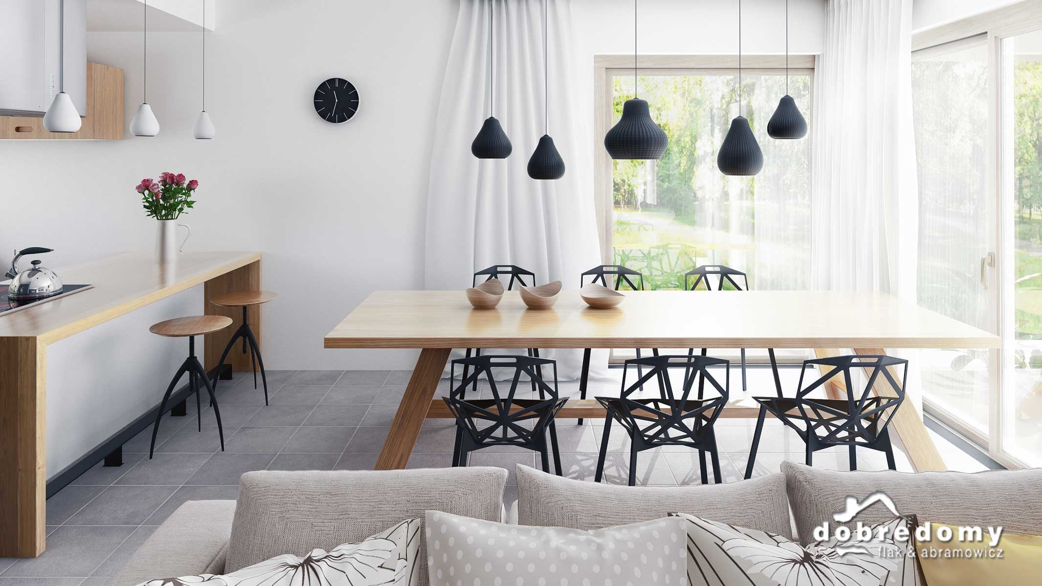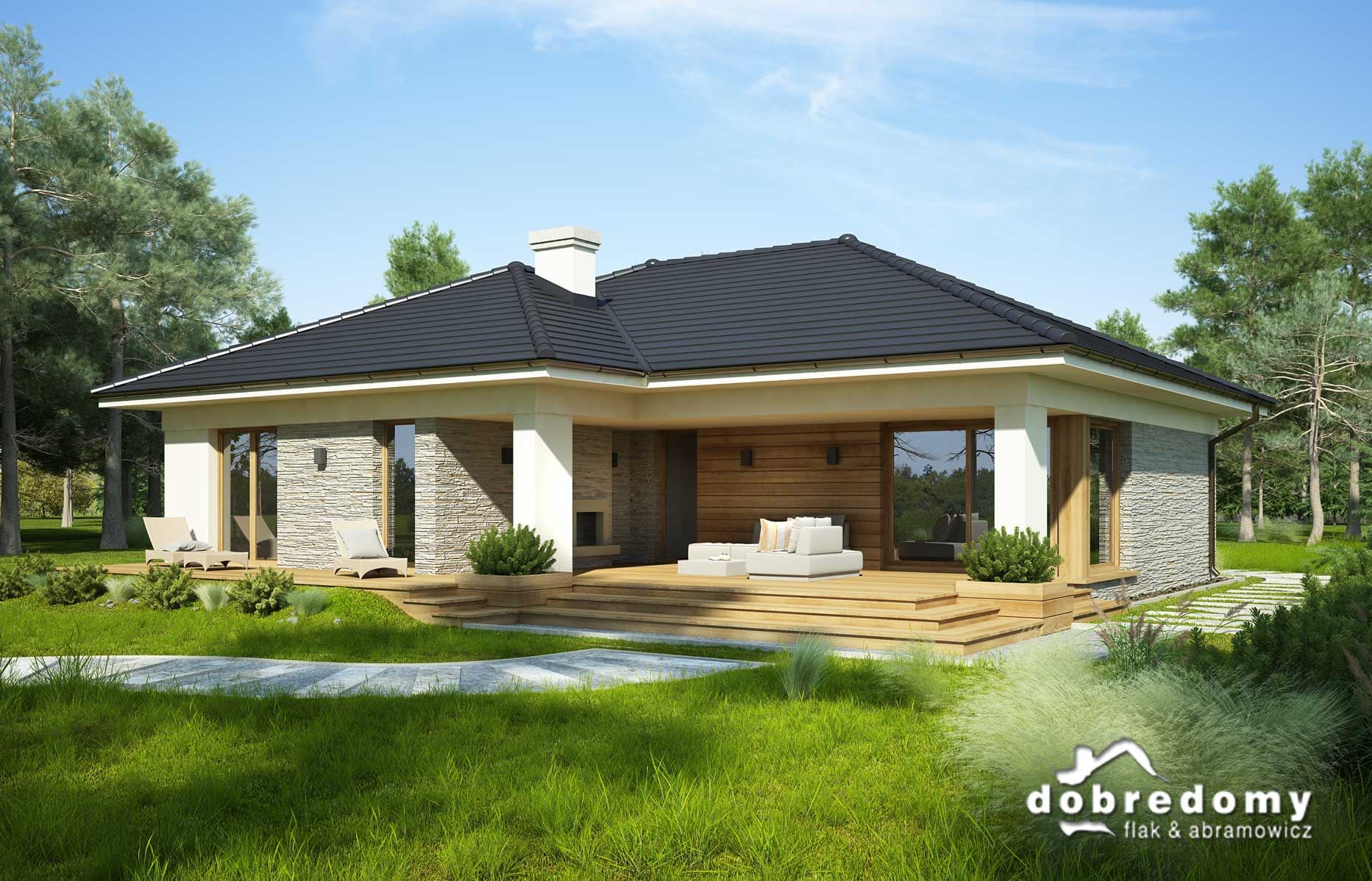 Dom parterowy z dwustanowiskowym garażem, dla 4-osobowej rodziny. Część dzienna to salon połączony z jadalnią i kuchnią. Część prywatna to trzy sypialnie, łazienka i wc. Dodatkowe pomieszczenia w domu to spiżarnia, garderoba i pralnia. Całości dopełnia kotłownia i garaż.