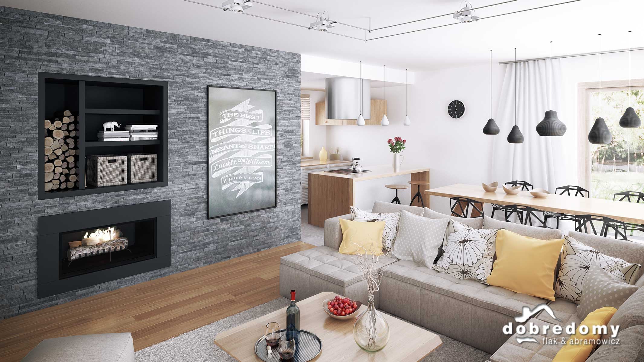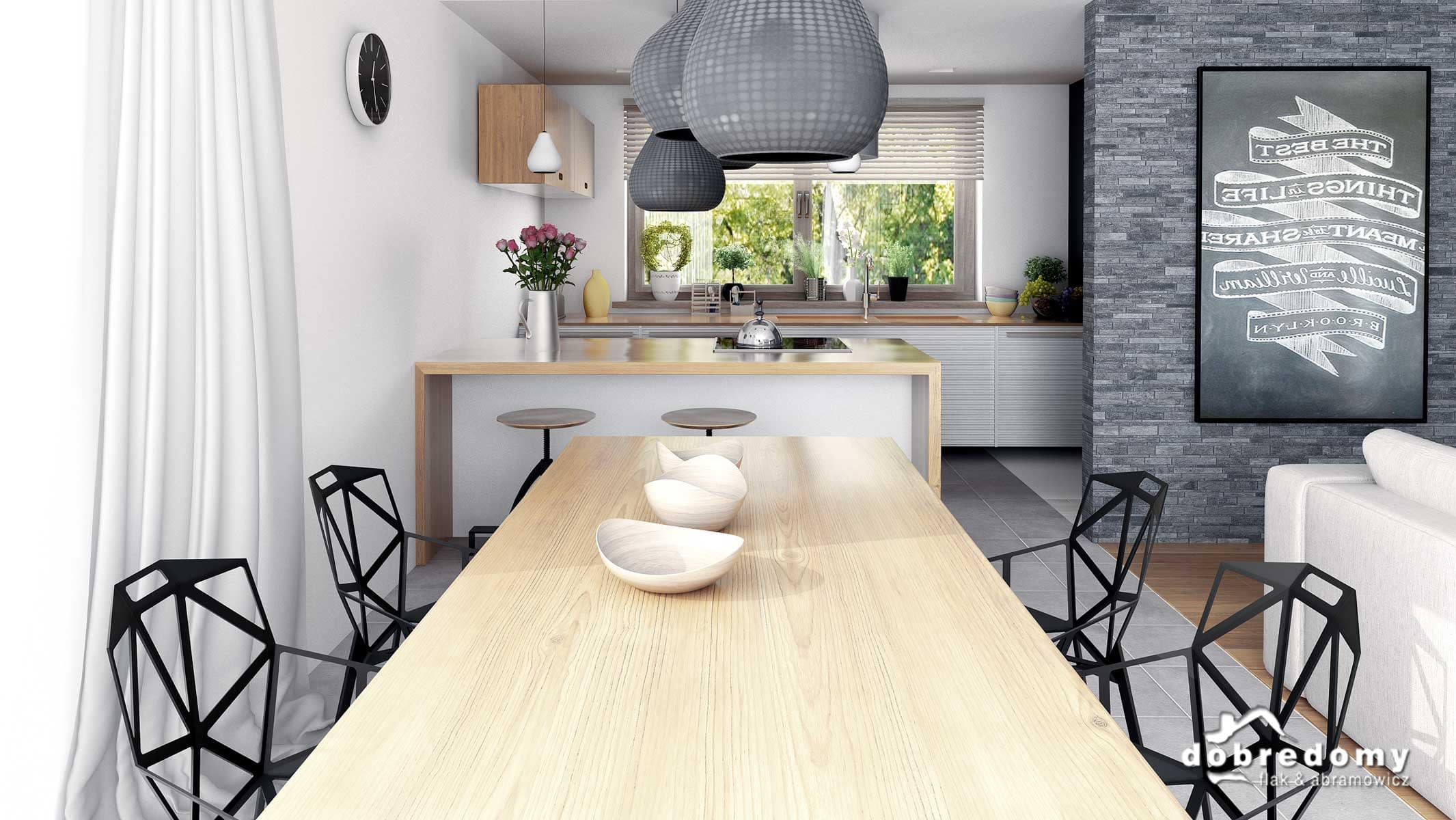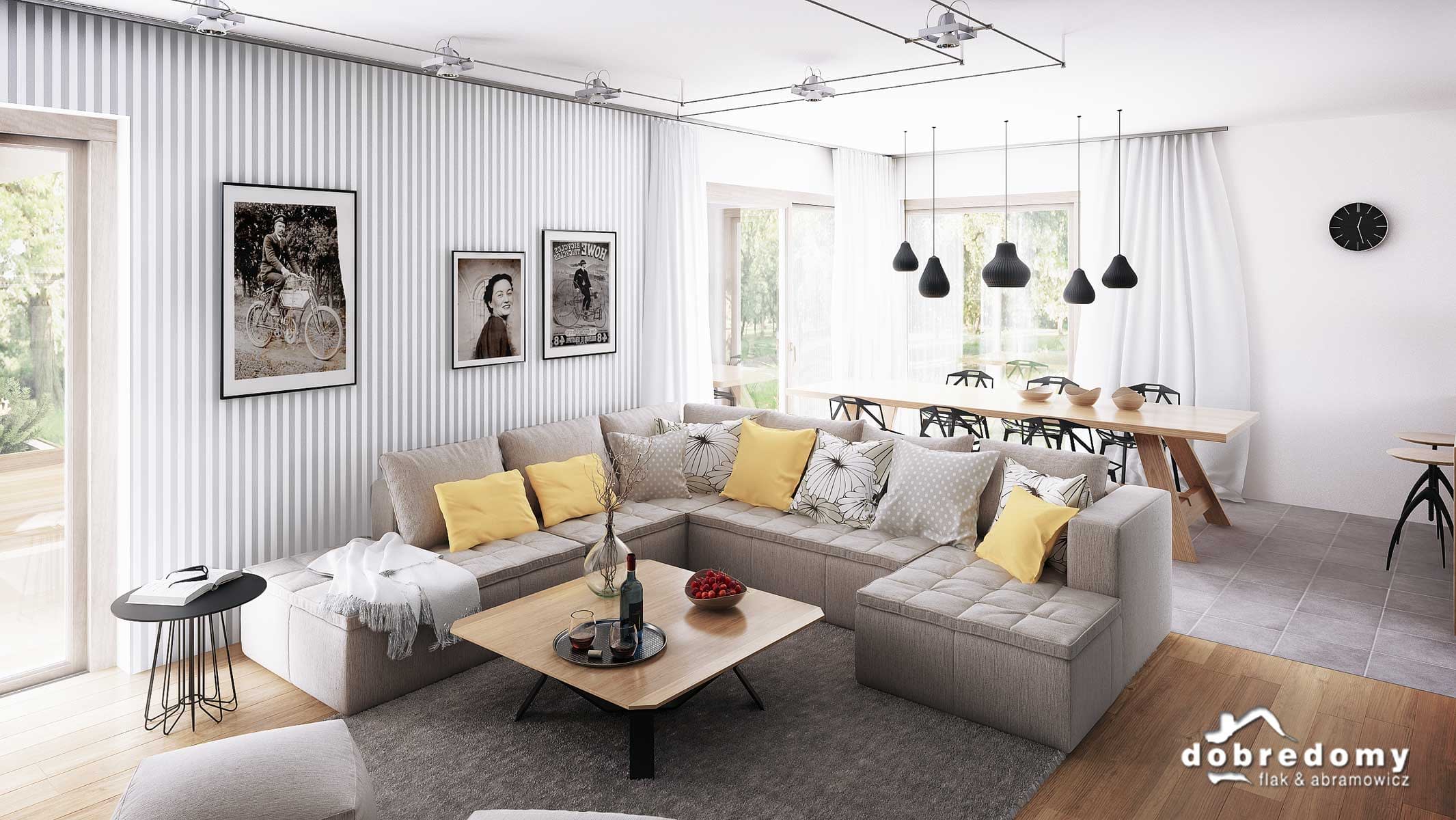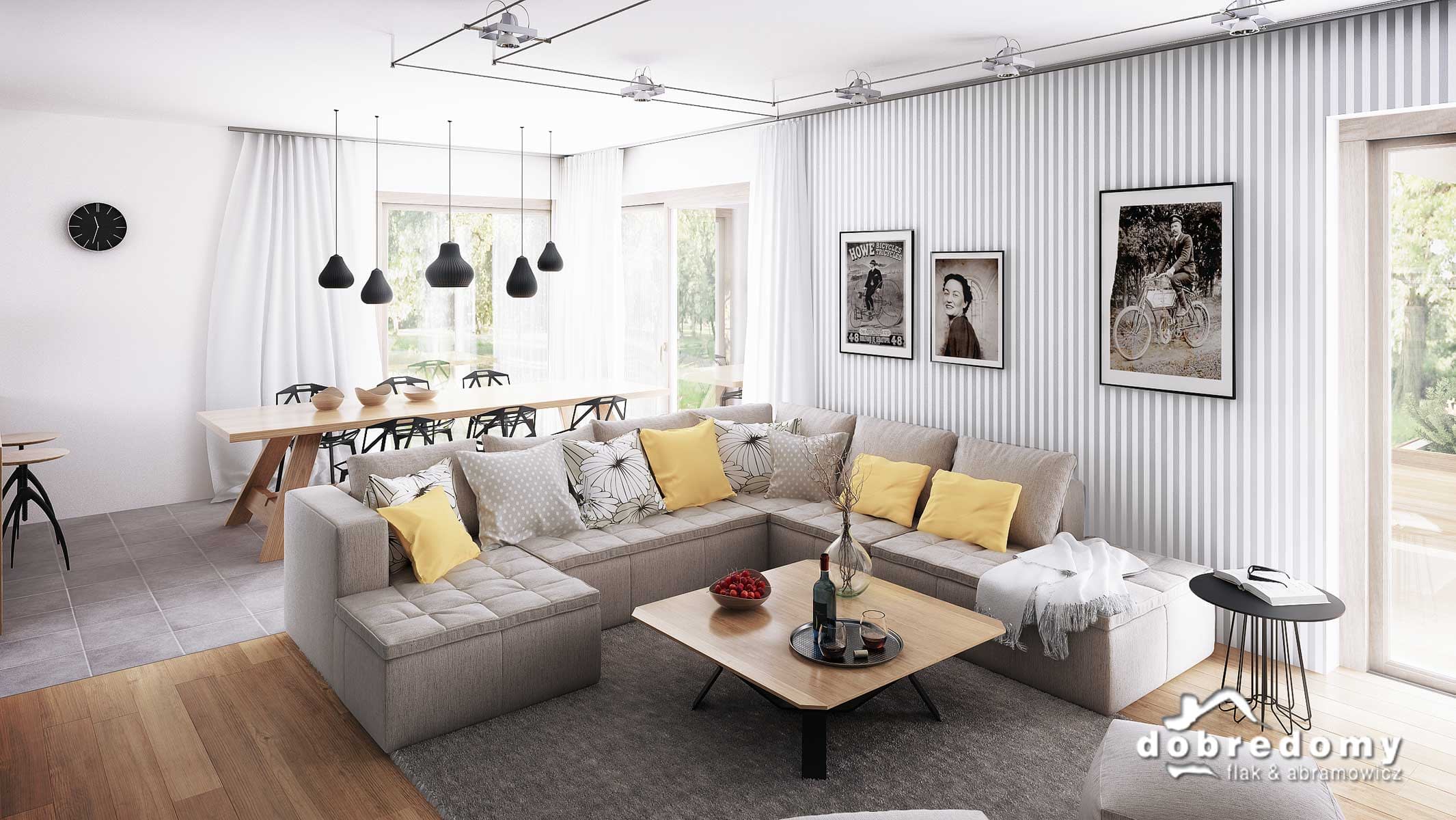 Dom parterowy z dwustanowiskowym garażem, dla 4-osobowej rodziny. Część dzienna to salon połączony z jadalnią i kuchnią. Część prywatna to trzy sypialnie, łazienka i wc. Dodatkowe pomieszczenia w domu to spiżarnia, garderoba i pralnia. Całości dopełnia kotłownia i garaż.
